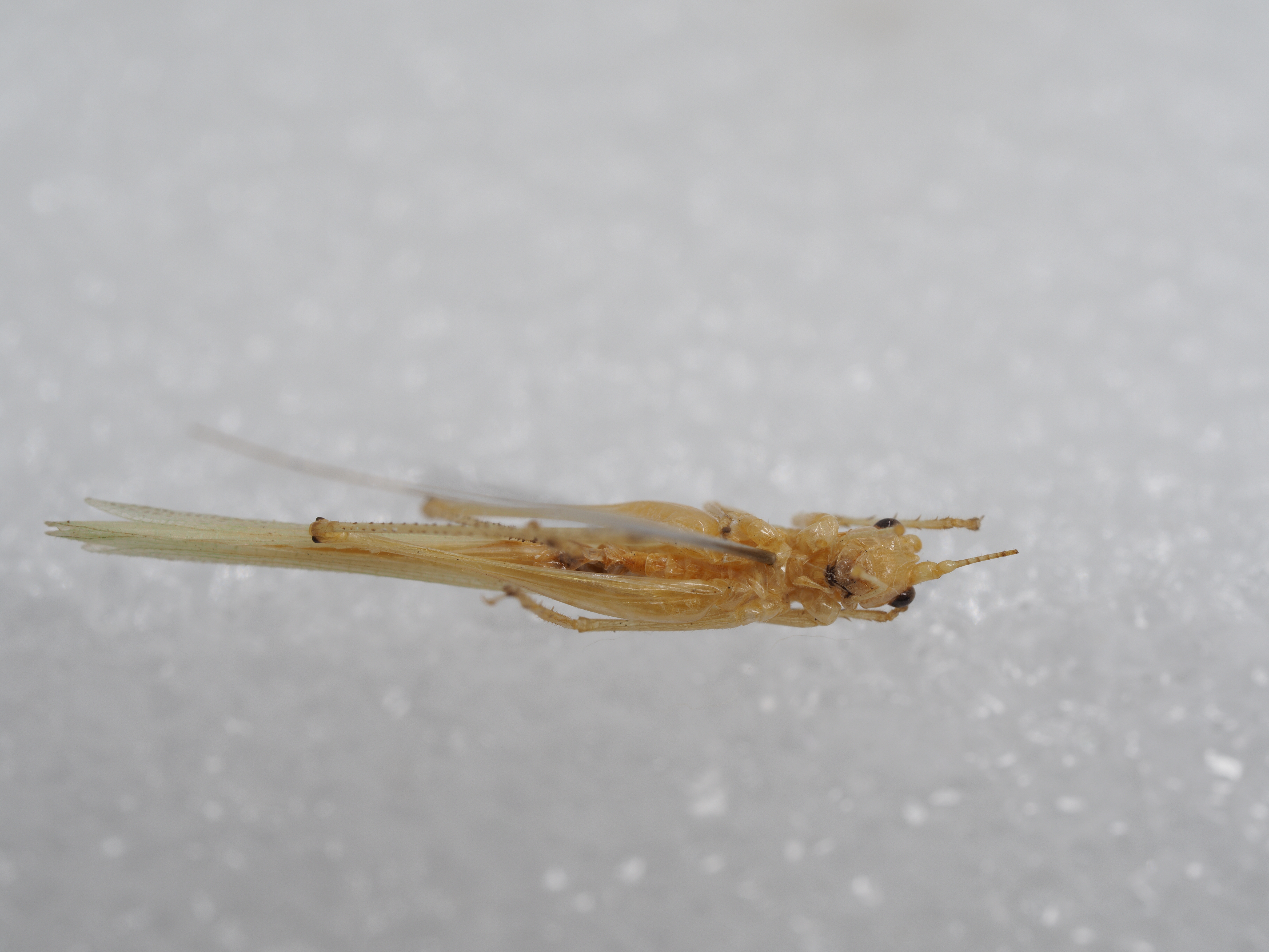 描述:雄性:体小形。头顶圆锥形,端部较钝,背面具沟。复眼圆形,突出。下颚须第5节与第4节约等长;端部稍扩大。前胸背板侧片后缀肩凹明显。前足基节具刺前足胫节腹面内、外刺排列形式为4,5(1,1)型后足胫节背面内援及外缘各具26-30小刺。前翅发达,颇远地超过后足股节端部后翅长于前翅。第10晚节背板后缘中部强向后延长,基部稍侧扁和隆起,其余部分扁平,侧缘下弯,顶端圆截形(图13a)腹面具一较大的突起,前端指向度方(图13b)。尾须基半部朝背应向扩宽,内部稍凹陷、内中部具斜置的附叶三尾须端半部趋细,向内上方弯曲。下生殖板较小,后缘稍凸形腹刺较短粗,位于后缘两侧。