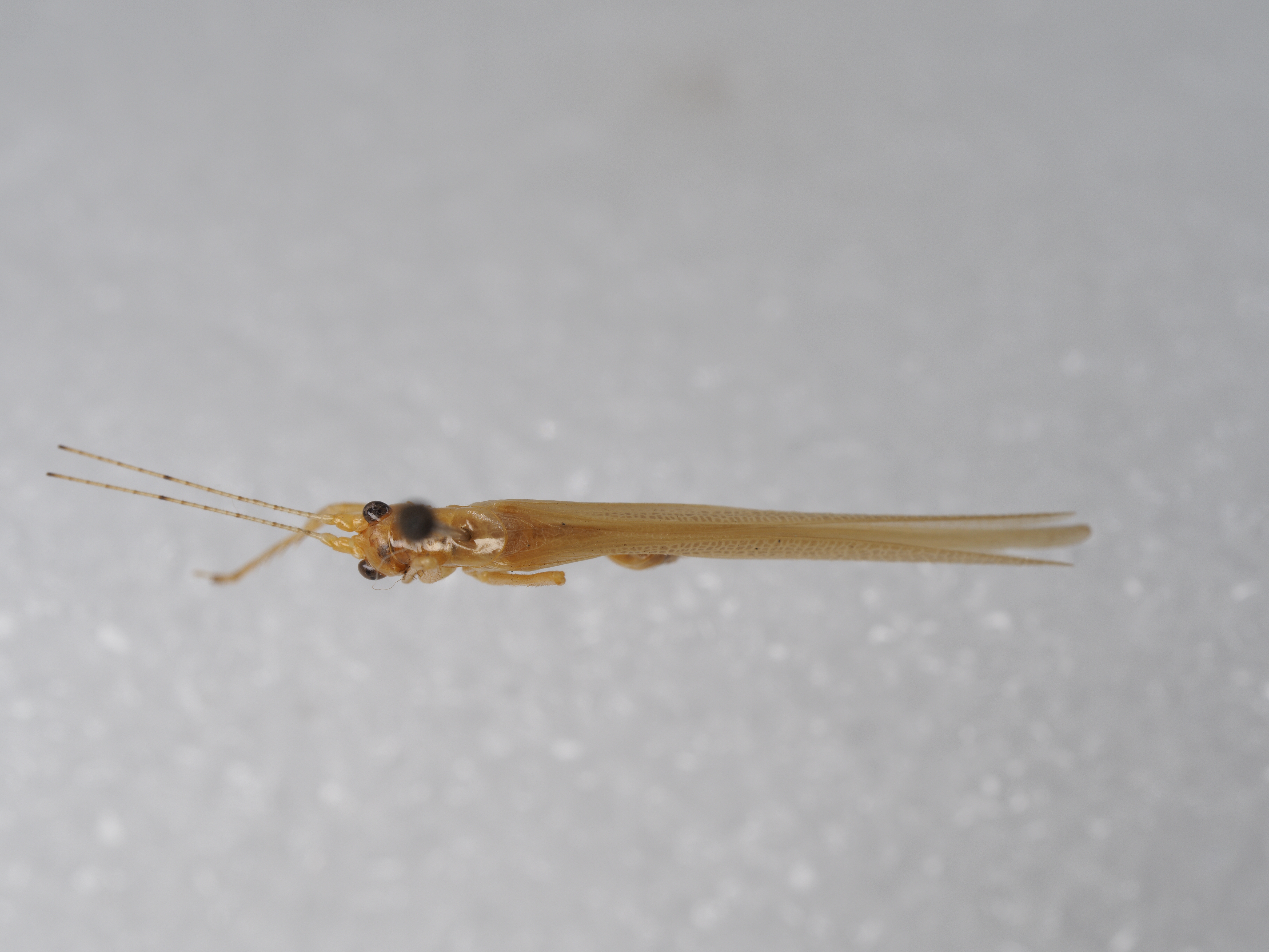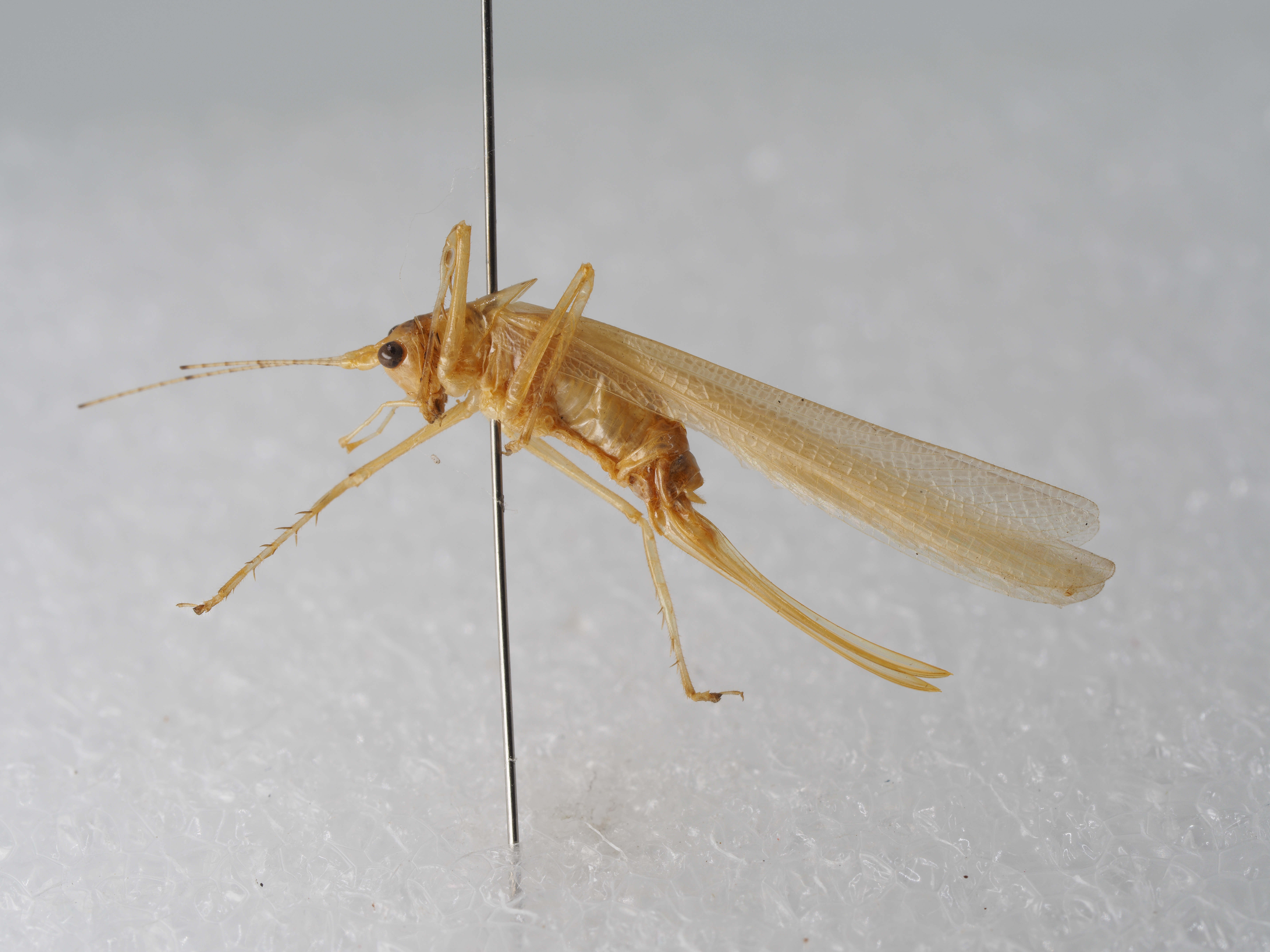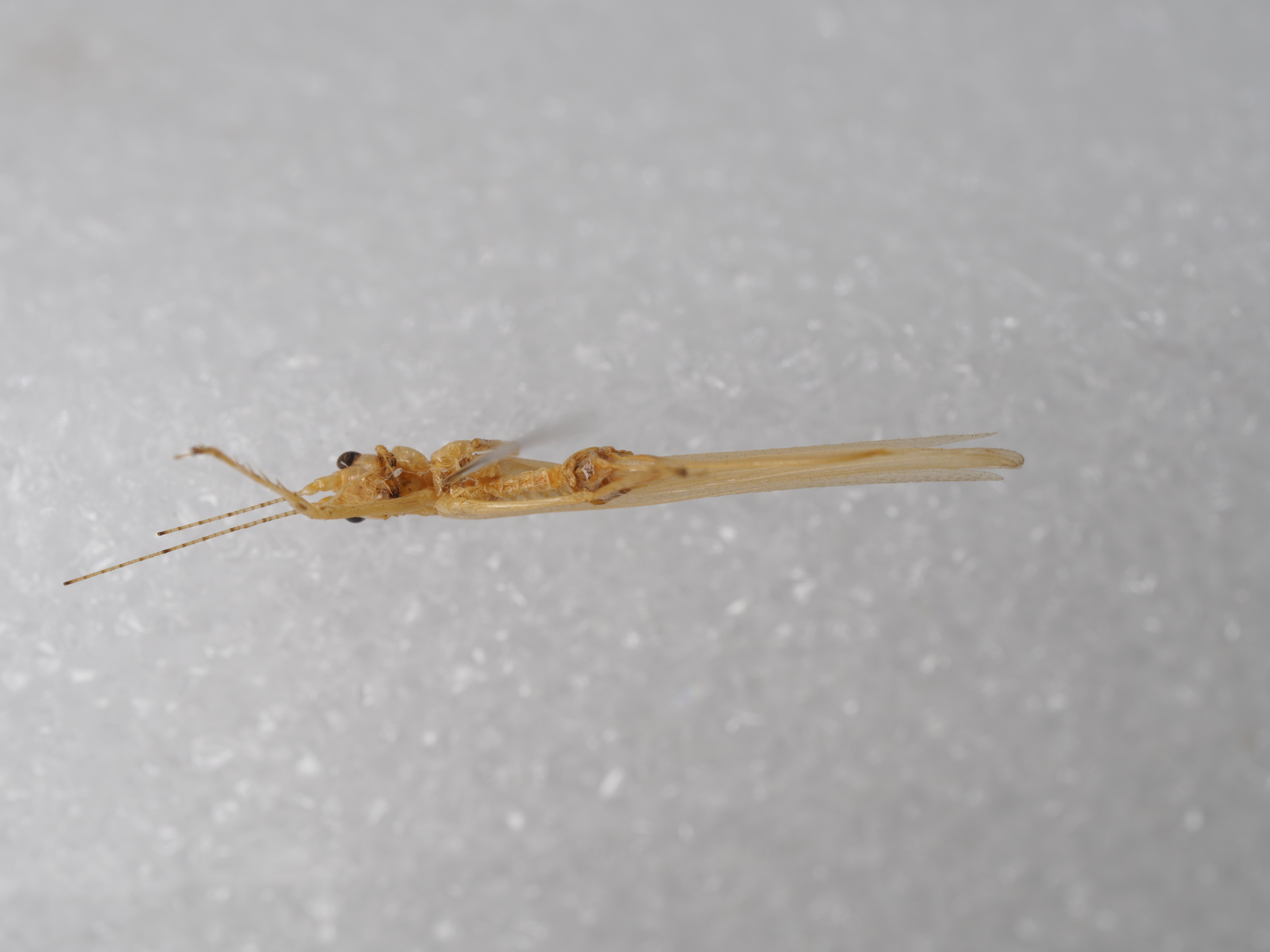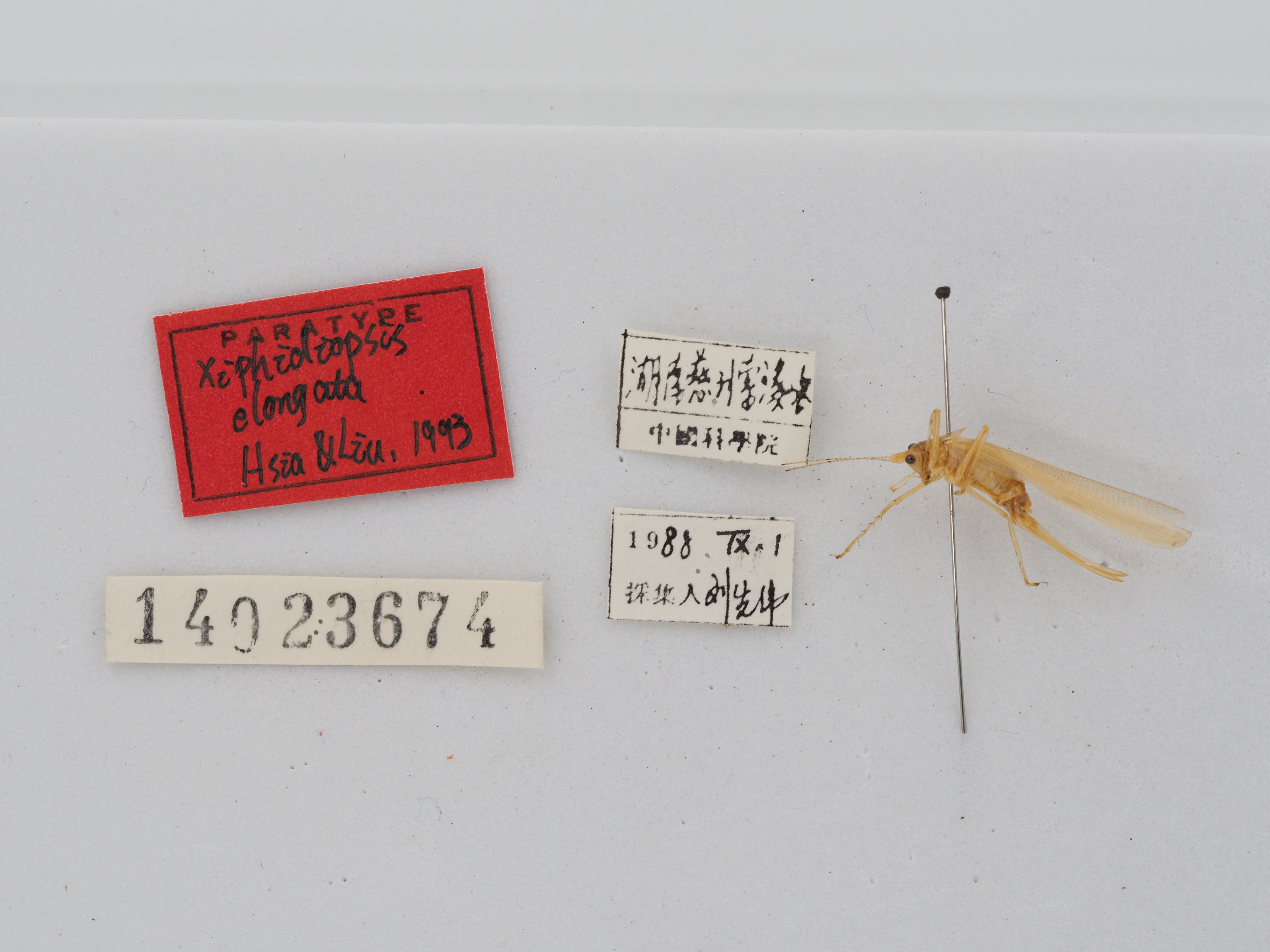描述:雄性:体小形。头顶圆锥形,端部较钝,背面具沟。复眼圆形,突出。下颚须第5节与第4节约等长;端部稍扩大。前胸背板侧片后缀肩凹明显。前足基节具刺前足胫节腹面内、外刺排列形式为4,5(1,1)型后足胫节背面内援及外缘各具26-30小刺。前翅发达,颇远地超过后足股节端部后翅长于前翅。第10晚节背板后缘中部强向后延长,基部稍侧扁和隆起,其余部分扁平,侧缘下弯,顶端圆截形(图13a)腹面具一较大的突起,前端指向度方(图13b)。尾须基半部朝背应向扩宽,内部稍凹陷、内中部具斜置的附叶三尾须端半部趋细,向内上方弯曲。下生殖板较小,后缘稍凸形腹刺较短粗,位于后缘两侧。