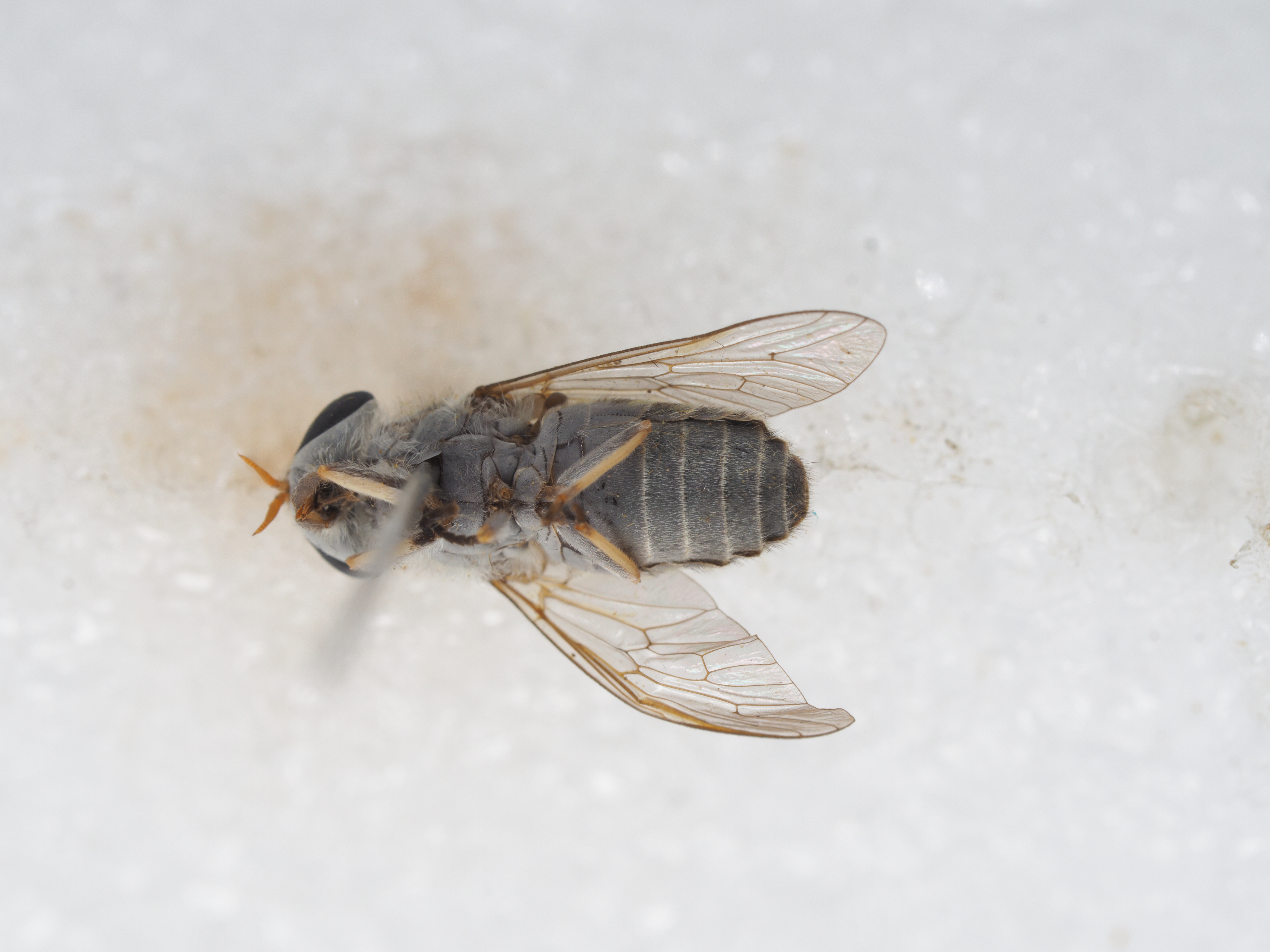腹部背板黑色,着生黄毛夹杂黒毛,背板II-VII具弱的后缘灰白横带,带上着生黄毛,中央部分杂有白毛腹板灰黑色,覆薄白粉,着生白毛,腹板II-VII浅色后缘窄弱,腹板VI-VII中央着生黒毛。