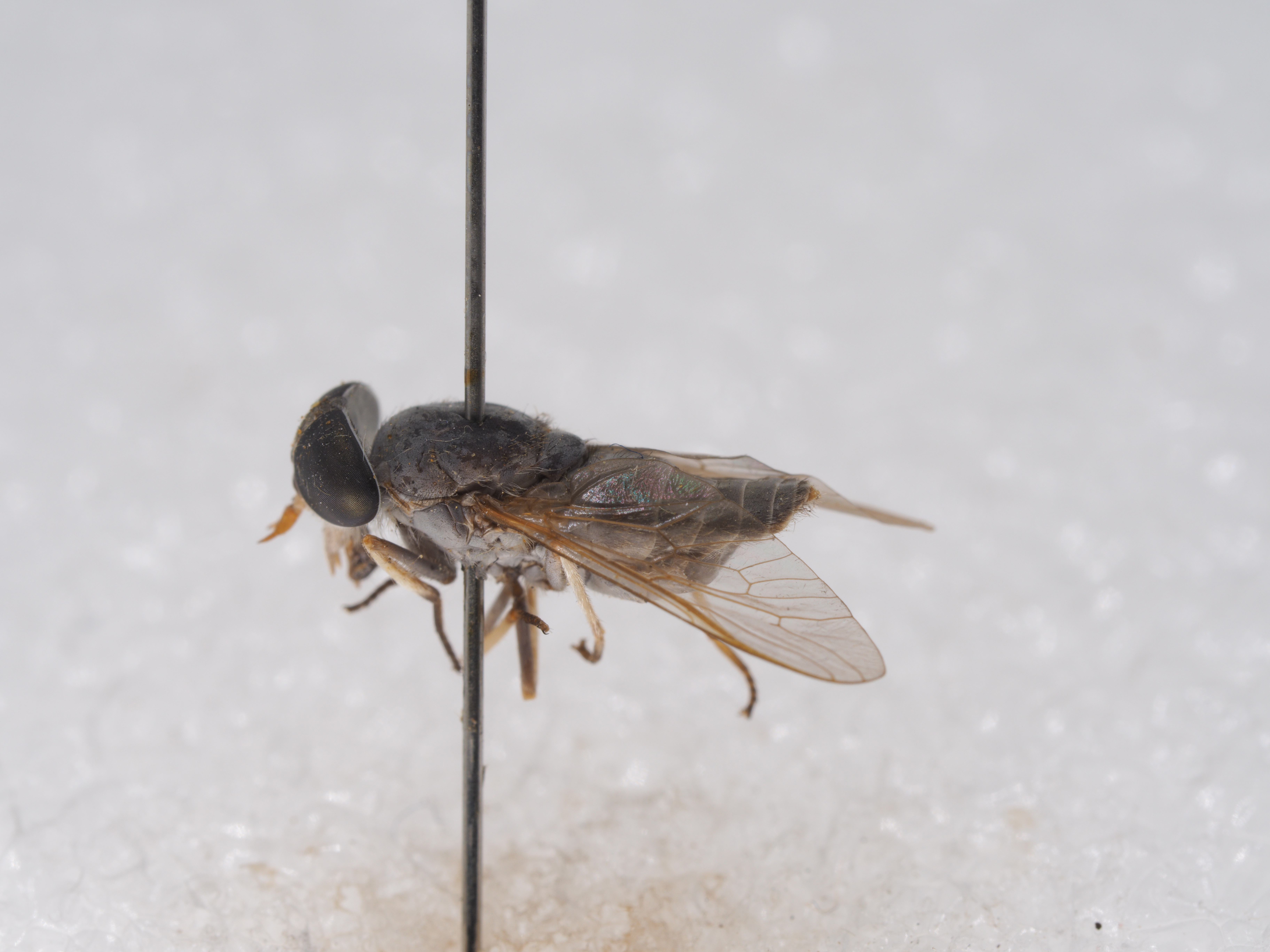 胸部一致灰黒色,背板无横带,着生短黄毛夹杂黑毛,盾片翅后胛后方着生长白毛和黄毛;侧板着生长白毛;足基节色和毛同侧板,股节灰黑色,着生白毛,前胫节基部4/5和中、后胫节大部白色着生白毛,胫节端部及附节黑色着生黑毛;翅透明,R4具短附脉,R5室宽开放;平衡棒深棕色。