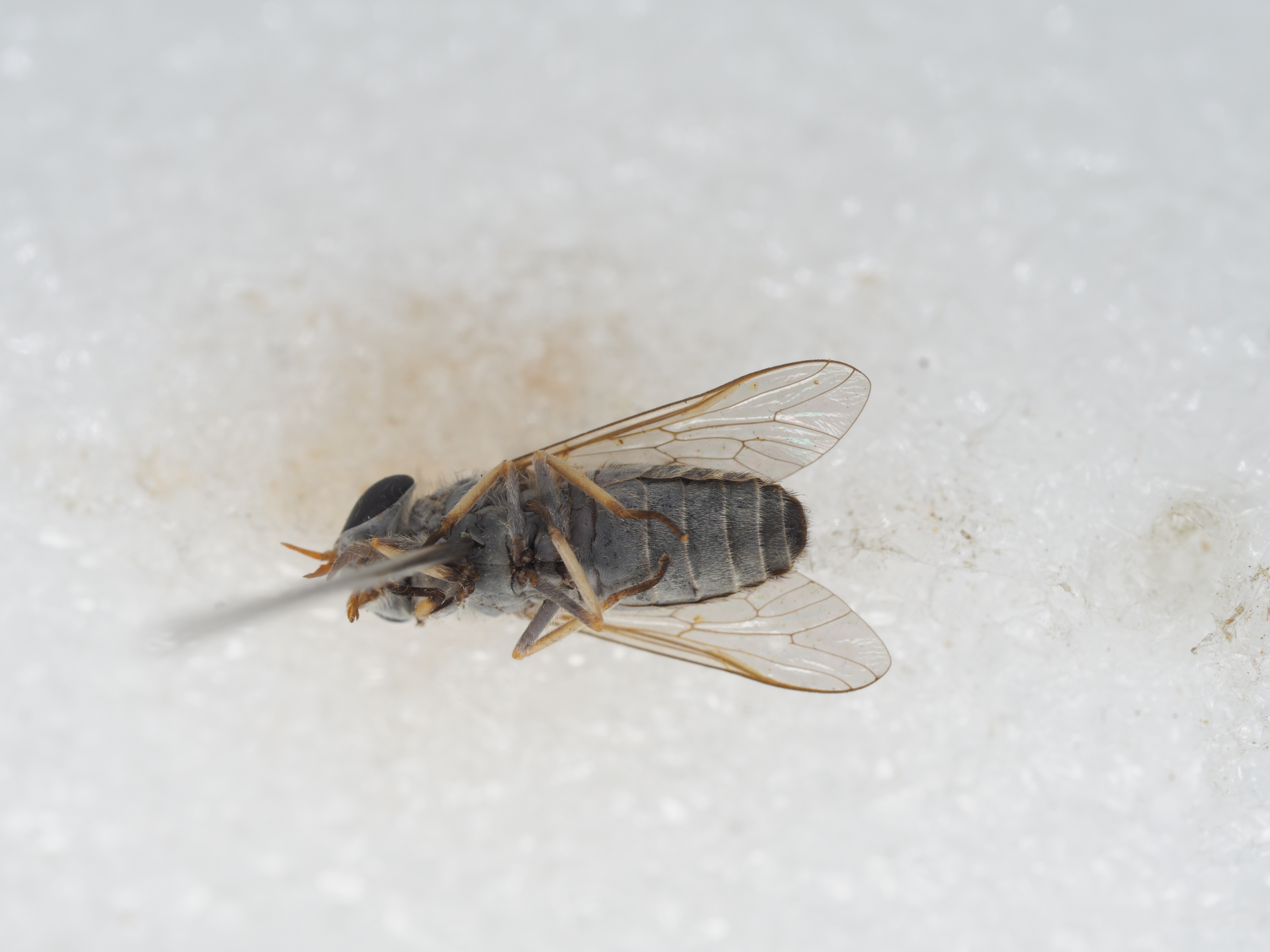 腹部背板黑色,着生黄毛夹杂黒毛,背板II-VII具弱的后缘灰白横带,带上着生黄毛,中央部分杂有白毛腹板灰黑色,覆薄白粉,着生白毛,腹板II-VII浅色后缘窄弱,腹板VI-VII中央着生黒毛。