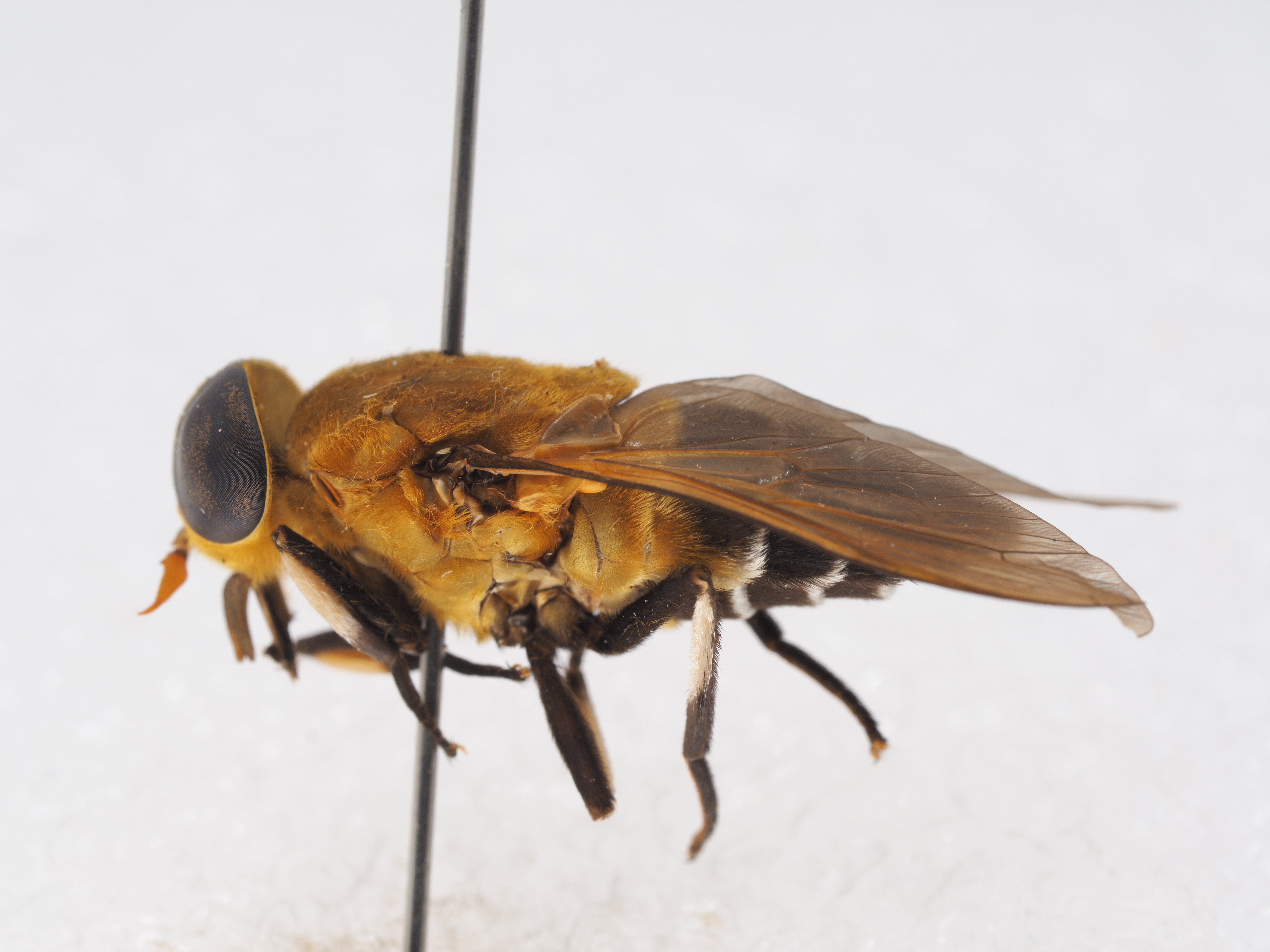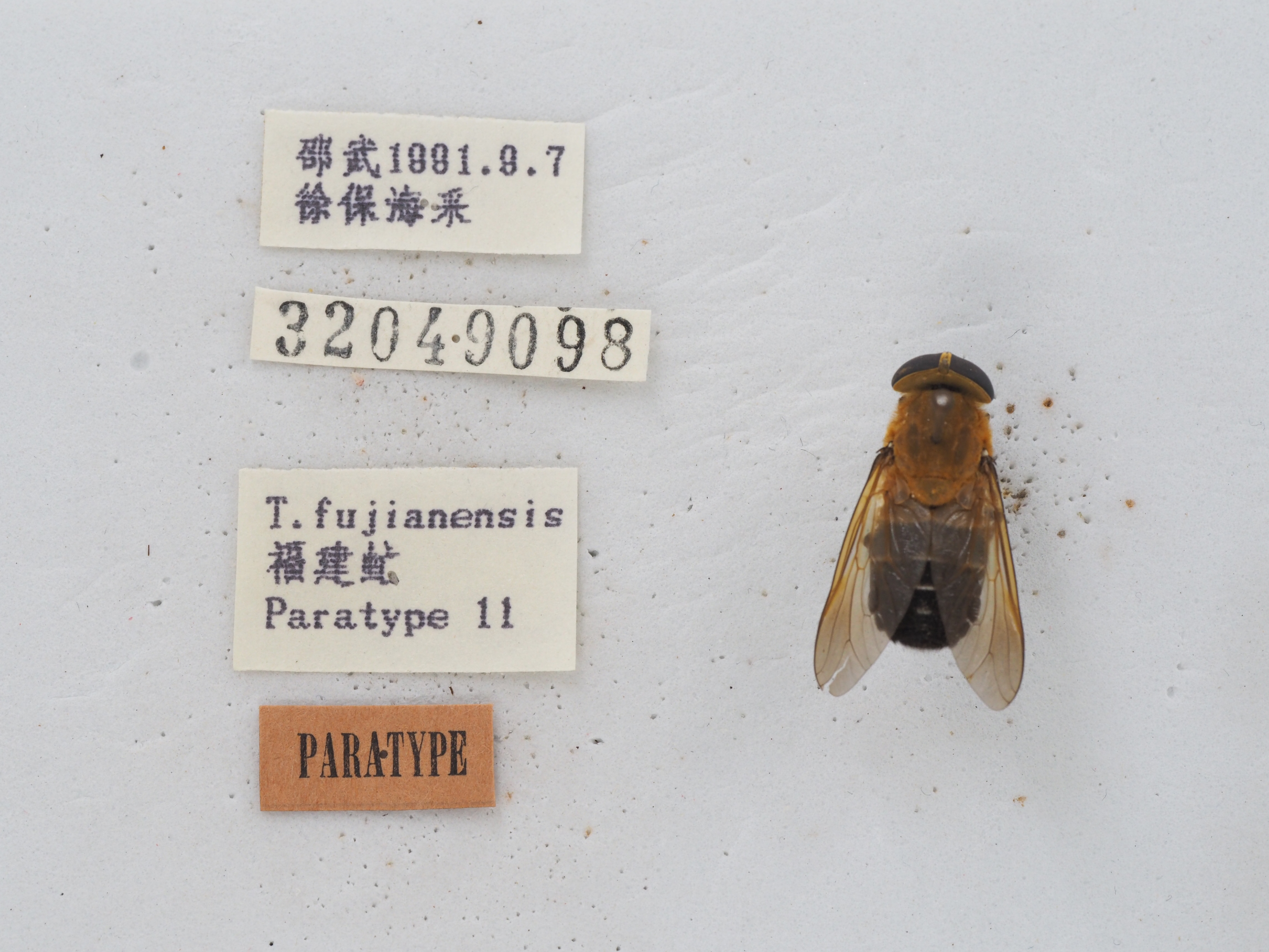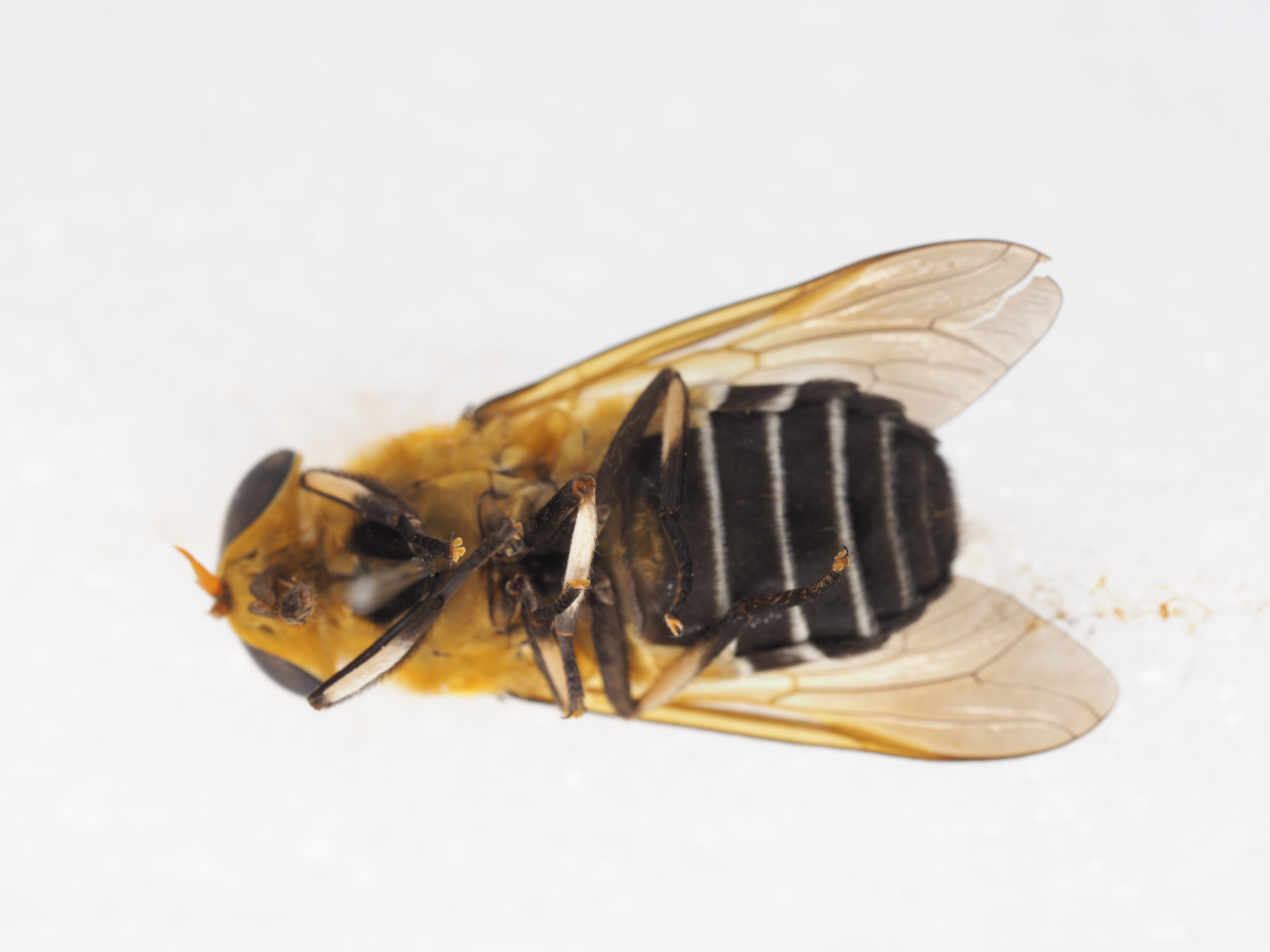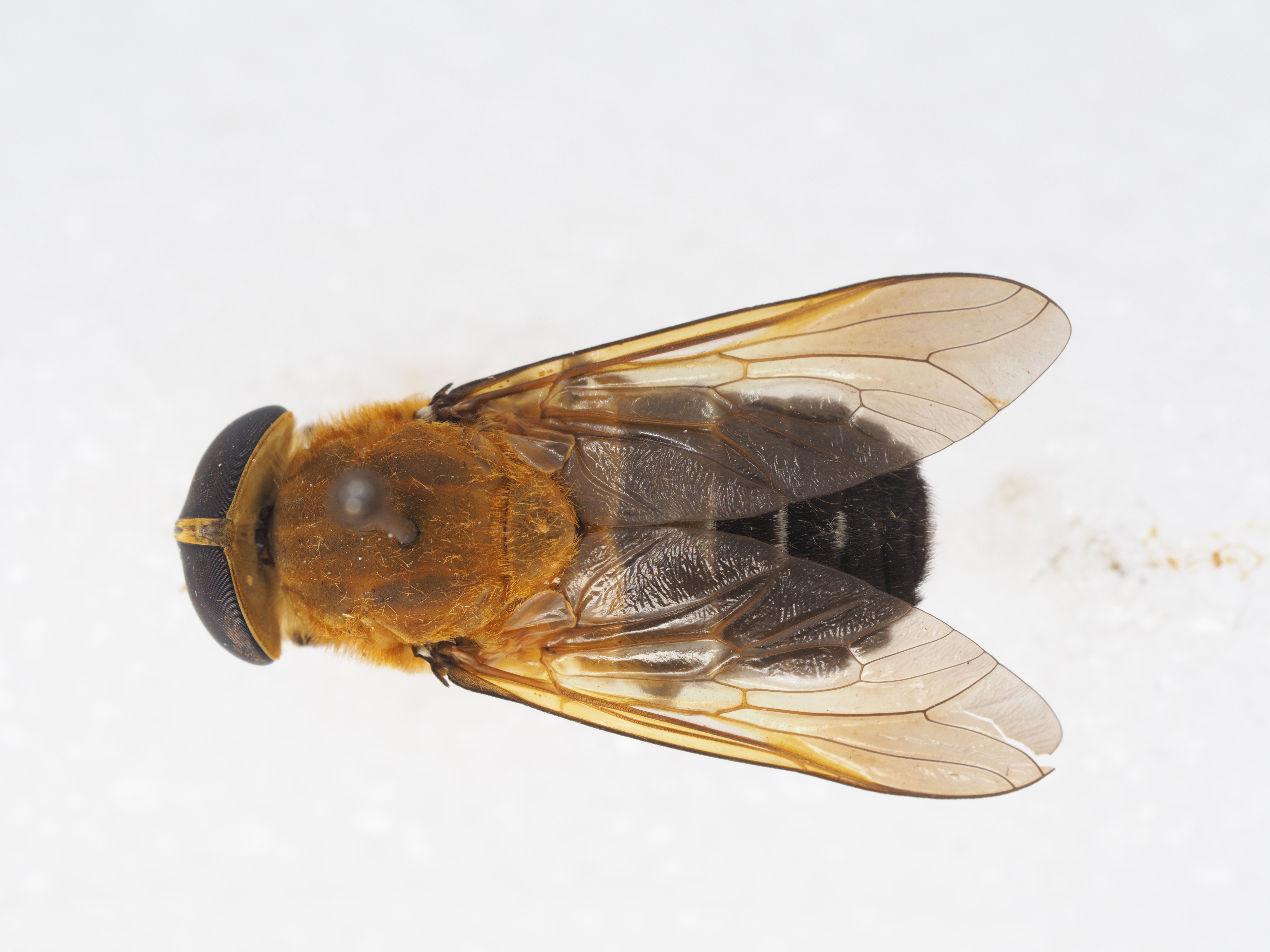 胸部盾片和小盾片金黄色,着生金黄色毛,无明显纵纹;侧板与背板同色,着生金黄色细长毛多足基节、股节和跗节黑色具黑毛,前足基节基部1/2着生金黄色细长毛,端部1/2着生黑色短毛,前、后足胫节基部2/3中足胫节大部白色着生白毛,端部黑色着生黑毛;翅腋瓣棕黄色,着生一撮金黄毛;翅肩鳞着生一撮银白毛,翅面基半棕黄色,端半烟黑色,R 4无附脉,R 5室开放;平衡棒金黄色。