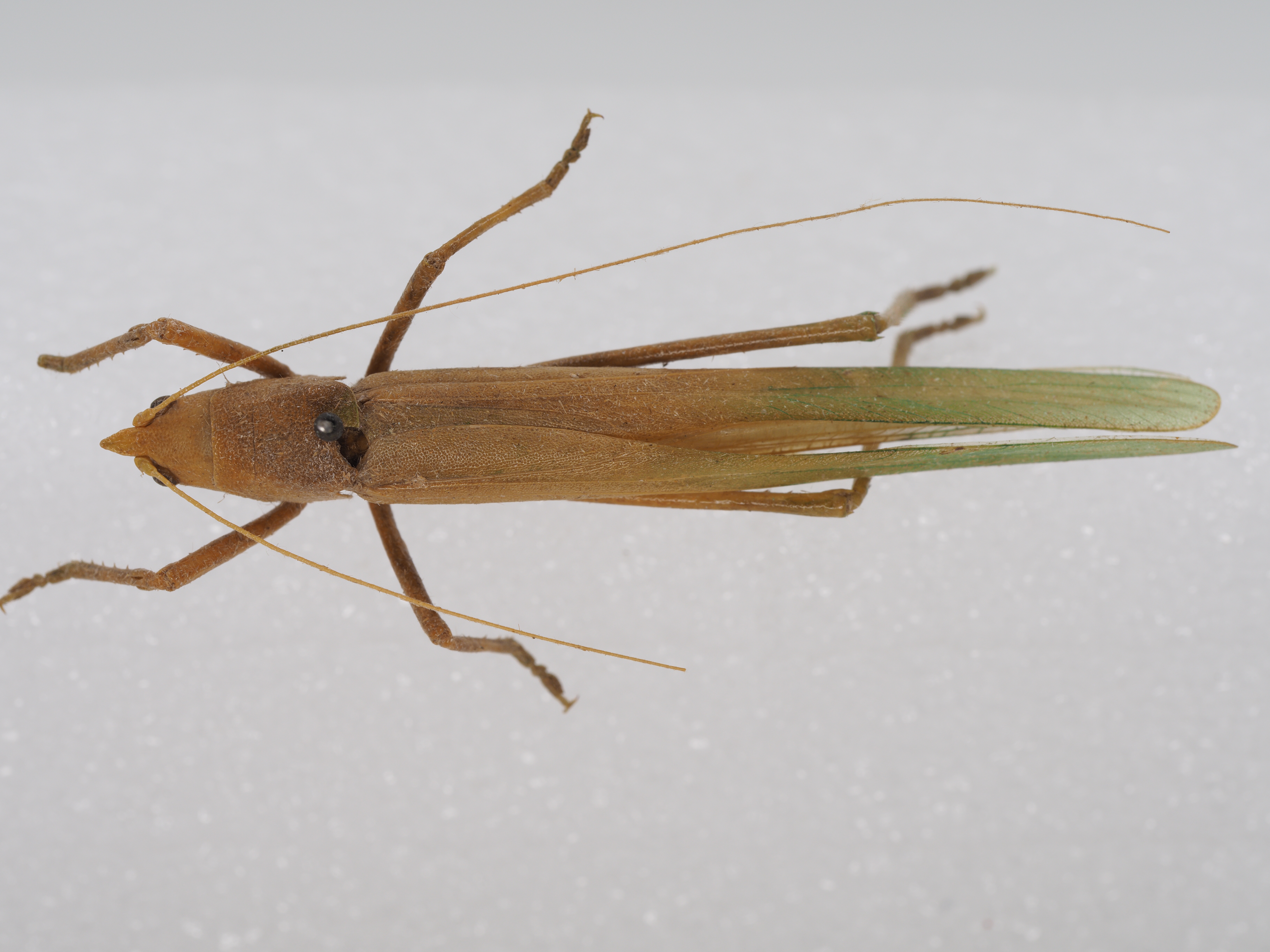 描述:体较小,瘦弱;具明显的刻点。头顶锥形,背面扁平,腹面具中隆线,其长约为复眼纵径的2倍,基部锐齿状突出!颜面强向后倾斜,颜顶具1个较小的瘤状突起。复眼较小,近圆形。前胸背板前、后缘微凹,侧隆线极不明显侧片后缘宽圆形,肩凹较明显。前胸腹板具2刺突,中胸腹板裂叶钝三角形,后胸腹板裂叶近圆形。前翅远超过后足股节端部,前缘基半部稍增粗,端缘网形;后翅几乎等长于前翅。前足基节具刺$前足股节腹面内缘具3个刺,外缘具0~3个刺前足胫节听器为封闭型,腹面具7个内刺和6个外刺。中足股节腹面内缘具0~1个刺,外缘具4~5个刺中足胫节腹面具丁个内刺和8个外刺。后足股节腹面内缘具4~7个刺,外缘约具9~12个刺后足胫节背面内外缘各具10~14个刺。雄性腹部末节背板后缘中央近半圆形内凹仁两侧突出形成狭圆的叶尾须较厚实,侧扁,内表面稍凹陷¥基部具1个强向上弯曲的长突起,尾端具1个微小的内齿;下生殖板长大于宽,后缘平截或微凹,腹突较细长。雌性尾须简单,较短,圆锥形;下生殖板近三角形,端部弧形内凹;产卵瓣短于后足股节,稍向上弯曲,边缘光滑。体绿色。复眼淡褐色前翅绿色,前缘仅基部黄白色;产卵瓣黄绿色。