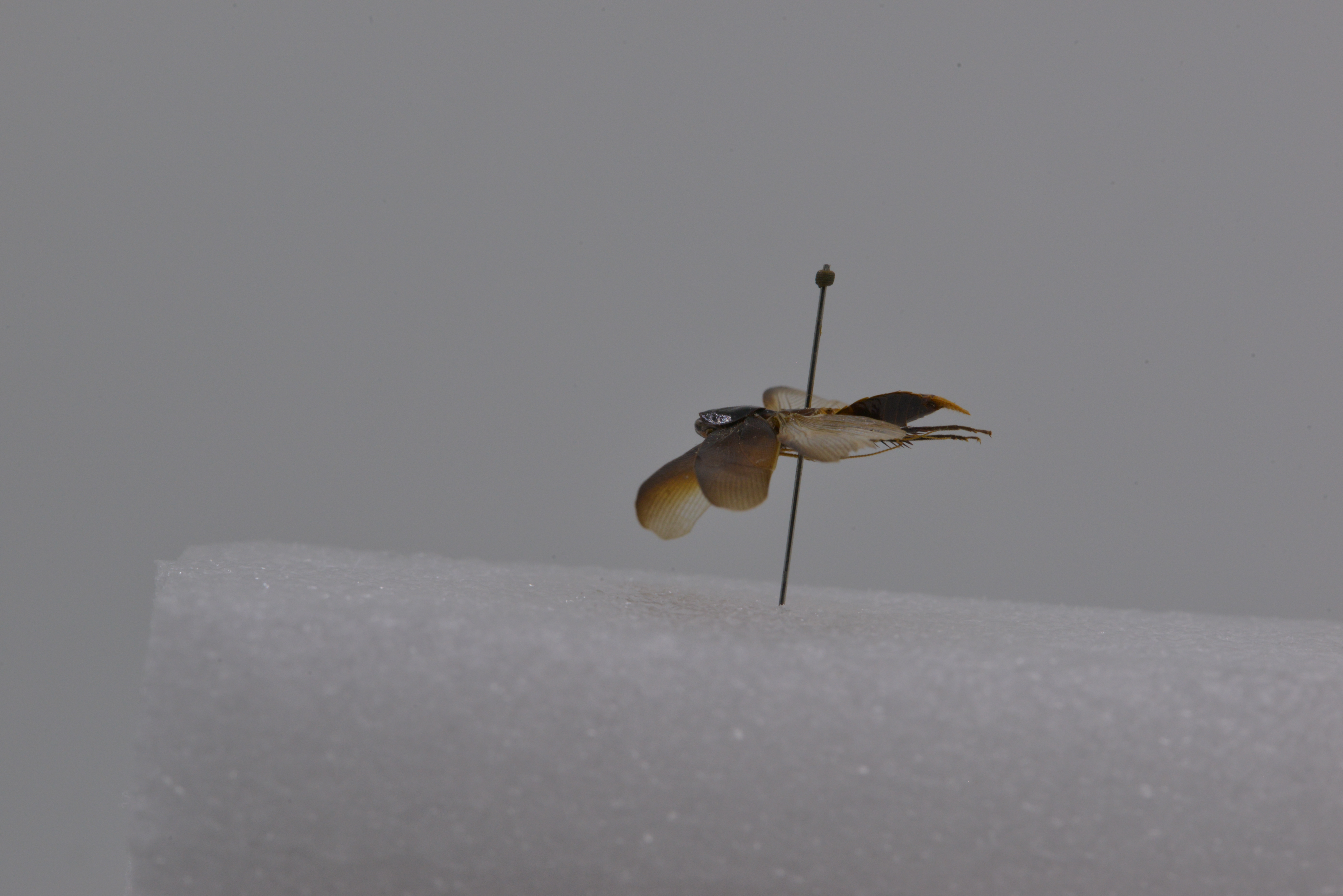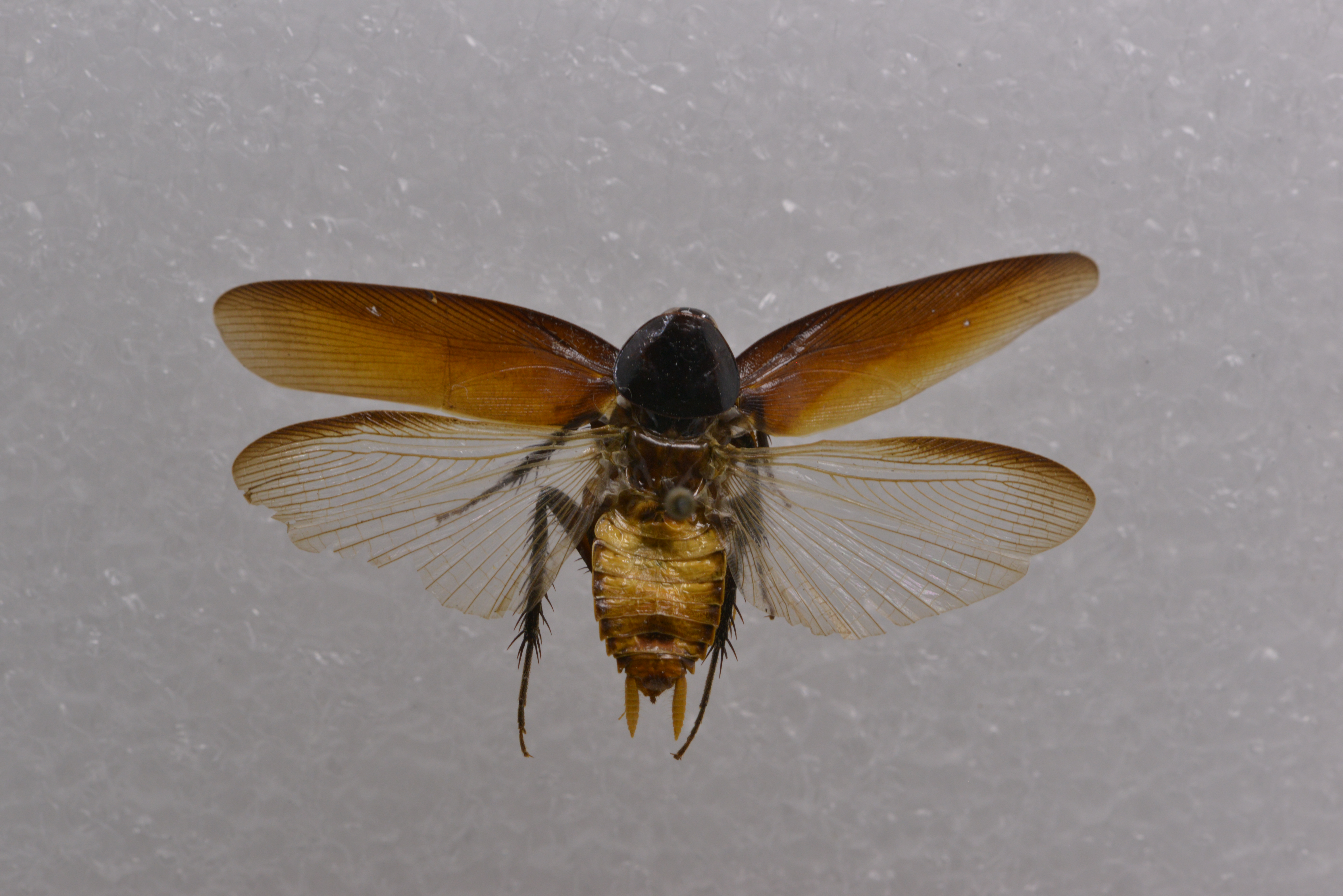 描述:雄性 前足股节前腹缘刺介于A3型。前翅发达,远超过腹端,后翅CuA脉具7根完整的和2根不完整的分枝;端三角小。第1腹节背板中部具毛簇;第7腹节背板中央具毛簇,两侧具凹窝。肛上板对称,横宽,具宽圆的中叶(图115b),肛侧板不对称(图115c)。下生殖板不对称,左侧斜凹,腹突较短,圆柱形,右腹突较粗壮,被细齿(图115d)。外生殖器左阳茎钩状,中阳茎端部具被细齿的膜(图115e)。
