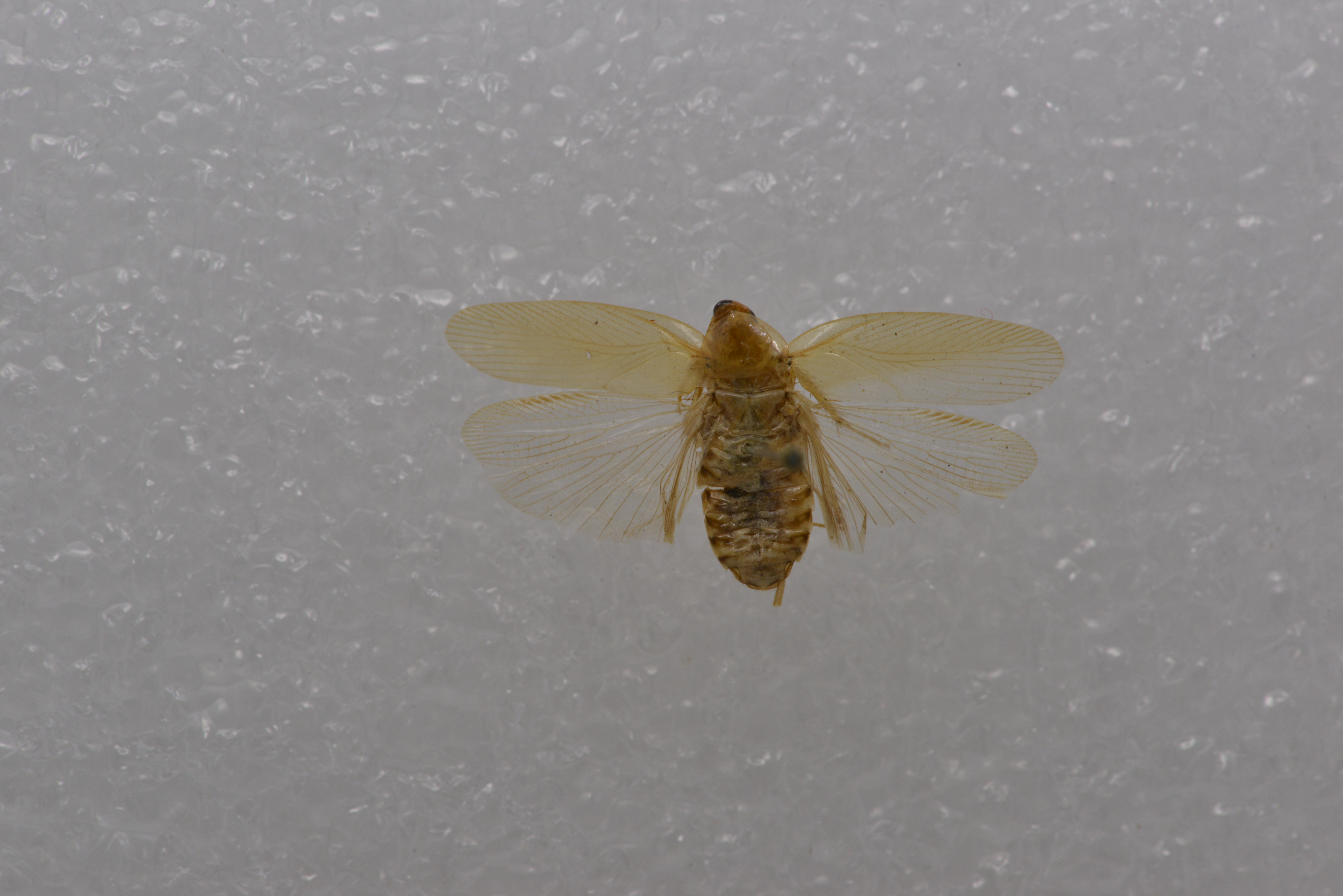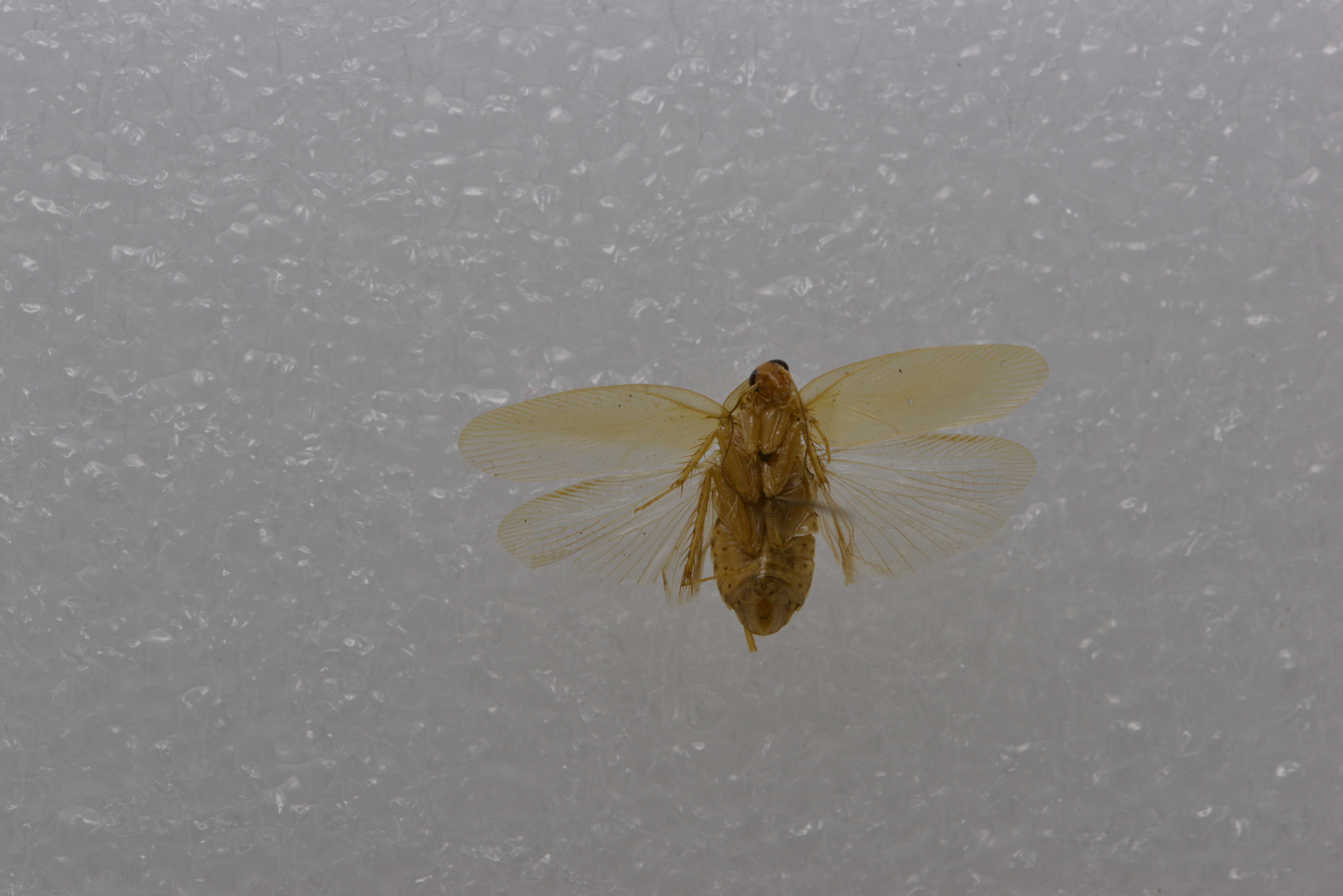 颜色 体淡褐黄色。复眼间具暗色横带。前胸背板中域淡黄色,具褐色斑纹。腹部背面暗褐色,腹面淡黄色。胫节刺窝周缘具褐色。