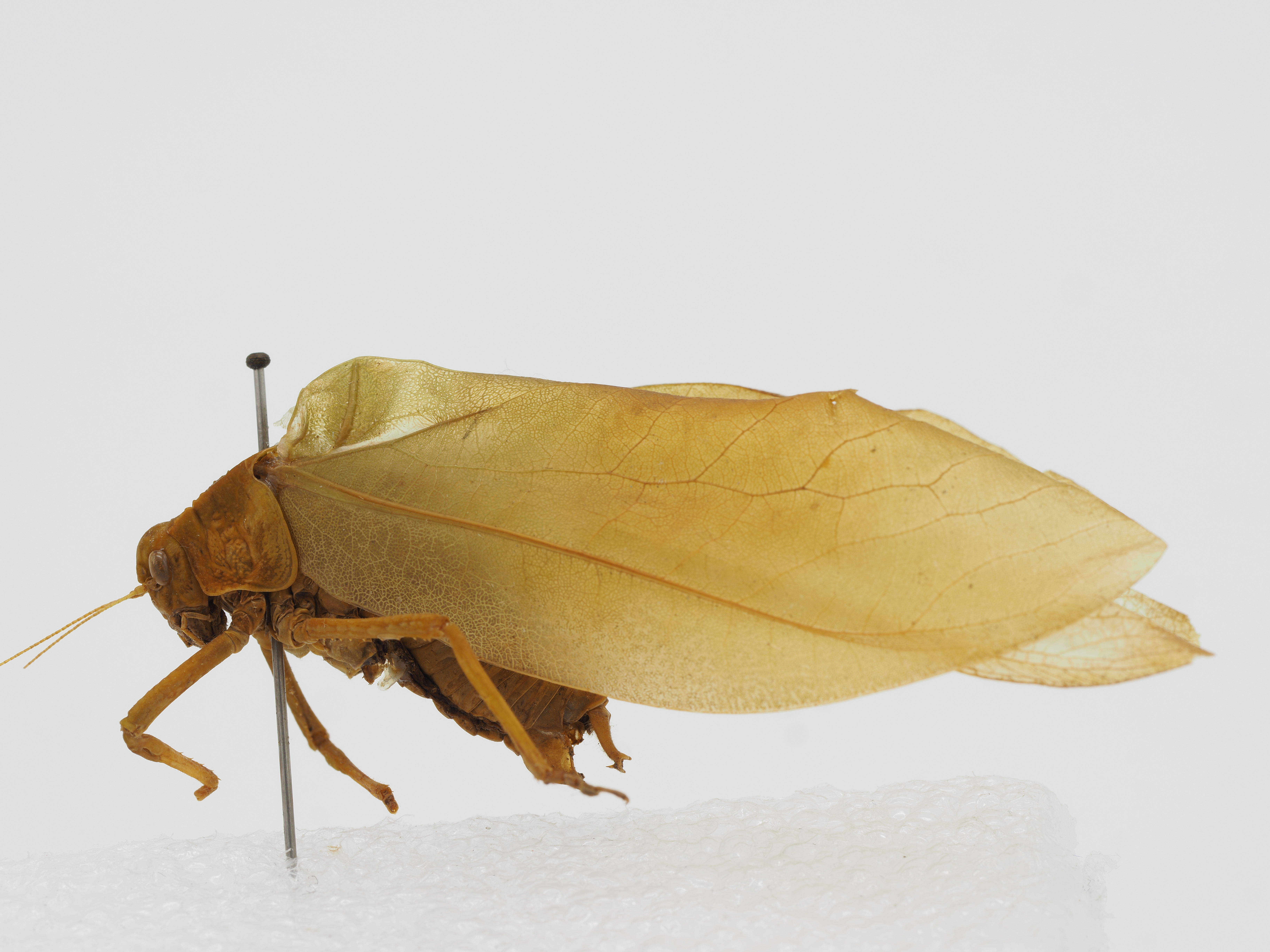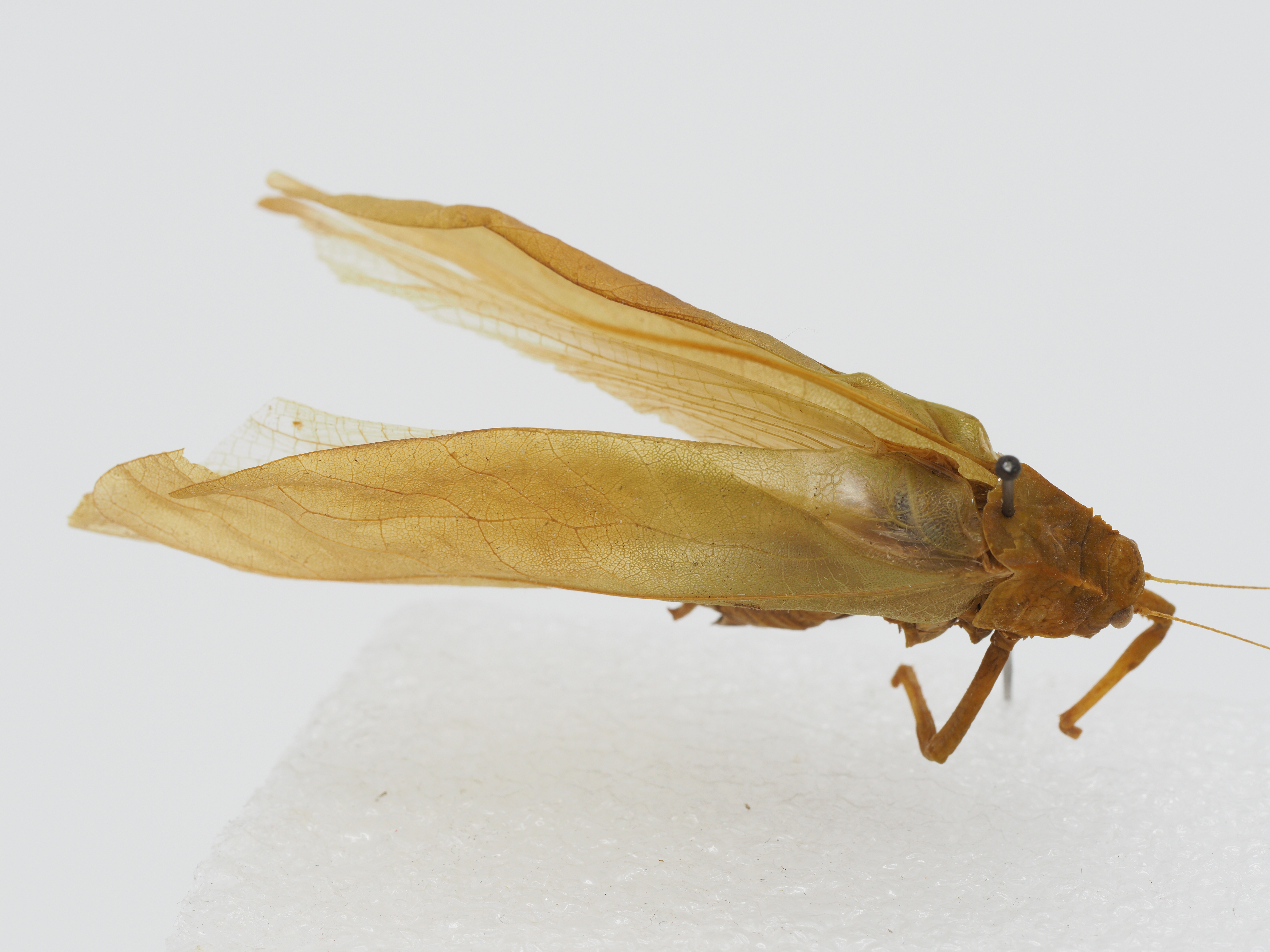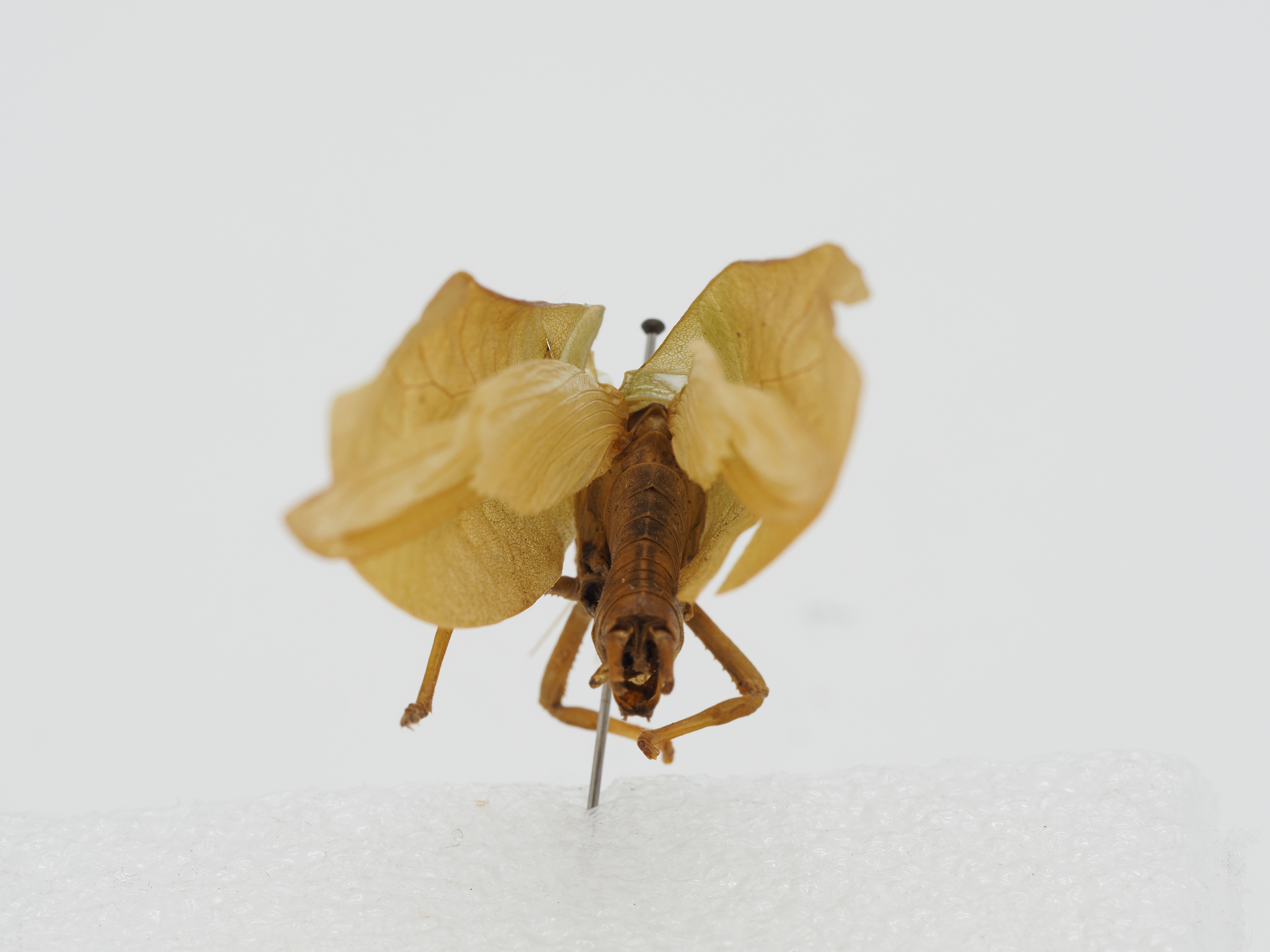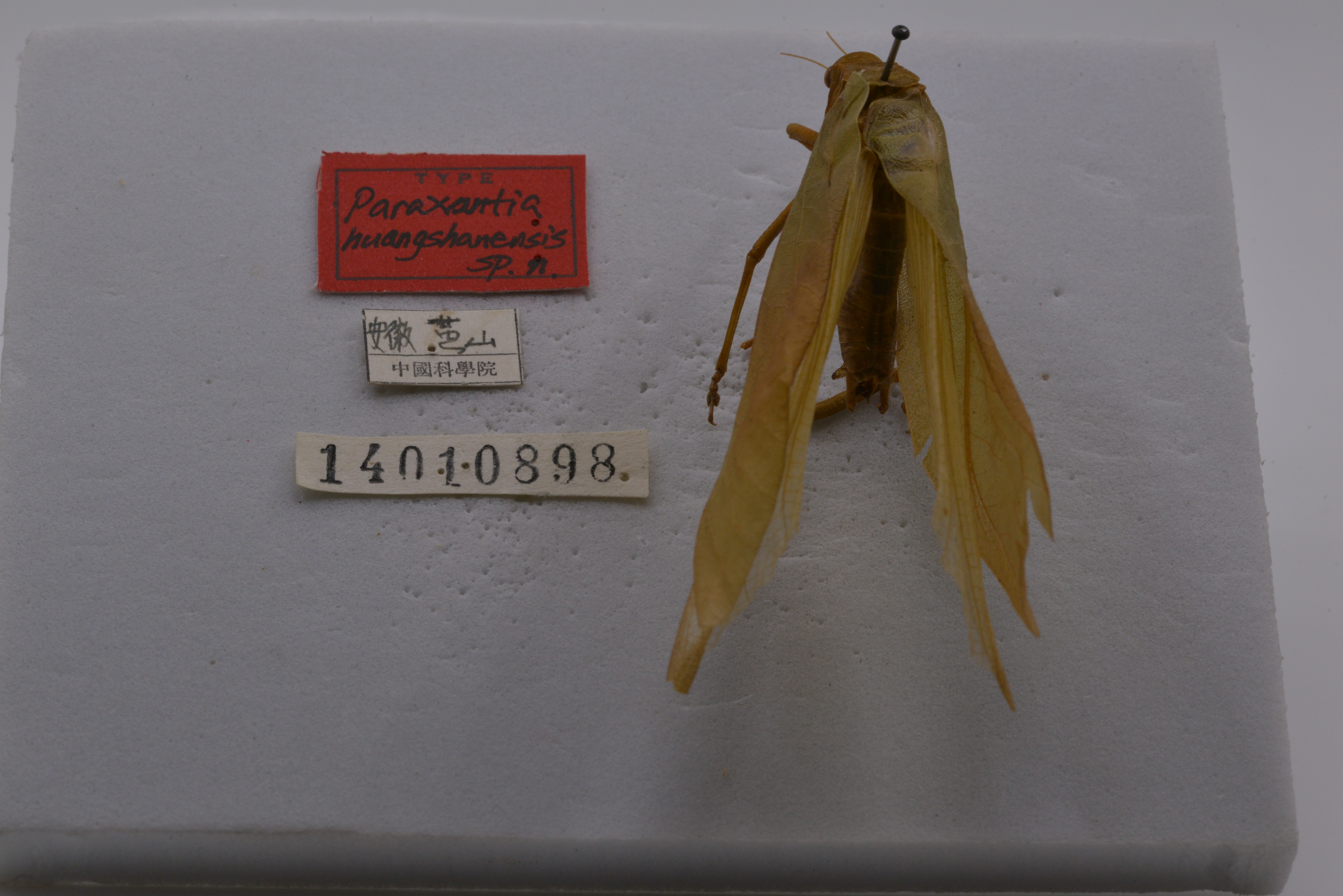 描述:雄性 体大型。头顶强向下倾斜,几乎等宽于触角第1 节宽,顶端微凹,背面具沟,颜顶截形,或多或少呈水平向突出,与头顶几乎接触。复眼垂直向延长,椭圆形,突出。前胸背板前缘内凹,后缘宽圆,侧隆线前部具皱褶,背面平坦,前横沟呈直线,中横沟 “V” 形,后横沟不明显;侧叶较宽大,下缘前半部平,后半部向下倾斜,后缘肩凹明显。前足基节具刺;前足腿节腹面内缘具8 或9 个刺,中足腿节腹面外缘具11 或12 个刺,前足和中足胫节背面无沟,具端距,听器内外两侧均为封闭型。后足腿节腹面内缘具4 个刺,外缘具26-28 个刺;后足胫节背面内外缘各具22-26 个刺。两对翅发达,前翅较宽阔,沿M+Cua 脉具明显的褶角;Sc 脉和R 脉从基部分开,中段几乎毗连,R 脉具4 分支,Rs 脉从R 脉中部之后分出,不分叉;左前翅摩擦发音区最大宽度为6.0mm,外缘呈钝角形突出,Cu2 脉较弯曲,音齿约67 个。后翅长于前翅。中胸和后胸腹板裂叶均为钝角形。第10 腹节背板两侧中部明显缢缩,后缘内凹;肛上板舌形,具纵沟。尾须较直,粗壮,端部分成2 支,下支具尖锐的强折向腹方的内刺。下生殖板宽阔,具中隆线,后缘凹口较宽;腹突略粗短。生殖器革片多齿。雌性未知。体色 通常为绿色,单色。复眼褐色。