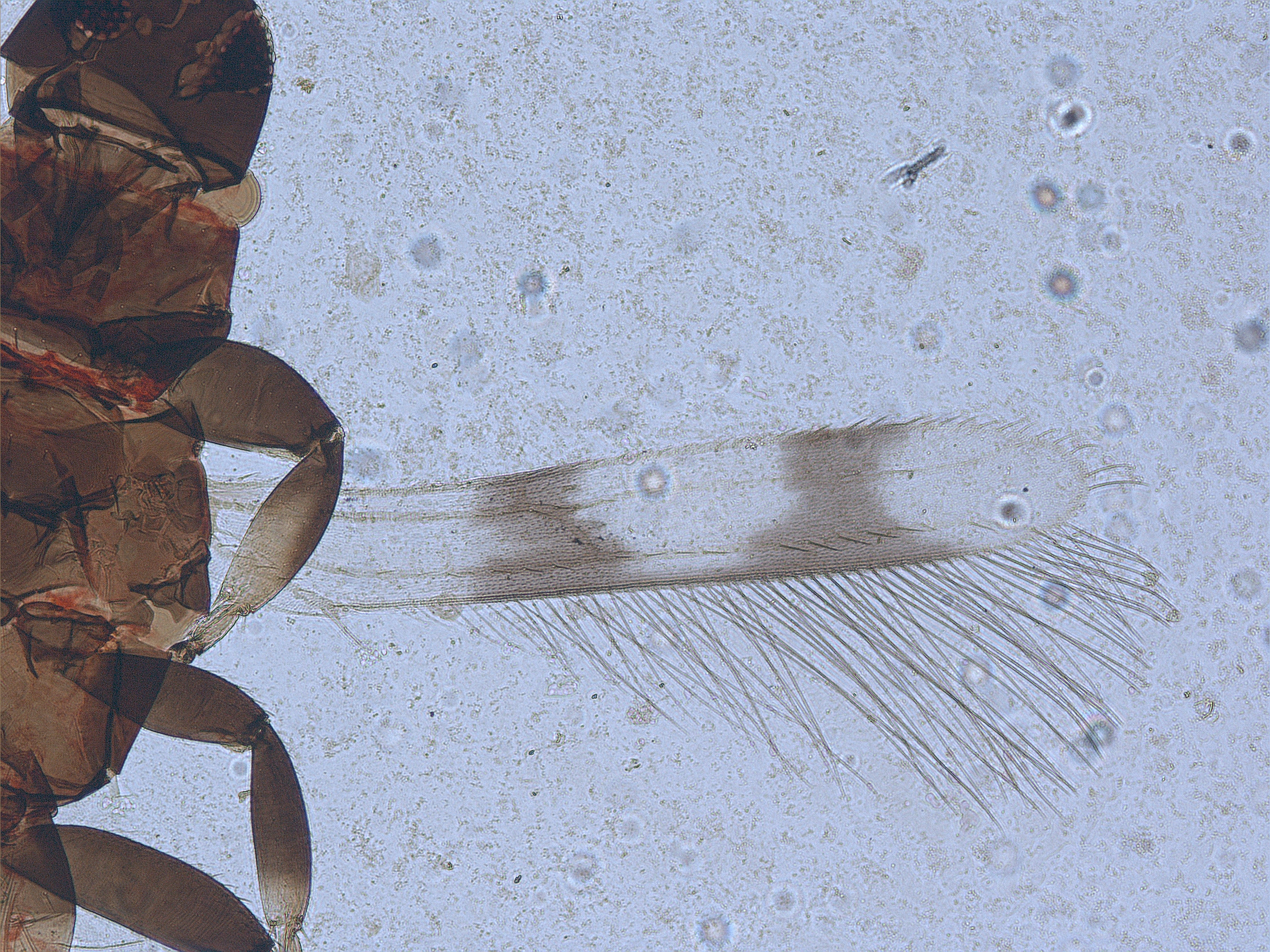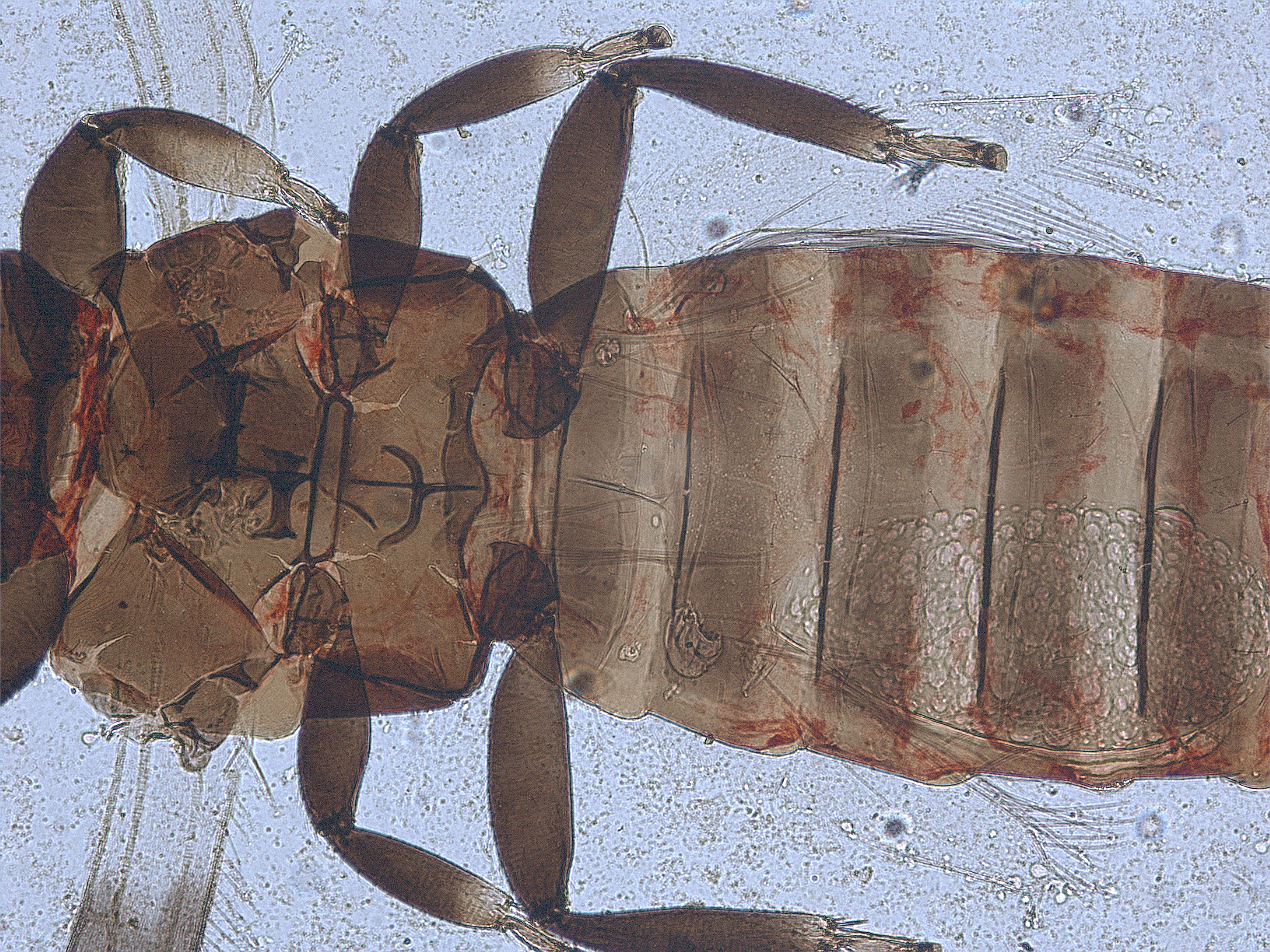 描述:雌虫:体暗棕色,胸部和腹部有红色素;触角节II最端部、节III基半部、节IV基部1/4-1/4黄白色外,其余各部分灰棕色至暗棕色;前翅基部白,有2个后缘相连而较短的暗带,暗带前缘短于后缘;前足胫节浅黄色,但边缘大部分暗,中足胫节端部1/4,后足胫节端部1/7浅白色,各足跗节暗。头短于前胸;触角9节,末端4节短且连接紧密;节III端半部外侧感觉域带状,端部略膨大,为该节长的0.26节IV带状感觉域端部膨大,为该节长的0.67,节V腹面感觉锥基部长约为该节长的1/5,背面长卵形。头背背鬃排列不规则,除前单眼前外侧有2对长鬃外,其余鬃较短,前单眼前鬃5对,单眼间鬃5对,单眼和复眼后鬃8对;下颚须3节,基节粗大,短接甚小,下颚须4节,基节短。前胸背板平滑,包括边缘鬃共约68根背鬃;中胸背板前中部的横交接线纹在两侧向后外方弯曲,后部线纹少而模糊;前外侧鬃除1对较外,尚有2对小鬃;后胸背板前部网纹轻,后部线纹呈弧形向前弯曲,两侧为纵纹;前缘鬃间距明显宽于中胸中后对鬃的间距,前鬃对鬃退化,后中队鬃短小,靠近后缘,1对钟形感觉器位于前中部;后胸小盾片大,边缘色深;中后胸腹板内叉骨均有骨刺;前翅纵脉2条,仅基部横脉清楚,暗带II的横脉几乎消失;后足胫节长为前足胫节的1.6倍。腹部节VIII后缘无梳;节IX和X背板有长鬃,节X除长鬃外,尚有1对较细长鬃,其基部有大而圆的亮毛点;腹板节II后缘鬃3对,远离后缘之前,节III-VII后缘鬃各4对,其中两侧的2对位于后缘之前;节VII后缘鬃之前的2对副鬃较小。