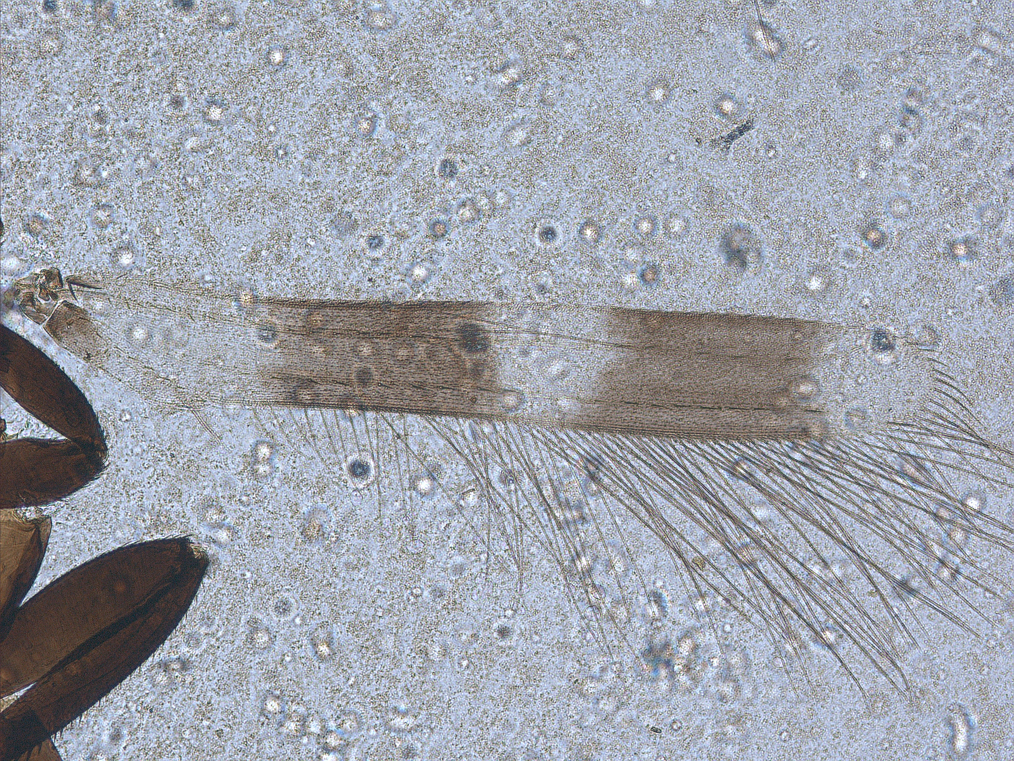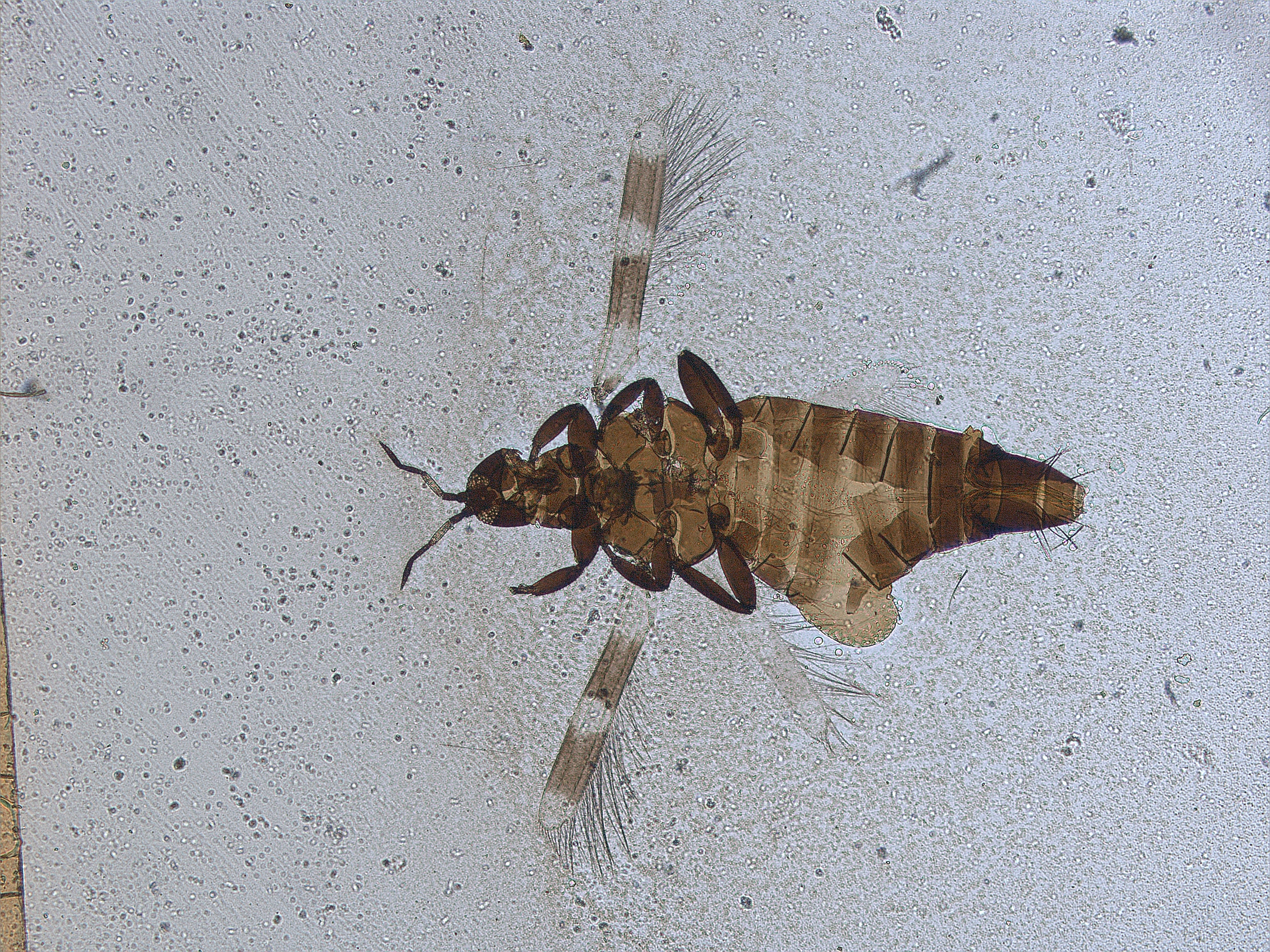 描述:雌虫:体及足暗棕色;触角节II端部及III浅黄色,其余各节棕色;前翅基色白,翅瓣基部1/4暗棕,近中部和近端部有互相分离的二个暗带;后翅灰白色。头长于前胸;节IV感觉域端部膨大而略弯;节V腹面有1个感觉锥,其基部较长,背面观似长卵形感觉域;头背短鬃约22对。后胸背板前部有几条横线,中部网纹横向而向前弯曲,侧区及后外侧区由纵线构成;前足前跗节有钩齿。腹部节IX和X背板有长鬃;腹板节II后缘鬃3对,节III-VII后缘鬃4对;节VII中对后缘鬃间距大于内II对后缘鬃与中对鬃的间距;2对副鬃分别在中对后缘鬃与内II对后缘鬃之间,或其一对在后缘中对鬃内侧,另一对在后缘中对鬃与内II对鬃之间。