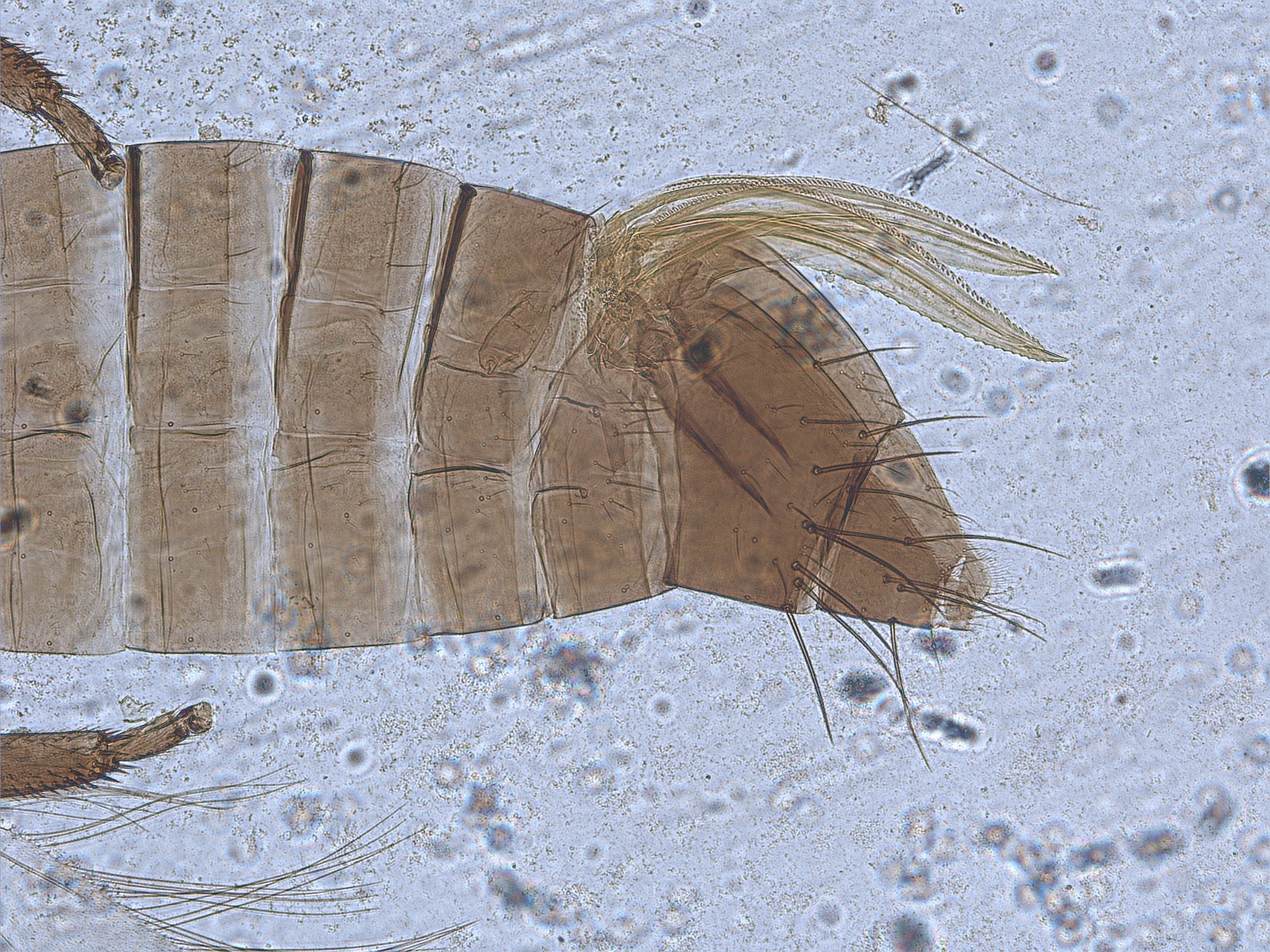 描述:雌虫:体及足暗棕色;触角节II端部及III浅黄色,其余各节棕色;前翅基色白,翅瓣基部1/4暗棕,近中部和近端部有互相分离的二个暗带;后翅灰白色。头长于前胸;节IV感觉域端部膨大而略弯;节V腹面有1个感觉锥,其基部较长,背面观似长卵形感觉域;头背短鬃约22对。后胸背板前部有几条横线,中部网纹横向而向前弯曲,侧区及后外侧区由纵线构成;前足前跗节有钩齿。腹部节IX和X背板有长鬃;腹板节II后缘鬃3对,节III-VII后缘鬃4对;节VII中对后缘鬃间距大于内II对后缘鬃与中对鬃的间距;2对副鬃分别在中对后缘鬃与内II对后缘鬃之间,或其一对在后缘中对鬃内侧,另一对在后缘中对鬃与内II对鬃之间。