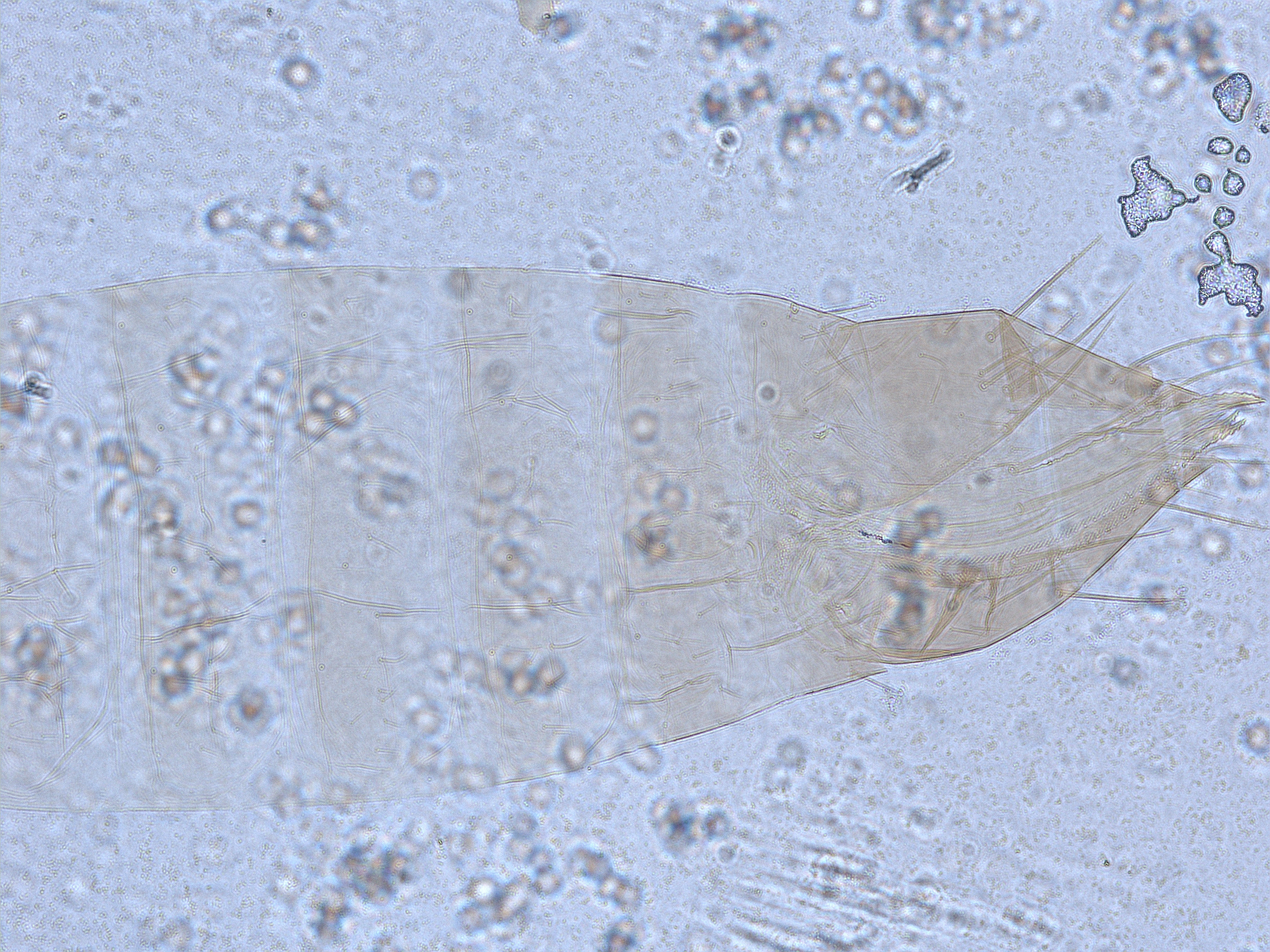 描述:雌虫:体及足暗棕色;触角节II端部及III浅黄色,其余各节棕色;前翅基色白,翅瓣基部1/4暗棕,近中部和近端部有互相分离的二个暗带;后翅灰白色。头长于前胸;节IV感觉域端部膨大而略弯;节V腹面有1个感觉锥,其基部较长,背面观似长卵形感觉域;头背短鬃约22对。后胸背板前部有几条横线,中部网纹横向而向前弯曲,侧区及后外侧区由纵线构成;前足前跗节有钩齿。腹部节IX和X背板有长鬃;腹板节II后缘鬃3对,节III-VII后缘鬃4对;节VII中对后缘鬃间距大于内II对后缘鬃与中对鬃的间距;2对副鬃分别在中对后缘鬃与内II对后缘鬃之间,或其一对在后缘中对鬃内侧,另一对在后缘中对鬃与内II对鬃之间。
