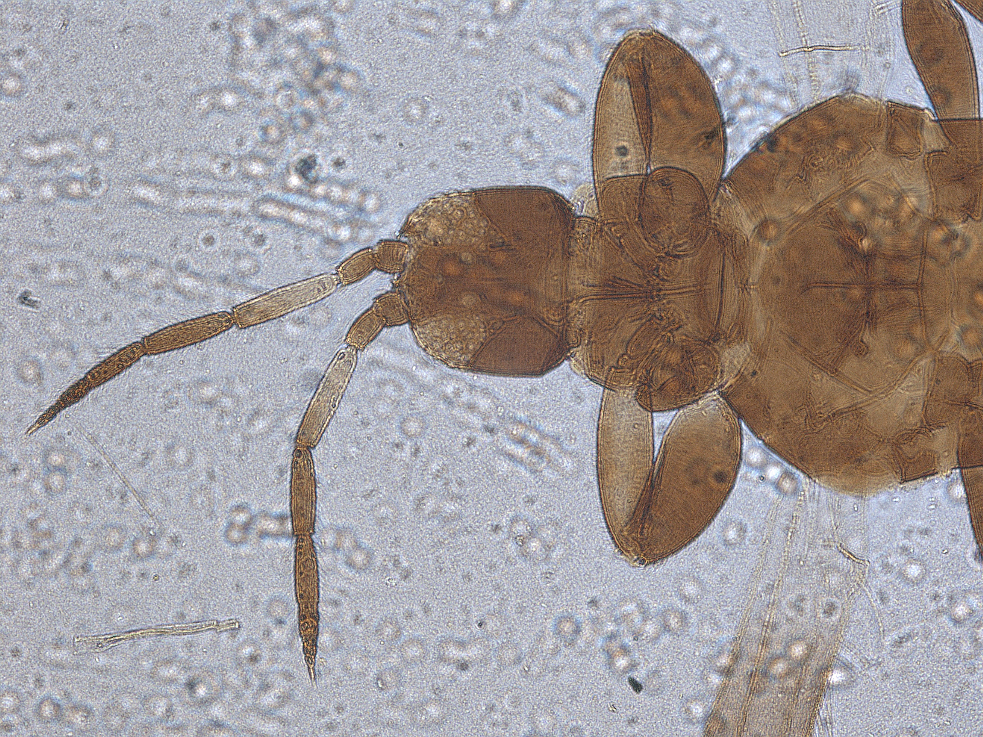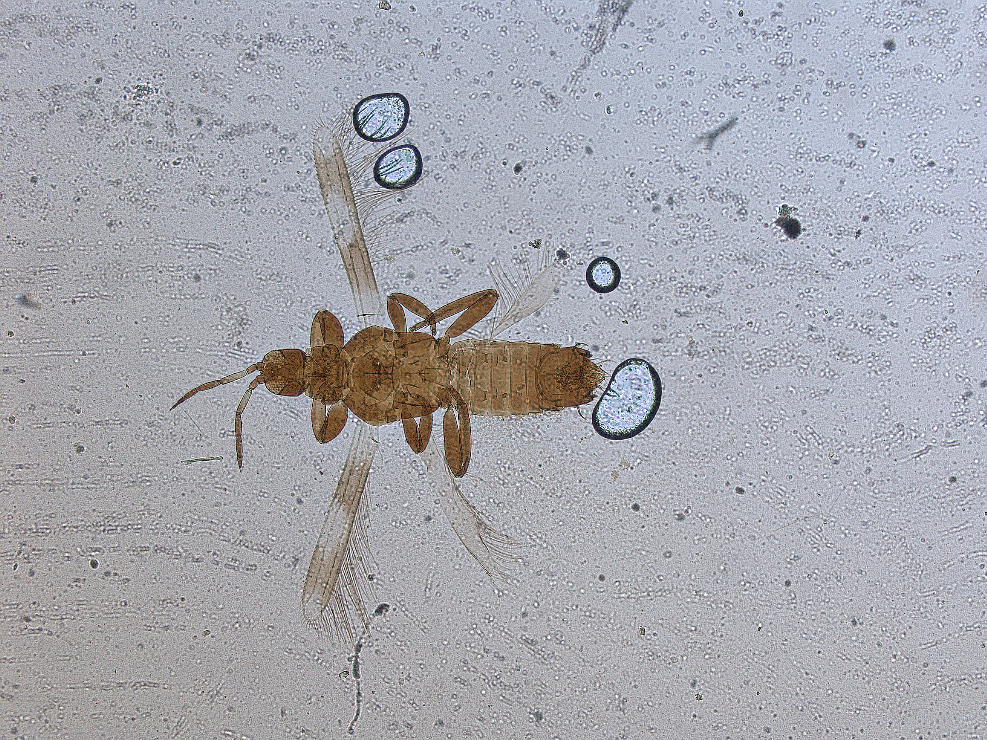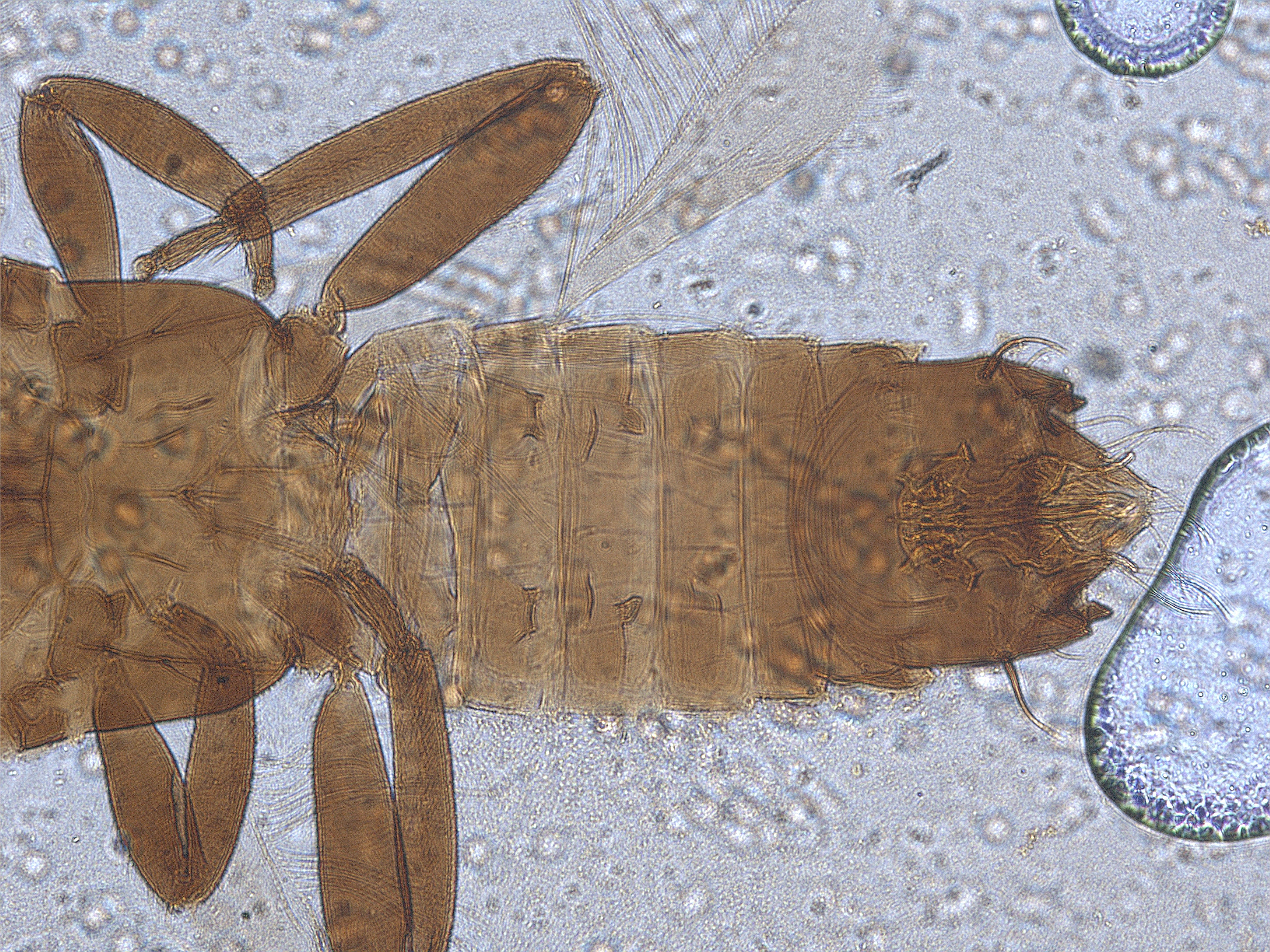 描述:雄虫:体暗棕色;除前足胫节略浅或边缘大部分暗外,各足棕色;触角节II端部、节III浅黄色,其余均棕色;前翅翅瓣无色,前翅基部约2/9中部约2/9,端部约1/9色浅,其余均呈暗带,二横带后缘有狭暗带相连,其宽约为后缘与后脉间距的一般;后翅无色;腹部节II-VIII浅棕色。头略长于前胸;触角节III带状感觉域约为该节长的0.3,节IV带状感觉域两端膨大,约为该节长的0.4,节V腹面感觉锥基部小,背面观长卵形。头顶共有短鬃约29对。后胸背板除前部有几条横向网纹、两侧有纵线纹外,大部分花纹为纵向网纹;前翅长为中部宽的7.5倍;前足跗节II有钩齿。腹部节I两侧有宽棕纵条;节III-VI背板后缘两侧有性状不同的棕色骨化板,节V骨化板之前及节VII前缘两侧有棕色骨化线;节IX两侧各有1根粗鬃,其后有雄性抱钳;中部骨化板上有2对鬃,在侧部横三角形膜片上有1对鬃,其端部不超过抱钳;腹板节II和IV-VIII有后缘鬃3对,节III有4对,前部和后部数节两侧的后缘鬃在后缘之前。