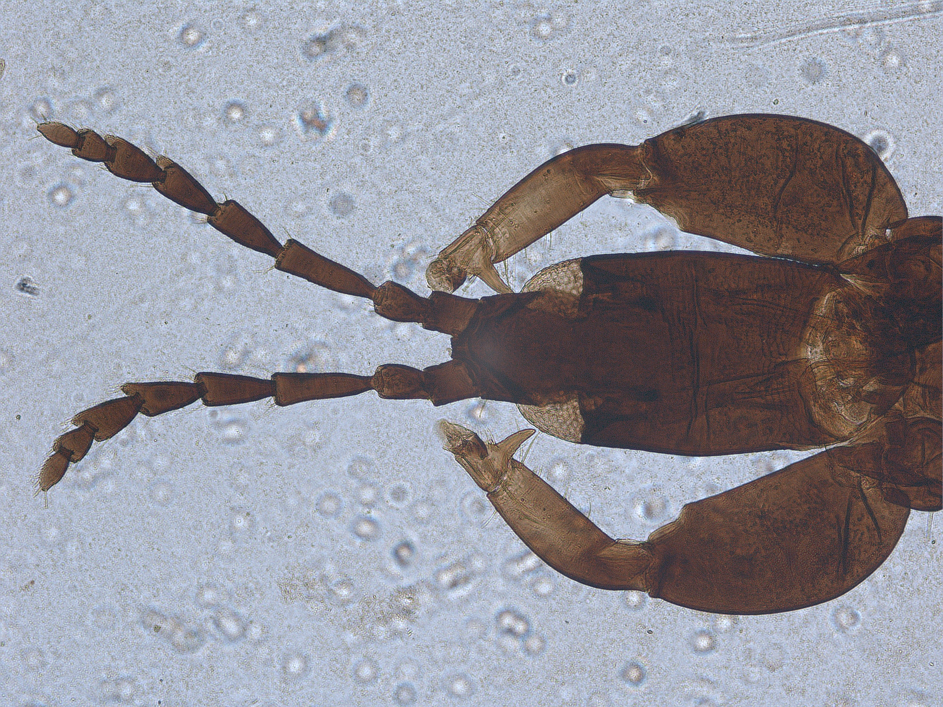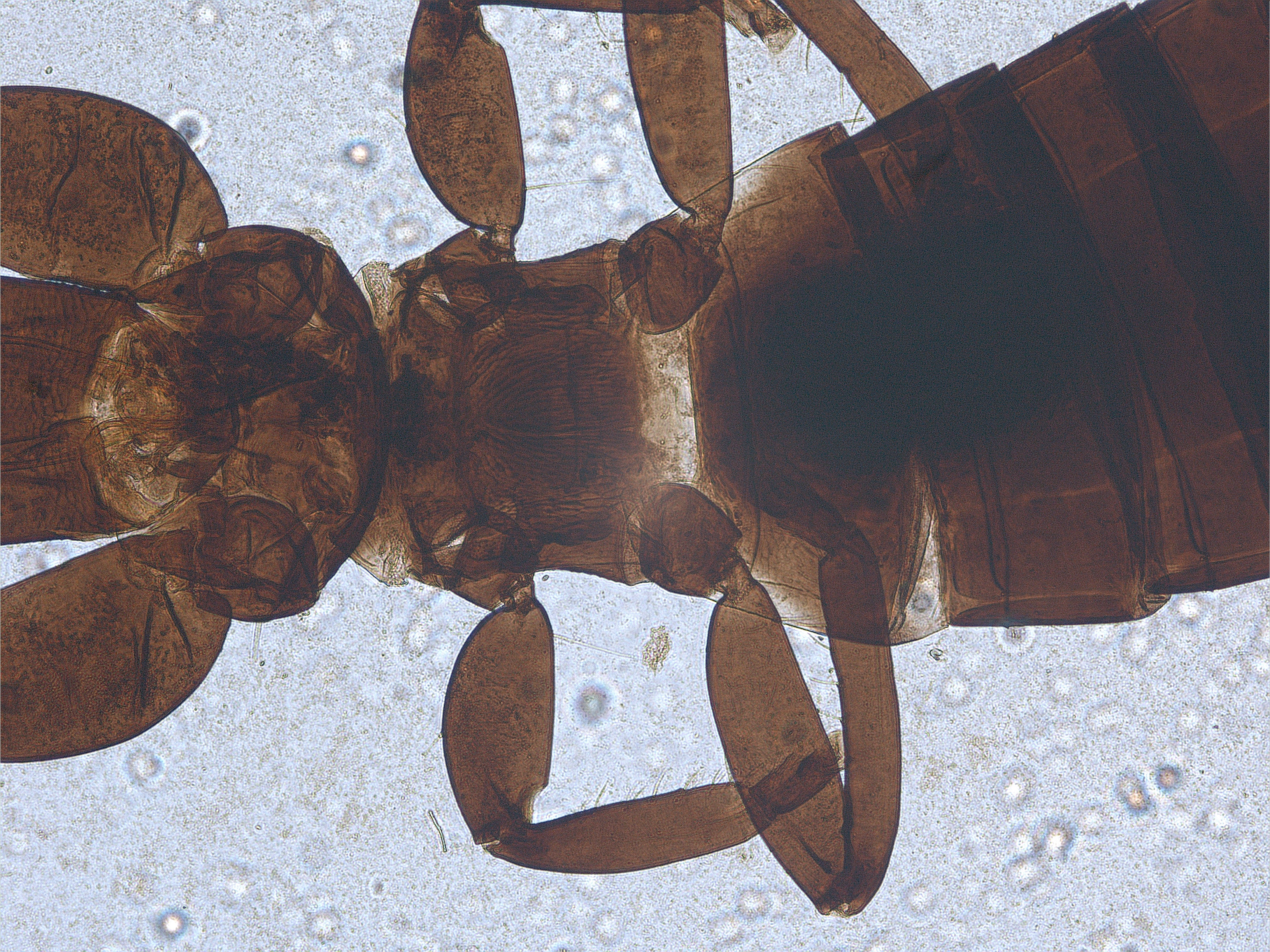 描述:雌虫(无翅型) 中型。体棕黄色至暗棕色,触角一致暗棕色;前足胫节最端部和跗节黄色,其余均棕色;尾管黑棕色,极端部浅;主要鬃黄色。头长约为宽的2倍,头背光滑,近后缘有网纹,头顶在复眼间延伸,延伸部分宽大于长;复眼背腹面不对称,在腹面向后延伸部分细长,约等长于复眼;无单眼,1对单眼前侧鬃较发达,等长于1对单眼后鬃,端部略扁;复眼后鬃短小,短于前侧鬃,端部宽扁;头背中部1对鬃较发达,端部钝,长于复眼后鬃,其他背鬃微小;两颊在中部略外拱;腹面近后缘有1对细长鬃;触角8节,节III最长,长是最宽处的3.6倍,节IV次之,节II~VIII基部梗明显,各节感觉锥数目:节III具1+1,节IV具11+1,节V具1+1,节VI具 1+01,节VII腹端 1个,节V~VII内侧端部稍微向前延伸,延伸部具1~2根粗鬃;口锥短,端部钝圆,口针较粗,缩入头内较短,呈‘V’形;下颚须2节,较短,端节端部有1根简单感觉锥,下唇须2节,下唇边缘约有7根较发达的鬃。前胸背板光滑,后侧缝完全,背板鬃均小,仅1对后侧鬃和1对后角鬃较发达,端部略扁;腹面前下胸片近似三角形,与前基腹片紧挨,前基腹片发达,相互靠近但不连接,前缘平,两后侧角发达。中胸背板主要为横线纹,后侧角为网纹,前侧鬃及后缘鬃不可见,1对中后鬃较小;中胸前小腹中峰突出。后胸背板布满简单的纵网纹,1对中对鬃较小,端部尖细,位于中部,前角具1对短鬃,端部钝,远离前缘;后胸腹侧缝完全。各足一般,线纹较弱,前足股节膨大,胫节无齿,跗节齿较发达,其上具1根小鬃。腹部节I盾片长方形,光滑或具少数线纹;节II~VII背板近前缘有少许网纹或线纹,节II~V各具1对直且端部钝的握翅鬃,后角鬃退化,节VI~VIII各节后角鬃发达,端部钝,其余鬃均微小,节II~VII各节背板具1对微小的中对鬃,其前内侧具1对钟形感觉器;节IX背板后缘鬃约等长于管;尾管具不清晰的网纹,甚短于头,两侧平直,基部宽于端部,肛鬃等长于管;腹板节II~VIII前半部有一横排微鬃,后缘鬃均位于后缘之前。