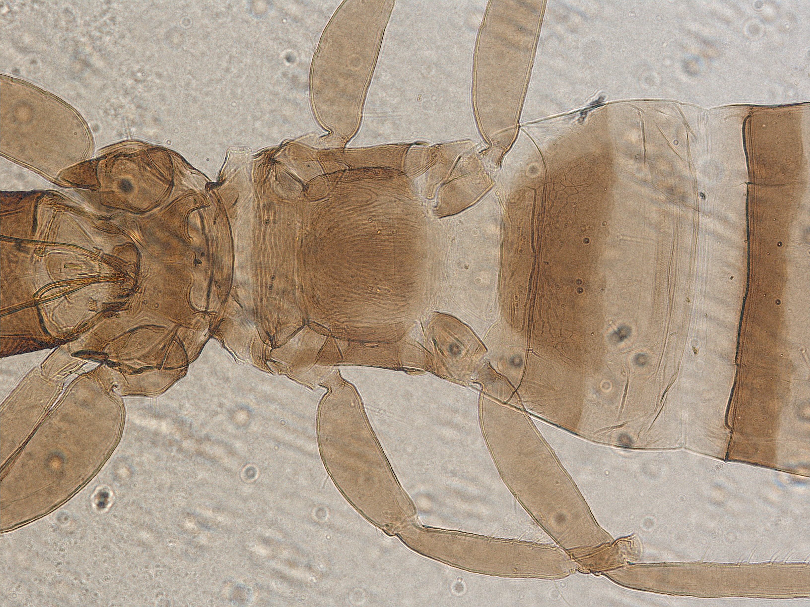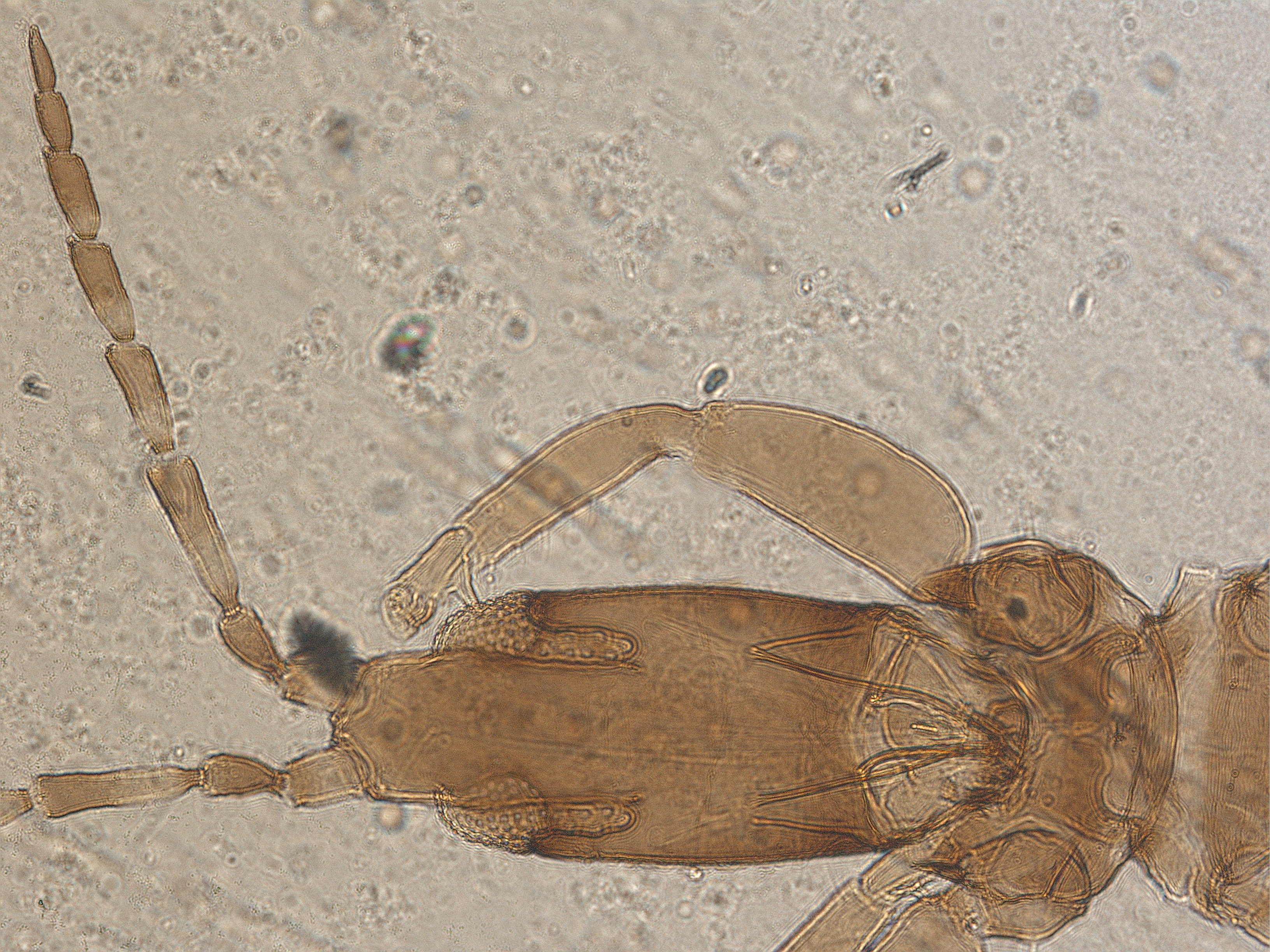描述:雌虫(无翅型) 中型。体棕黄色至暗棕色,触角一致暗棕色;前足胫节最端部和跗节黄色,其余均棕色;尾管黑棕色,极端部浅;主要鬃黄色。头长约为宽的2倍,头背光滑,近后缘有网纹,头顶在复眼间延伸,延伸部分宽大于长;复眼背腹面不对称,在腹面向后延伸部分细长,约等长于复眼;无单眼,1对单眼前侧鬃较发达,等长于1对单眼后鬃,端部略扁;复眼后鬃短小,短于前侧鬃,端部宽扁;头背中部1对鬃较发达,端部钝,长于复眼后鬃,其他背鬃微小;两颊在中部略外拱;腹面近后缘有1对细长鬃;触角8节,节III最长,长是最宽处的3.6倍,节IV次之,节II~VIII基部梗明显,各节感觉锥数目:节III具1+1,节IV具11+1,节V具1+1,节VI具 1+01,节VII腹端 1个,节V~VII内侧端部稍微向前延伸,延伸部具1~2根粗鬃;口锥短,端部钝圆,口针较粗,缩入头内较短,呈‘V’形;下颚须2节,较短,端节端部有1根简单感觉锥,下唇须2节,下唇边缘约有7根较发达的鬃。前胸背板光滑,后侧缝完全,背板鬃均小,仅1对后侧鬃和1对后角鬃较发达,端部略扁;腹面前下胸片近似三角形,与前基腹片紧挨,前基腹片发达,相互靠近但不连接,前缘平,两后侧角发达。中胸背板主要为横线纹,后侧角为网纹,前侧鬃及后缘鬃不可见,1对中后鬃较小;中胸前小腹中峰突出。后胸背板布满简单的纵网纹,1对中对鬃较小,端部尖细,位于中部,前角具1对短鬃,端部钝,远离前缘;后胸腹侧缝完全。各足一般,线纹较弱,前足股节膨大,胫节无齿,跗节齿较发达,其上具1根小鬃。腹部节I盾片长方形,光滑或具少数线纹;节II~VII背板近前缘有少许网纹或线纹,节II~V各具1对直且端部钝的握翅鬃,后角鬃退化,节VI~VIII各节后角鬃发达,端部钝,其余鬃均微小,节II~VII各节背板具1对微小的中对鬃,其前内侧具1对钟形感觉器;节IX背板后缘鬃约等长于管;尾管具不清晰的网纹,甚短于头,两侧平直,基部宽于端部,肛鬃等长于管;腹板节II~VIII前半部有一横排微鬃,后缘鬃均位于后缘之前。