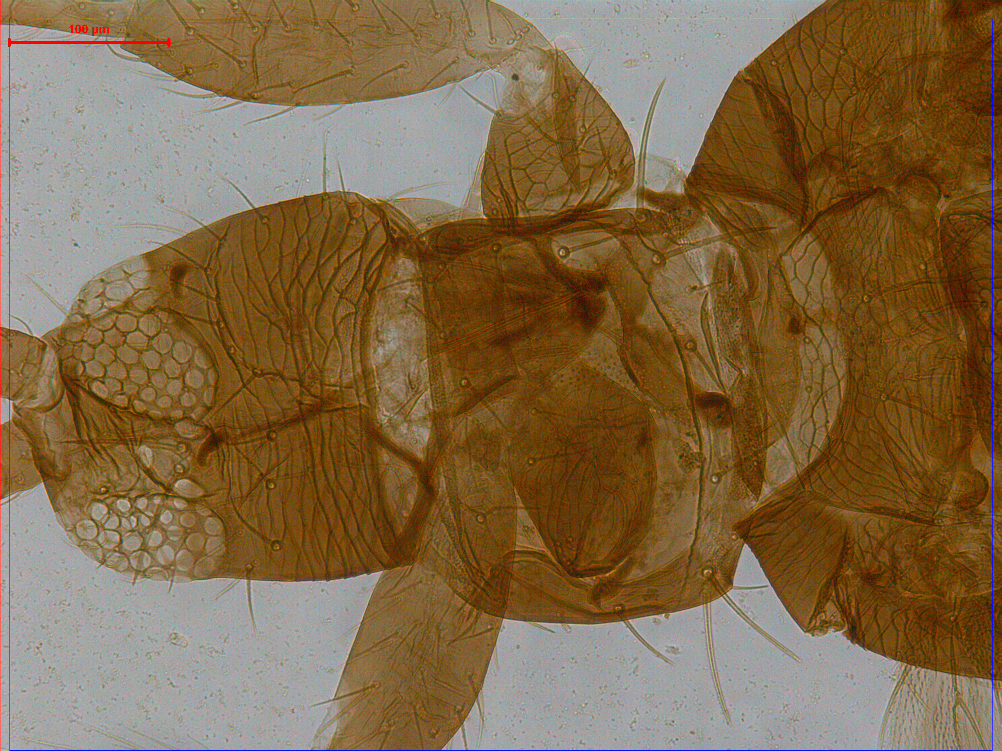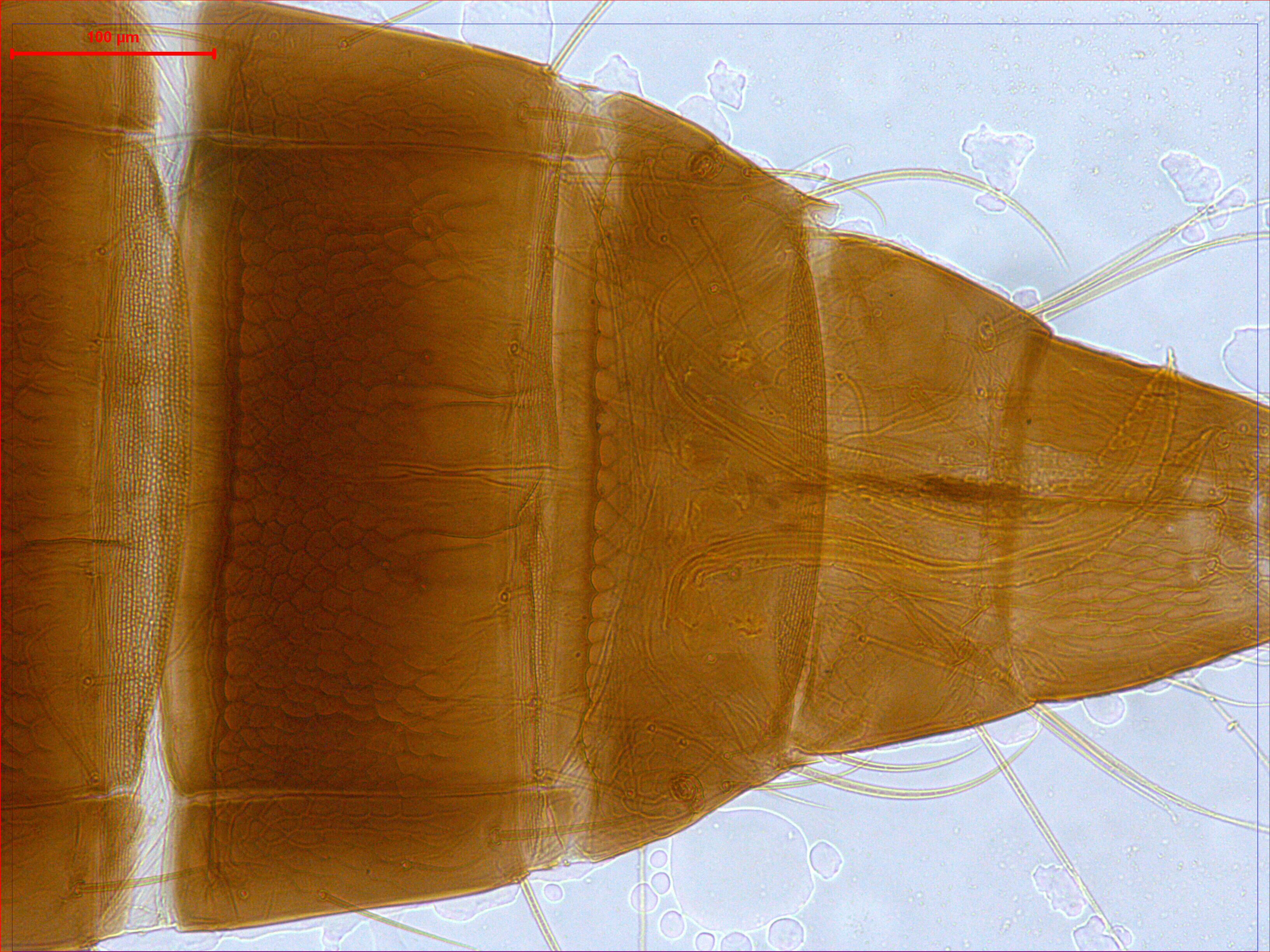 描述:雌虫:体暗棕色;触角节III-IV两端大部分及各足跗节黄色;前翅基部及翅瓣前缘一部分浅棕色,其余部分无色,前足胫节浅棕色。头在复眼后部收缩;复眼间光滑,眼后为横网纹和线纹;前单眼位于复眼内,单眼间鬃位于后单眼前内方,眼后具5对鬃;触角8节,较细。前胸背板光滑,背鬃较少,共约24根;后胸背板中部具网纹,两侧为纵纹,具1对钟形感觉器;前翅前缘鬃33根,前脉鬃23根,后脉鬃19根;中胸内叉骨具骨刺。腹部节I-VII背板具众多六角形网纹,节II-VII近后缘光滑,节VIII仅前缘具网纹,节IX光滑,I网纹纵向,相对应的腹板网纹相似;节VIII背板后缘梳完整,毛细;各节腹板无附属鬃。