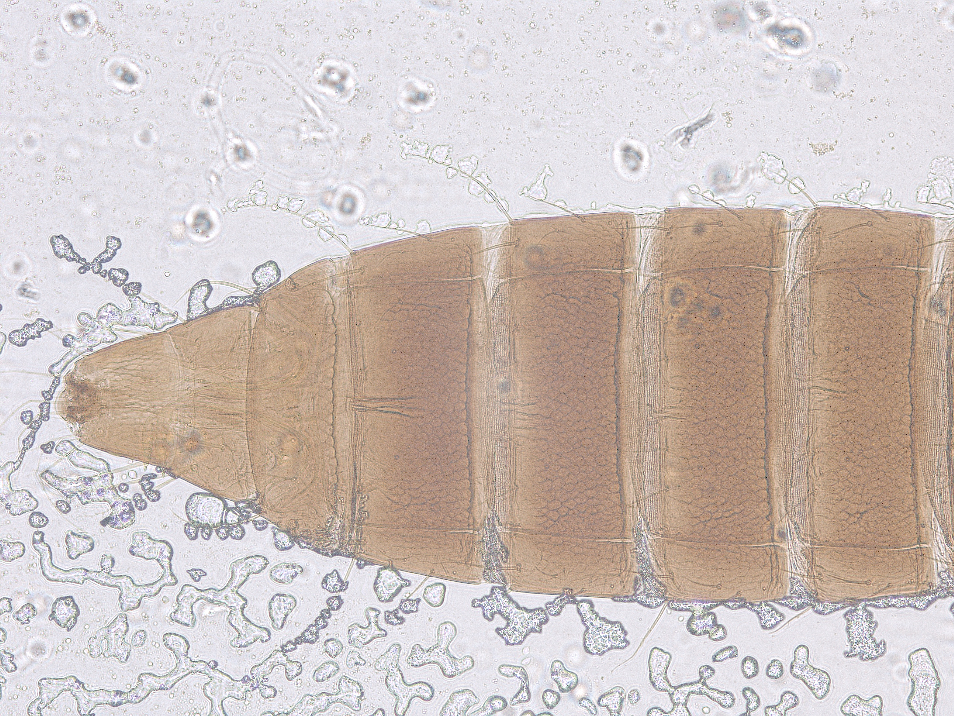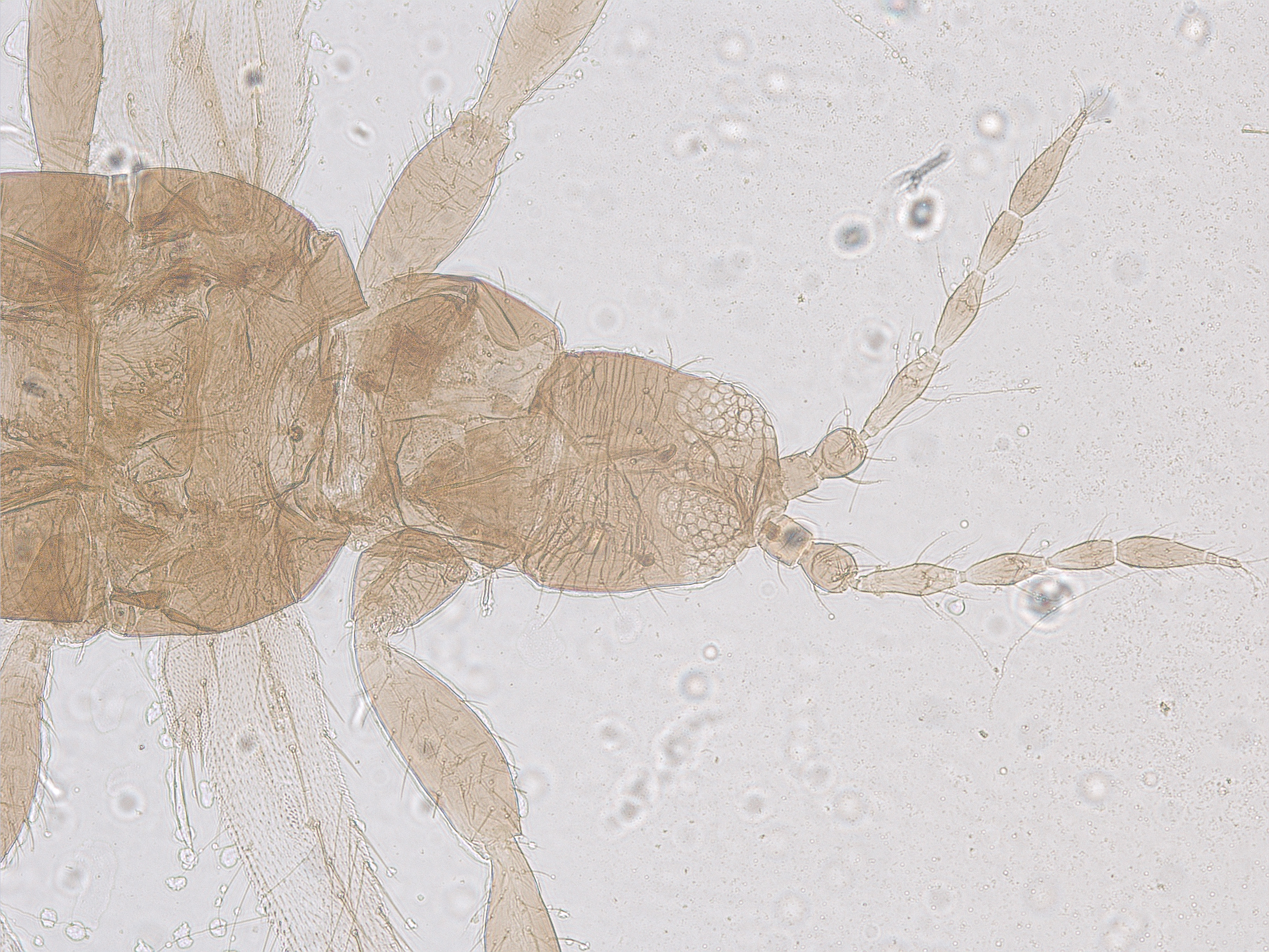 描述:雌虫:体暗棕色;触角节III-IV两端大部分及各足跗节黄色;前翅基部及翅瓣前缘一部分浅棕色,其余部分无色,前足胫节浅棕色。头在复眼后部收缩;复眼间光滑,眼后为横网纹和线纹;前单眼位于复眼内,单眼间鬃位于后单眼前内方,眼后具5对鬃;触角8节,较细。前胸背板光滑,背鬃较少,共约24根;后胸背板中部具网纹,两侧为纵纹,具1对钟形感觉器;前翅前缘鬃33根,前脉鬃23根,后脉鬃19根;中胸内叉骨具骨刺。腹部节I-VII背板具众多六角形网纹,节II-VII近后缘光滑,节VIII仅前缘具网纹,节IX光滑,I网纹纵向,相对应的腹板网纹相似;节VIII背板后缘梳完整,毛细;各节腹板无附属鬃。