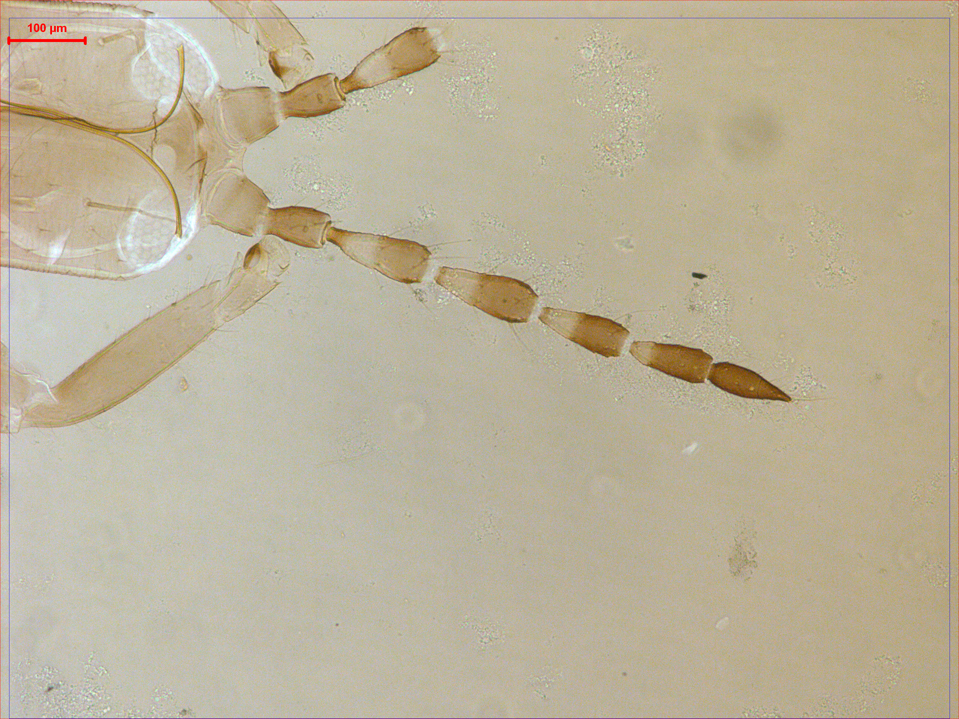描述:雌性(长翅型) 中型。体黄棕二色,以黄色为主。触角节I浅于节II,节III~VI近端部黄色,其余均棕色。头、胸部、腹部以及各足均为黄棕色,尾管深棕色。前翅透明。主要鬃棕黄色。头长于宽。头顶不延伸;单眼三角位于复眼间前半部,1对单眼前侧鬃微小,位于前单眼两侧,1对单眼间鬃微小,位于前后单眼外缘连线之外,1对单眼后鬃相似于单眼间鬃,位于两后单眼之后;复眼较小,等长于触角节I,1对眼后鬃发达,甚长于复眼;眼后两颊具简单横线纹,两侧缘和颊部具约12根短鬃,头两侧缘呈锯齿状,且具5对短鬃;口锥短,达前胸后半部,端部宽圆,下颚须2节,口针细,缩入头内头顶处,中部相互靠近;触角8节,节VII和VIII连接紧密,具完整细缝,节III长是宽的2.4倍,各节感觉锥数目:III具1+2,IV具2+2,V具1+1,VI具1+01,VII腹端1个,各感觉锥细长。前胸宽甚于长,背板光滑,仅近后缘有少许线纹,1对前缘相似于1对前角鬃,1对侧鬃、1对后侧鬃和1对后角鬃均发达,端部均钝,后侧鬃内侧具1对小鬃,1对后缘鬃微小;腹面不清晰(似乎前下胸片缺,前基腹片连接成一体)。中胸背板前中部具横线纹,后部光滑,1对后中鬃稍大于2对后缘鬃,均位于后缘之前,布满横线纹,各鬃均尖小,后中鬃长于后缘鬃;中胸前小腹片不清(似乎呈船型,中峰较突出)。后胸背板光滑,仅前缘和前侧有少许线纹,前角具4对小鬃,前中鬃较发达,位于前中部,端部均尖细;腹面光滑。各足一般,前足跗节无齿。前翅侧缘平行,中部不收缩,翅基鬃3对,S1稍短于S2,端部钝,S3最长,端部尖细尖,间插缨约18根。腹部节I盾板近似三角形,两侧叶较小,中部具简单网纹;节II~VII背板光滑,具2对反曲的握翅鬃,后角具1对发达的长鬃,两侧具3对小鬃,中对鬃缺,中部具1对钟形感觉器;节IX背板光滑,具3对小鬃和2对钟形感觉器,后缘鬃等长于管;尾管短于头,光滑无纹,肛鬃均尖细,稍长于管;腹部节II~VIII腹板均有一排小的附属鬃,后缘鬃均位于后缘之前。