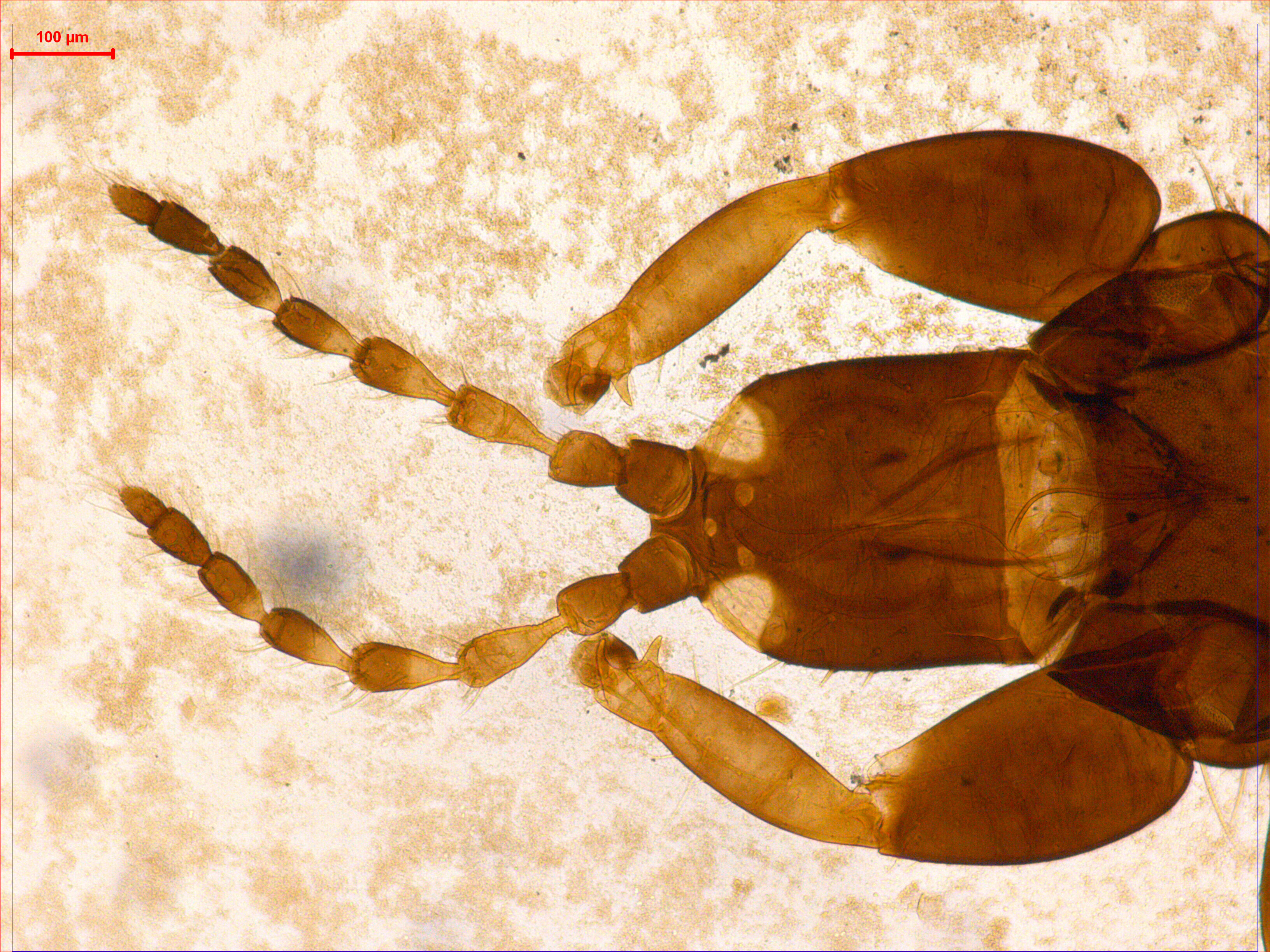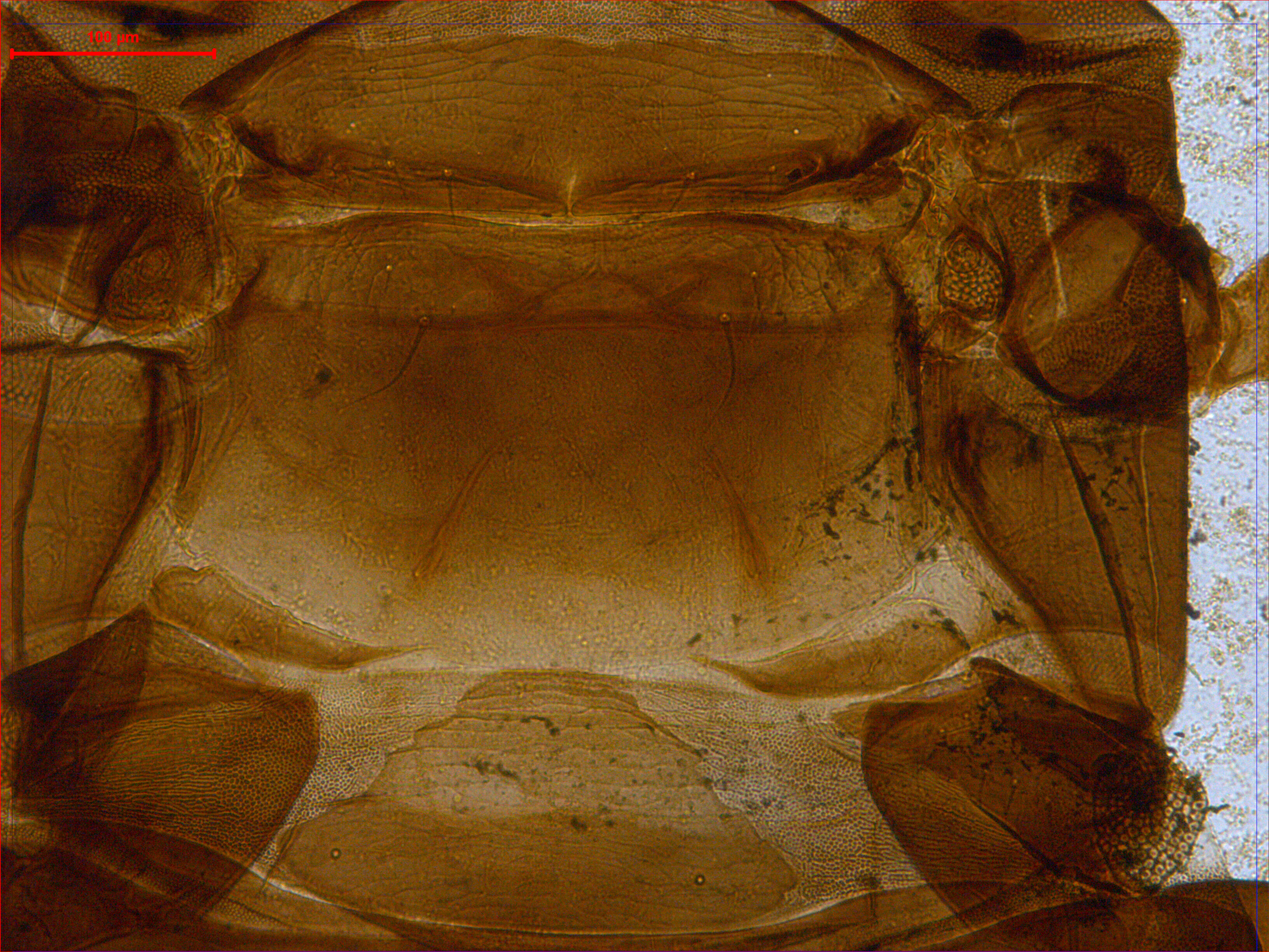 描述:雌性(无翅型) 中型。体深棕色。触角节III以及节IV~VI基部黄色,其余均深棕色。各足胫节端部和跗节黄色。主要鬃棕黄色。头长约等于宽。头顶在触角间略突出;单眼三角位于复眼间前中部,1对单眼侧鬃位于前单眼两侧,1对单眼间鬃微小,前后单眼连线之外,1对单眼后鬃稍大于单眼侧鬃,位于两后单眼之后;复眼较小,等长于触角节I,1对眼后鬃发达,约是复眼长的2倍,端部钝;复眼后头背板具不规则的线纹,头背中部鬃较小,相似于单眼后鬃,其余头背鬃刺状,约17根;口锥短,达前胸中部,端部较尖,下颚须2节,口针细,缩入头顶处,中部相互靠近;触角8节,中间节较长,节III~VI端部稍微收缩,各节感觉锥数目:III具2+1,IV具2+2,V具1+1,VI具1+1,VII端部1个,各感觉锥短小。前胸宽于长,背板光滑,仅近后前缘和近后缘具少许线纹,后侧缝完全,1对前缘微小,甚小于较发达的前角鬃,侧鬃、后侧鬃和后角鬃发达,端部微钝,后缘鬃相似于前缘鬃,其余背鬃均微小;腹面前下胸缺,前基腹片发达,近似三角形,前缘和后缘分别具1对小突起。中胸背板布满横线纹,各鬃均尖小,后中鬃长于后缘鬃,在一条直线上,均位于后缘之前,前半部具2对小的钟形感觉器;中胸前小腹片几乎分三部分,两侧呈三角形,仅一线连接中锋部分。后胸背板光滑,仅前缘和前侧有少许线纹,前缘鬃微小,位于前角前缘之后,中对鬃较发达,位于前半部;腹面光滑,腹侧缝较发达。各足线纹较稀疏,前足股节膨大,跗节具齿;中后足一般。腹部节I盾板近似三角形,布满横线纹,1对钟形感觉器位于两后角,靠近后缘;节II~VII背板线纹稀少,各节背板具2对小的握翅鬃,后角具1对长鬃,节II中对鬃发达,节III~VII中对鬃几乎不可见,1对钟形感觉器位于其内侧;节VIII相似于前节,但后缘具1对发达的后缘鬃;节IX背板较光滑,背板中部具4对小鬃,2对钟形感觉器分布位于近前缘和中后部,3对长缘鬃均短于尾管;尾管约等长于头,光滑无纹,前中部和后中部各具1对钟形感觉器,肛鬃均尖细,短于管;腹部节II~VIII腹板均有一排小的附属鬃,各节后缘鬃均位于后缘之前。