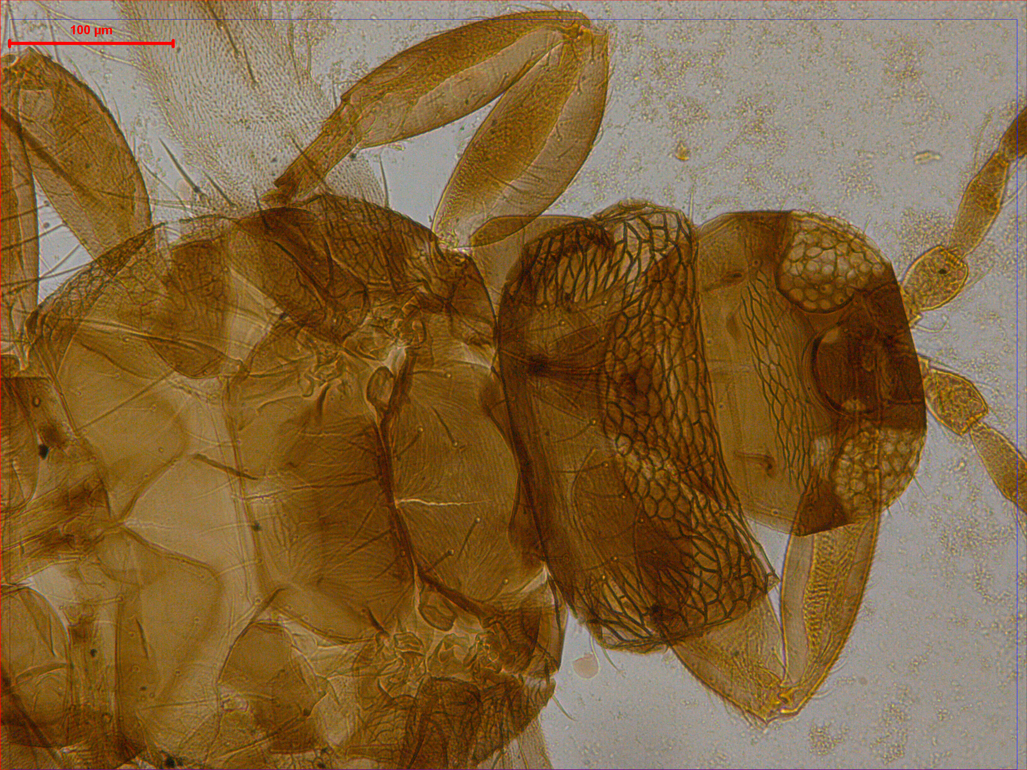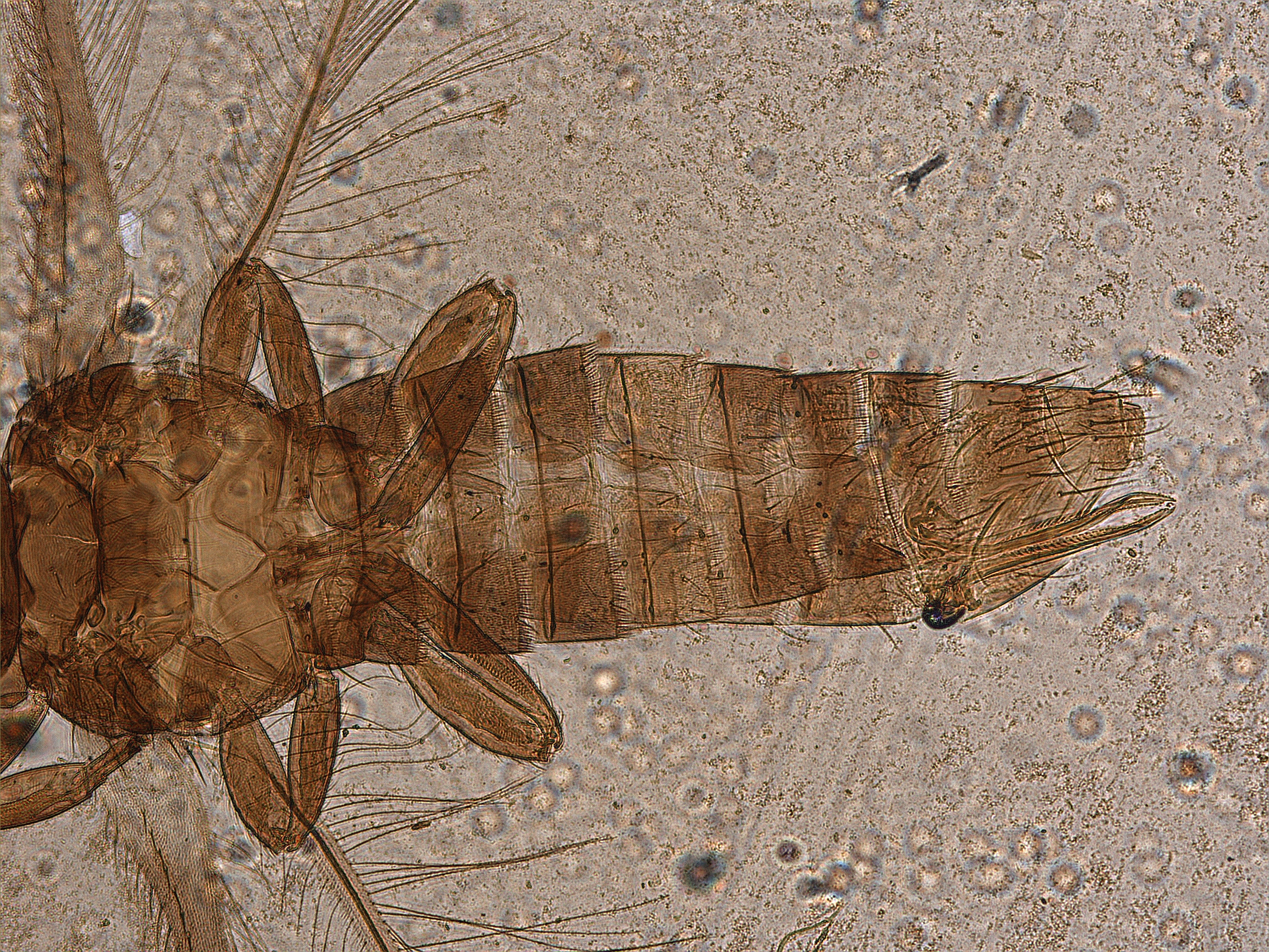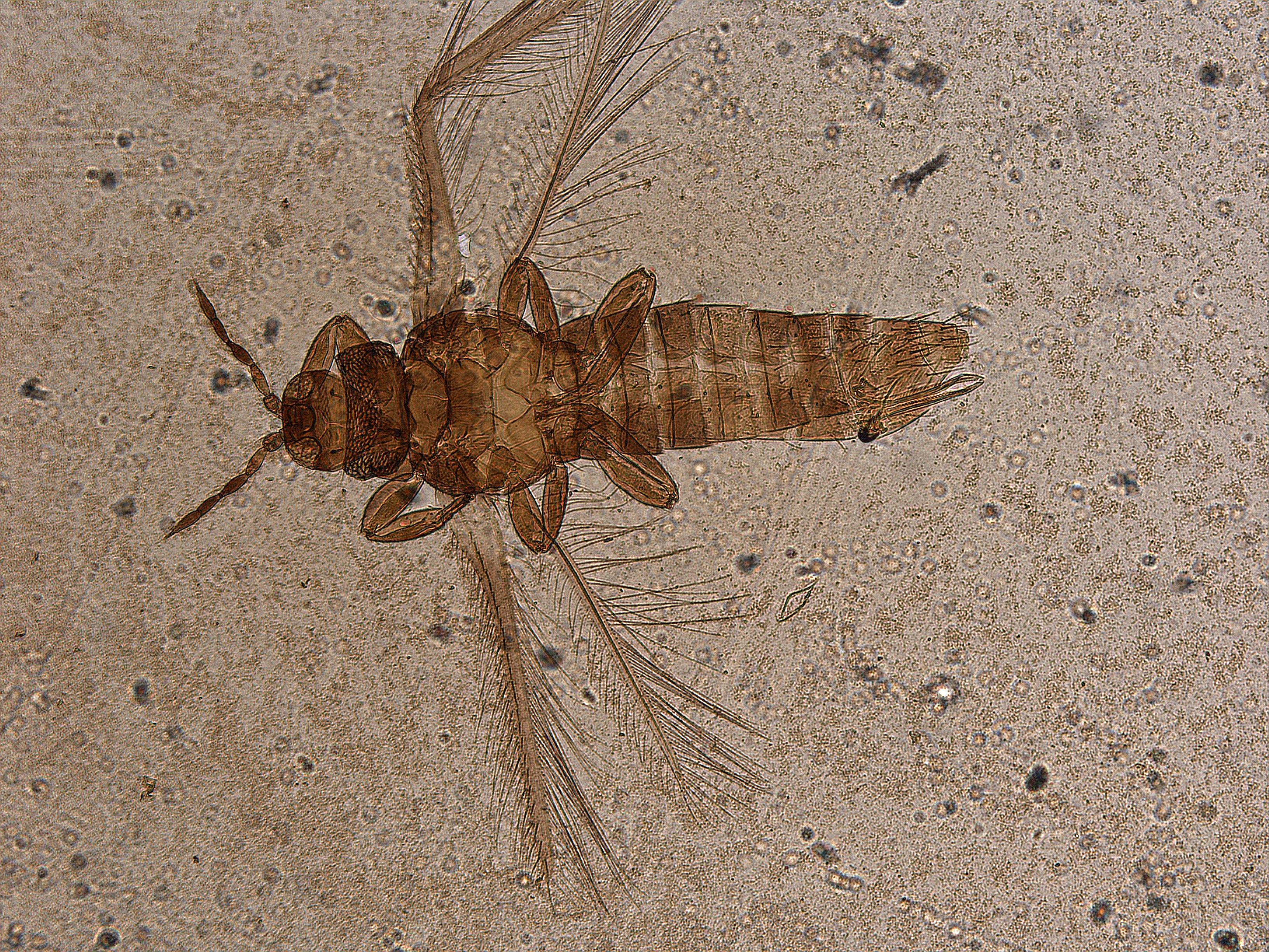 描述:雌虫:体棕色,长1.0mm。触角节I-III黄色,但节III端部微暗,节IV-VIII棕色,但节IV基部浅。前翅棕色,翅瓣端外有一白带,约占翅长的1/9。各足股节两端、各足胫节及跗节暗黄。腹部节II-VI中部淡棕色,中央各有一个棕色斑,节II-VII近前缘脊线粗而暗棕色,几占腹片整个宽度。头背单眼间有横纹,其间具极短线,沿复眼后缘的深色切线把头分为一个宽的后头区,其前部有些横交错线,后部细网纹;复眼较突出;单眼间鬃位于前单眼后外侧的前后单眼中心连线外缘;触角8节,节III长为宽的3.8倍,节III和IV感觉锥叉状,节V-VI各有2个简单感觉锥,其内缘感觉锥部分与该节愈合。前胸后部骨化板前角延伸,呈角状,后缘平行,后角略扩展,前部和两侧具横网纹,前部网纹中有短线,背板内有密交错横纹,同时有几个小无纹区,背板密布微颗粒;中胸背板密布横交错线纹,横线纹中有短线,后缘鬃位于后缘之前;后胸背板前部具向后弯曲的横线,两侧为纵线纹,后部又有2-3条横线,后外侧区有斜纵线,除两侧外,长线纹中夹以短线,前缘鬃位于前缘上,前中鬃间距大于前缘鬃间距;翅基部密布微毛,前翅前缘鬃2+28根,前脉鬃3+20根,后脉无鬃;后胸腹板中部呈‘V’形向后凹,‘V’形骨化线连接两侧的骨片;中后胸背板和腹板两侧具多角形网纹,网纹中密布微颗粒;各足股节、胫节密布微毛,另有长刚毛,但胫节内缘无成排的刺,前足股节不增大。腹部节I-VIII和X背板密布微毛,但节I-VIII中部微毛细弱,甚至有光滑无毛区,节X微毛短而稀疏,微毛间无纵皱;节I-VI背板两侧后缘有梳毛,近中部减弱,中部缺,节VII和VIII后缘梳毛完整;节III-VIII背板中对鬃长度和间距向后逐渐增大;腹板无附属鬃,节II-VIII腹板两侧密布微毛和后缘毛。