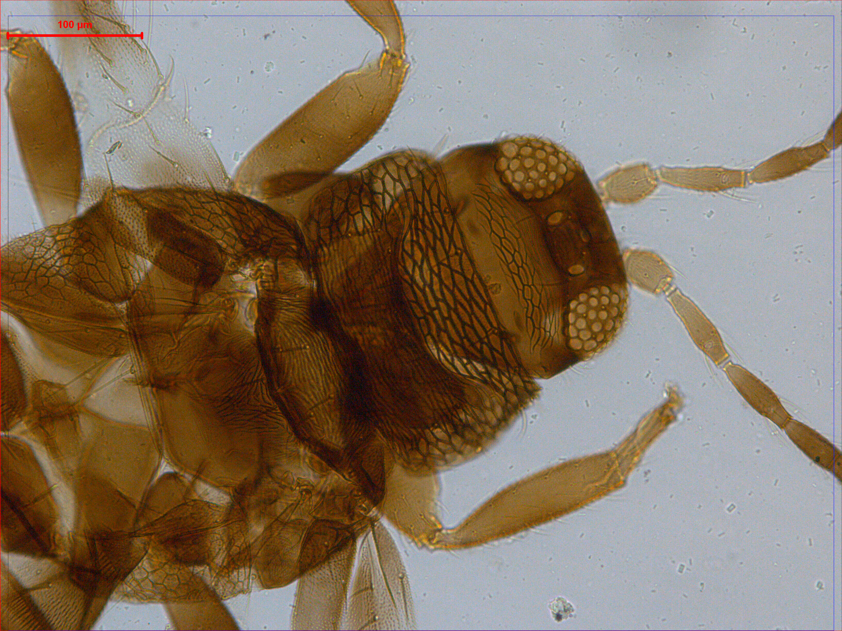 描述:雌虫:体棕色,长1.0mm。触角节I-III黄色,但节III端部微暗,节IV-VIII棕色,但节IV基部浅。前翅棕色,翅瓣端外有一白带,约占翅长的1/9。各足股节两端、各足胫节及跗节暗黄。腹部节II-VI中部淡棕色,中央各有一个棕色斑,节II-VII近前缘脊线粗而暗棕色,几占腹片整个宽度。头背单眼间有横纹,其间具极短线,沿复眼后缘的深色切线把头分为一个宽的后头区,其前部有些横交错线,后部细网纹;复眼较突出;单眼间鬃位于前单眼后外侧的前后单眼中心连线外缘;触角8节,节III长为宽的3.8倍,节III和IV感觉锥叉状,节V-VI各有2个简单感觉锥,其内缘感觉锥部分与该节愈合。前胸后部骨化板前角延伸,呈角状,后缘平行,后角略扩展,前部和两侧具横网纹,前部网纹中有短线,背板内有密交错横纹,同时有几个小无纹区,背板密布微颗粒;中胸背板密布横交错线纹,横线纹中有短线,后缘鬃位于后缘之前;后胸背板前部具向后弯曲的横线,两侧为纵线纹,后部又有2-3条横线,后外侧区有斜纵线,除两侧外,长线纹中夹以短线,前缘鬃位于前缘上,前中鬃间距大于前缘鬃间距;翅基部密布微毛,前翅前缘鬃2+28根,前脉鬃3+20根,后脉无鬃;后胸腹板中部呈‘V’形向后凹,‘V’形骨化线连接两侧的骨片;中后胸背板和腹板两侧具多角形网纹,网纹中密布微颗粒;各足股节、胫节密布微毛,另有长刚毛,但胫节内缘无成排的刺,前足股节不增大。腹部节I-VIII和X背板密布微毛,但节I-VIII中部微毛细弱,甚至有光滑无毛区,节X微毛短而稀疏,微毛间无纵皱;节I-VI背板两侧后缘有梳毛,近中部减弱,中部缺,节VII和VIII后缘梳毛完整;节III-VIII背板中对鬃长度和间距向后逐渐增大;腹板无附属鬃,节II-VIII腹板两侧密布微毛和后缘毛。