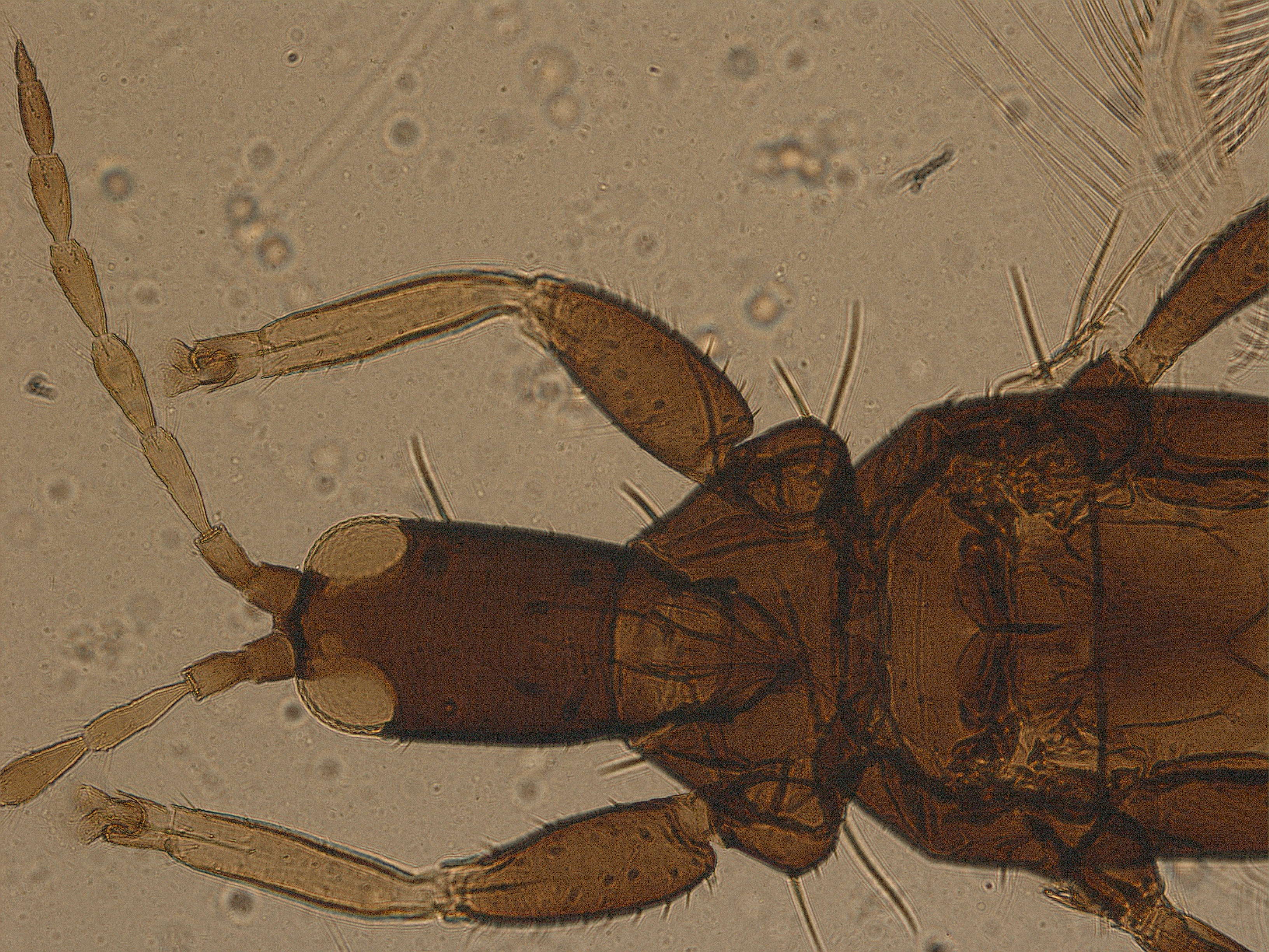 描述:雌虫(长翅型) 中型。体深棕色至黑棕色。触角节II端部、节III~VI以及节VII基部黄色,其余均深棕色。前足胫节、各足跗节以及中后足胫节端部和基部黄色,其余均深棕色。前翅略暗黄。主要鬃黄色。头长于宽。头顶在触角间不突出;单眼三角位于复眼间前半部,1对前单眼侧鬃较小,1对单眼间鬃稍大于侧鬃,位于前后单眼连线之外,2对单眼后鬃稍大于单眼间鬃,位于两后单眼之后,约等长于后单眼直径,单眼后鬃II位于复眼后缘的延长线上;复眼一般,略小于头长的1/3,覆盖黑色色素,1对复眼后鬃发达,端部稍微膨大,甚长于复眼;两颊近乎直,布满横线纹,颊背及侧缘约有13根小鬃,其中头背中部鬃2对,S1较发达,甚大于单眼后鬃,S2微小;口锥短,达前胸中部,端部钝圆,下颚须2节,口针细,缩入头内眼后鬃处,中部相互靠近;触角8节,节III~VI较长,节III长是宽的3.7倍,各节感觉锥数目:III具0+1,IV具1+21,V具1+1,VI具1+11,VII背端1个,各感觉锥适当大。前胸宽于长,背板较光滑,仅近前缘有少许横线纹以及两侧具不规则的线纹,后侧缝完全,前缘鬃较小,约为前角鬃的一半,侧鬃、后侧鬃和后角鬃发达,端部稍微膨大,后侧鬃内侧具1对微鬃,后缘鬃微小,其它背鬃约12根,稍小于后缘鬃;腹面前下胸缺,前基腹片较大,近似三角形,后缘具突出的部分。中胸背板除中后部光滑区外布满横网纹以及线纹,2对钟形感觉器位于背板前半部,1对前侧鬃发达,端部稍微膨大,1对中后鬃位于背板中部,2对后缘鬃位于后缘之前,对I较发达,对II相似于中后鬃;中胸前小腹片中部较退化,无中峰。后胸背板大部分具纵线纹,1对前缘鬃位于前角,仅几乎可见,1对前中鬃较发达,位于背板前半部;腹面光滑,内叉骨呈‘八’字,腹侧缝存在。各足外缘具众多刺状鬃,前足股节一般,跗节无齿,中后足一般。前翅似剑形,自基部向端部逐渐变窄,翅基鬃3对,S1相似于S2,端部稍微膨大,S3最长,端部较尖细,间插缨12~13根,翅缘缨毛直;后翅相似于前翅,但无间插缨和翅基鬃。腹部节I盾板近似三角形,布满向后弯曲的横网纹,1对钟形感觉器位于两后角;节II~VII背板光滑,各节具2对反曲的握翅鬃,后角具1对发达是粗鬃,1对中对鬃微小,仅几乎可见,其前内侧具1对钟形感觉器,均位于背板中部,各节背板两侧具3~4对较小鬃;节VIII仅在后角具1对长鬃;节IX背板中部具1对钟形感觉器,背长鬃均约等长于尾管;尾管两侧平直,光滑无纹,肛鬃均尖细,稍短于管;腹部节II~VIII腹板中部均具一排小的附属鬃,各节后缘鬃均位于后缘之前。