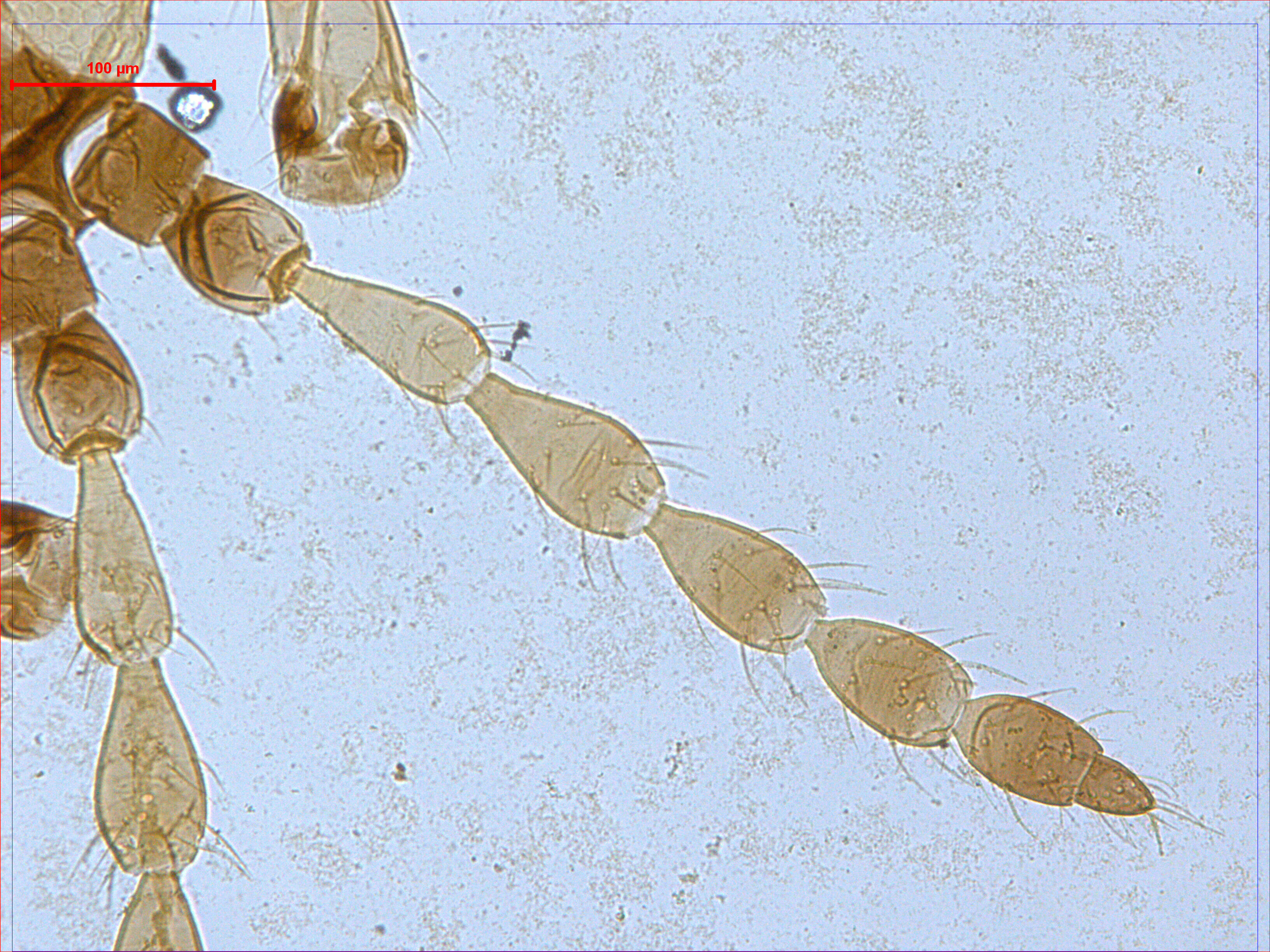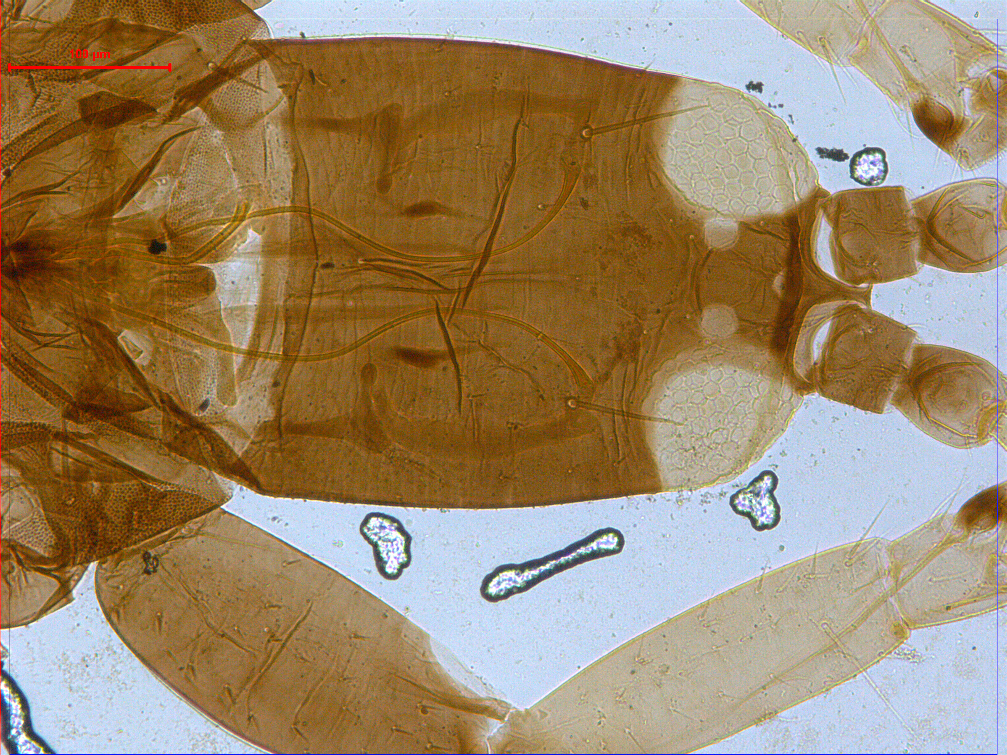 描述:雌虫(长翅型) 中型。体棕色。触角节II端部、节III~IV、节V~VI基部黄色,其余均棕色。前足胫跗节黄色,其余均棕色。前翅略暗黄,中部纵带较深。主要鬃棕色。头长于宽。头顶在触角间不突出;单眼三角位于复眼间前半部,1对前单眼侧鬃较小,1对单眼间鬃稍大于侧鬃,位于前后单眼连线之外,2对单眼后鬃稍大于单眼间鬃,位于两后单眼之后,稍短于后单眼直径,单眼后鬃S2位于复眼后缘的延长线上;复眼一般,略小于头长的1/3,1对复眼后鬃发达,端部尖,短于复眼;两颊近乎直,线纹稀少,颊背及侧缘约有6根小鬃,其中头背中部鬃1对,相似于单眼后鬃;口锥短,达前胸中部,端部钝圆,下颚须2节,口针细,缩入头内眼后鬃处,中部相互靠近;触角8节,节III~VI较长,节III长是宽的2.7倍,各节感觉锥数目:III具 0+1,IV具1+2,V具1+1,VI具1+1,VII背端1个,各感觉锥适当大。前胸宽于长,背板较光滑,仅近前缘和近后缘有少许横线纹,后侧缝完全,前缘鬃甚小,约为前角鬃的1/3,侧鬃、后侧鬃和后角鬃发达,端部尖,后侧鬃内侧具1对微鬃,后缘鬃微小;腹面前下胸片缺,前基腹片较大,近似三角形。中胸背板除中后部光滑区外布满横网纹,2对钟形感觉器位于背板前半部,1对前侧鬃发达,1对中后鬃和1对后缘鬃在一条直线上,均位于后缘之前;中胸前小腹片中部断开,两侧呈三角形。后胸背板大部分具纵线纹,1对前缘鬃位于前角,仅几乎可见,1对前中鬃位于背板前半部,亦较小;腹面光滑,内叉骨呈‘八’字,腹侧缝完全。各足具稀疏的横线纹,前足股节一般,跗节无齿,中后足一般。前翅似剑形,自基部向端部逐渐变窄,翅基鬃3对,S1~S3几乎等长,端部尖细,间插缨10~11根,翅缘缨毛直;后翅相似于前翅,但无间插缨和翅基鬃。腹部节I盾板近似三角形,具简单网纹,1对钟形感觉器位于两后角;节II~VII背板光滑,仅两侧具少许横线纹,各节具2对反曲的握翅鬃,后角具1对发达是粗鬃,1对中对鬃微小,仅几乎可见,其前内侧具1对钟形感觉器,均位于背板中部,各节背板两侧具3~4对较小鬃;节VIII仅在后角具1对长鬃;节IX背板中部具2对钟形感觉器,后缘长鬃端部尖细,S1明显短于S2和S3,均短于尾管;尾管两侧平直,光滑无纹,近前缘和近后缘分别具1对钟形感觉器,肛鬃均尖细,长于管;腹部节II~VIII腹板中部均具一排小的附属鬃,各节后缘鬃均位于后缘之前。