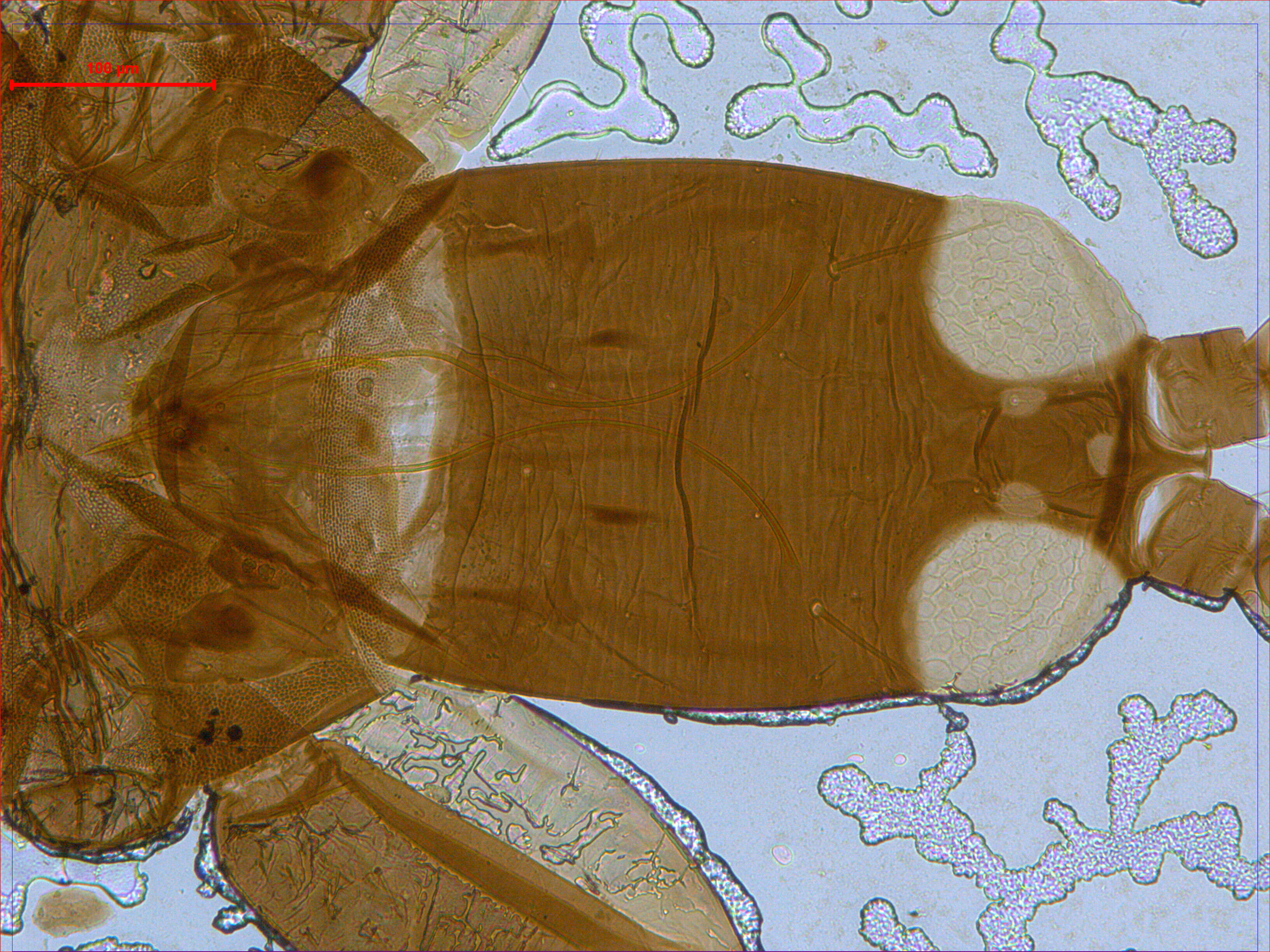 描述:雄虫(长翅型) 相似于雌虫;但较小,体长2500;腹部节IX背板长鬃S2短,S1~S3长210,75,265。