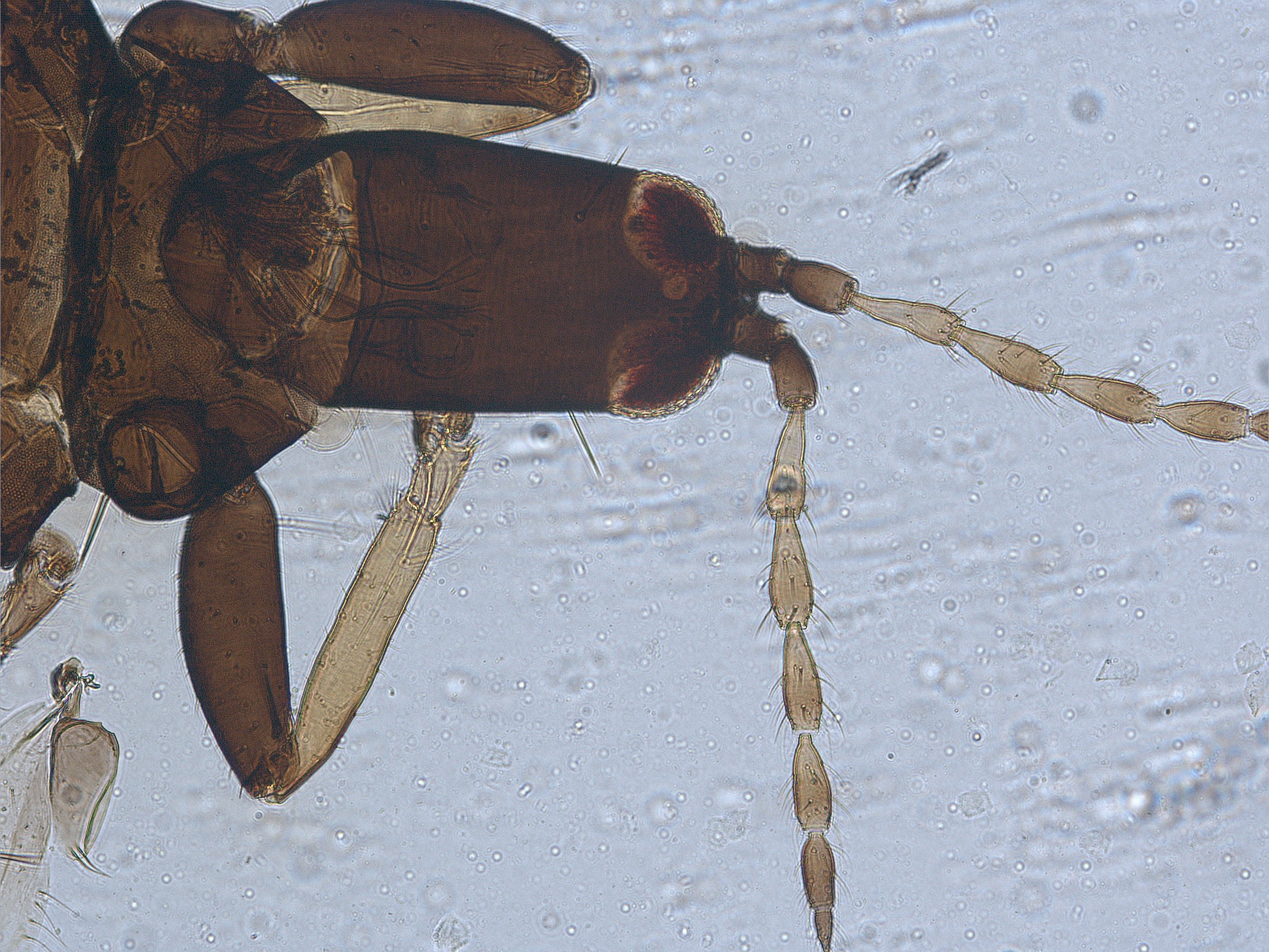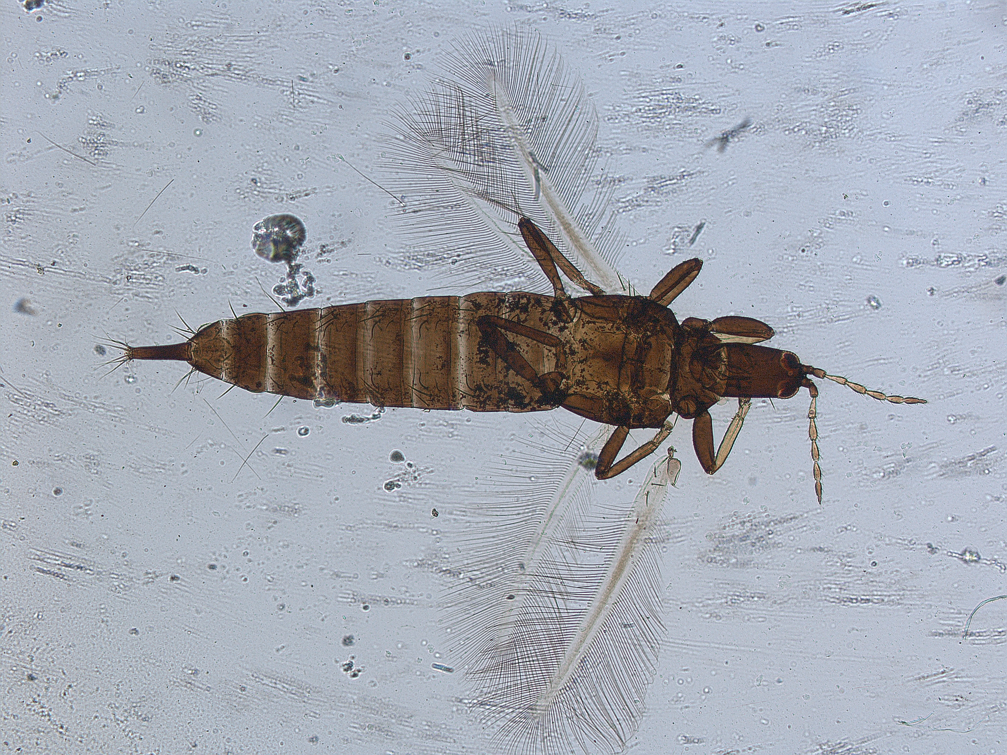 描述:雌虫(长翅型) 中型。体棕色。触角节II端部、节III~IV、节V~VI基部黄色,其余均棕色。前足胫跗节黄色,其余均棕色。前翅略暗黄,中部纵带较深。主要鬃棕色。头长于宽。头顶在触角间不突出;单眼三角位于复眼间前半部,1对前单眼侧鬃较小,1对单眼间鬃稍大于侧鬃,位于前后单眼连线之外,2对单眼后鬃稍大于单眼间鬃,位于两后单眼之后,稍短于后单眼直径,单眼后鬃S2位于复眼后缘的延长线上;复眼一般,略小于头长的1/3,1对复眼后鬃发达,端部尖,短于复眼;两颊近乎直,线纹稀少,颊背及侧缘约有6根小鬃,其中头背中部鬃1对,相似于单眼后鬃;口锥短,达前胸中部,端部钝圆,下颚须2节,口针细,缩入头内眼后鬃处,中部相互靠近;触角8节,节III~VI较长,节III长是宽的2.7倍,各节感觉锥数目:III具 0+1,IV具1+2,V具1+1,VI具1+1,VII背端1个,各感觉锥适当大。前胸宽于长,背板较光滑,仅近前缘和近后缘有少许横线纹,后侧缝完全,前缘鬃甚小,约为前角鬃的1/3,侧鬃、后侧鬃和后角鬃发达,端部尖,后侧鬃内侧具1对微鬃,后缘鬃微小;腹面前下胸片缺,前基腹片较大,近似三角形。中胸背板除中后部光滑区外布满横网纹,2对钟形感觉器位于背板前半部,1对前侧鬃发达,1对中后鬃和1对后缘鬃在一条直线上,均位于后缘之前;中胸前小腹片中部断开,两侧呈三角形。后胸背板大部分具纵线纹,1对前缘鬃位于前角,仅几乎可见,1对前中鬃位于背板前半部,亦较小;腹面光滑,内叉骨呈‘八’字,腹侧缝完全。各足具稀疏的横线纹,前足股节一般,跗节无齿,中后足一般。前翅似剑形,自基部向端部逐渐变窄,翅基鬃3对,S1~S3几乎等长,端部尖细,间插缨10~11根,翅缘缨毛直;后翅相似于前翅,但无间插缨和翅基鬃。腹部节I盾板近似三角形,具简单网纹,1对钟形感觉器位于两后角;节II~VII背板光滑,仅两侧具少许横线纹,各节具2对反曲的握翅鬃,后角具1对发达是粗鬃,1对中对鬃微小,仅几乎可见,其前内侧具1对钟形感觉器,均位于背板中部,各节背板两侧具3~4对较小鬃;节VIII仅在后角具1对长鬃;节IX背板中部具2对钟形感觉器,后缘长鬃端部尖细,S1明显短于S2和S3,均短于尾管;尾管两侧平直,光滑无纹,近前缘和近后缘分别具1对钟形感觉器,肛鬃均尖细,长于管;腹部节II~VIII腹板中部均具一排小的附属鬃,各节后缘鬃均位于后缘之前。