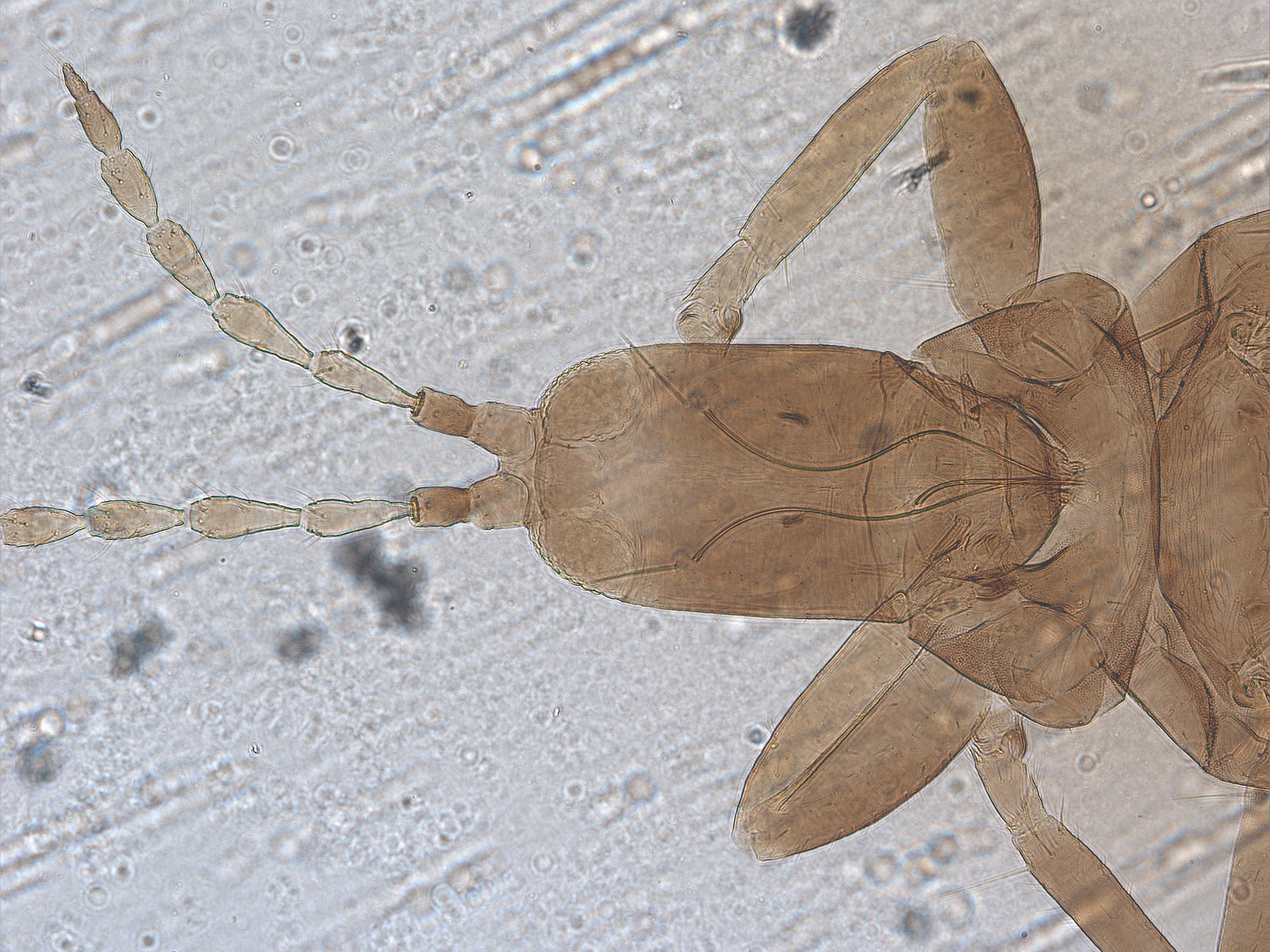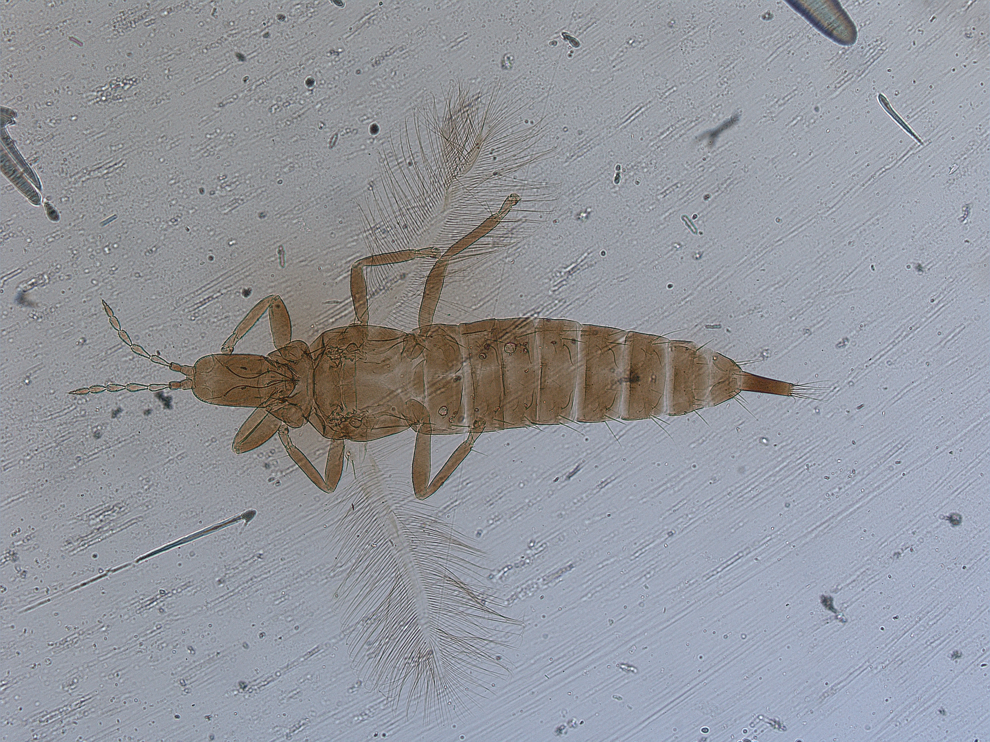 描述:雌虫(长翅型) 中型。体棕色。触角节II端部、节III~IV、节V~VI基部黄色,其余均棕色。前足胫跗节黄色,其余均棕色。前翅略暗黄,中部纵带较深。主要鬃棕色。头长于宽。头顶在触角间不突出;单眼三角位于复眼间前半部,1对前单眼侧鬃较小,1对单眼间鬃稍大于侧鬃,位于前后单眼连线之外,2对单眼后鬃稍大于单眼间鬃,位于两后单眼之后,稍短于后单眼直径,单眼后鬃S2位于复眼后缘的延长线上;复眼一般,略小于头长的1/3,1对复眼后鬃发达,端部尖,短于复眼;两颊近乎直,线纹稀少,颊背及侧缘约有6根小鬃,其中头背中部鬃1对,相似于单眼后鬃;口锥短,达前胸中部,端部钝圆,下颚须2节,口针细,缩入头内眼后鬃处,中部相互靠近;触角8节,节III~VI较长,节III长是宽的2.7倍,各节感觉锥数目:III具 0+1,IV具1+2,V具1+1,VI具1+1,VII背端1个,各感觉锥适当大。前胸宽于长,背板较光滑,仅近前缘和近后缘有少许横线纹,后侧缝完全,前缘鬃甚小,约为前角鬃的1/3,侧鬃、后侧鬃和后角鬃发达,端部尖,后侧鬃内侧具1对微鬃,后缘鬃微小;腹面前下胸片缺,前基腹片较大,近似三角形。中胸背板除中后部光滑区外布满横网纹,2对钟形感觉器位于背板前半部,1对前侧鬃发达,1对中后鬃和1对后缘鬃在一条直线上,均位于后缘之前;中胸前小腹片中部断开,两侧呈三角形。后胸背板大部分具纵线纹,1对前缘鬃位于前角,仅几乎可见,1对前中鬃位于背板前半部,亦较小;腹面光滑,内叉骨呈‘八’字,腹侧缝完全。各足具稀疏的横线纹,前足股节一般,跗节无齿,中后足一般。前翅似剑形,自基部向端部逐渐变窄,翅基鬃3对,S1~S3几乎等长,端部尖细,间插缨10~11根,翅缘缨毛直;后翅相似于前翅,但无间插缨和翅基鬃。腹部节I盾板近似三角形,具简单网纹,1对钟形感觉器位于两后角;节II~VII背板光滑,仅两侧具少许横线纹,各节具2对反曲的握翅鬃,后角具1对发达是粗鬃,1对中对鬃微小,仅几乎可见,其前内侧具1对钟形感觉器,均位于背板中部,各节背板两侧具3~4对较小鬃;节VIII仅在后角具1对长鬃;节IX背板中部具2对钟形感觉器,后缘长鬃端部尖细,S1明显短于S2和S3,均短于尾管;尾管两侧平直,光滑无纹,近前缘和近后缘分别具1对钟形感觉器,肛鬃均尖细,长于管;腹部节II~VIII腹板中部均具一排小的附属鬃,各节后缘鬃均位于后缘之前。