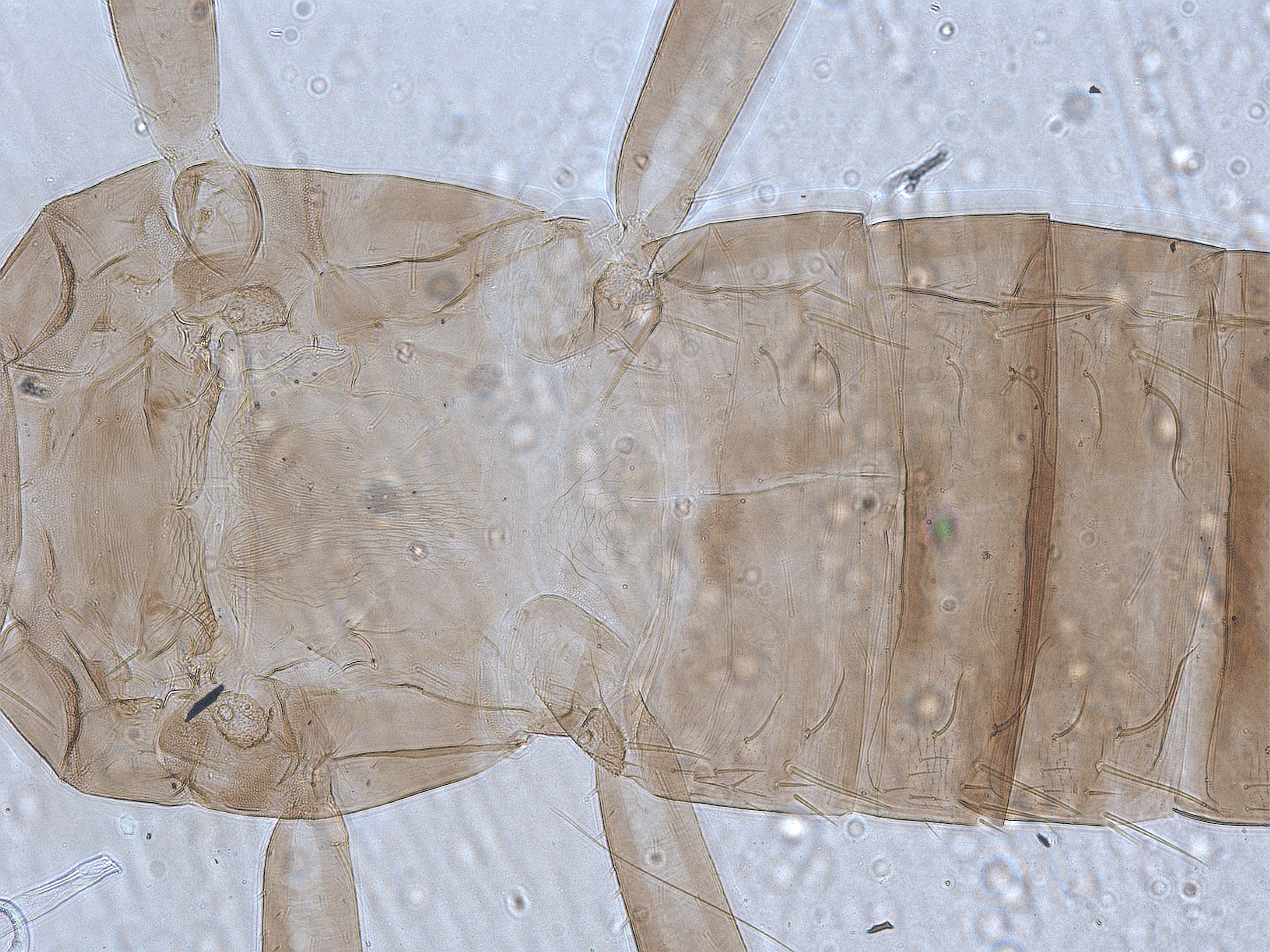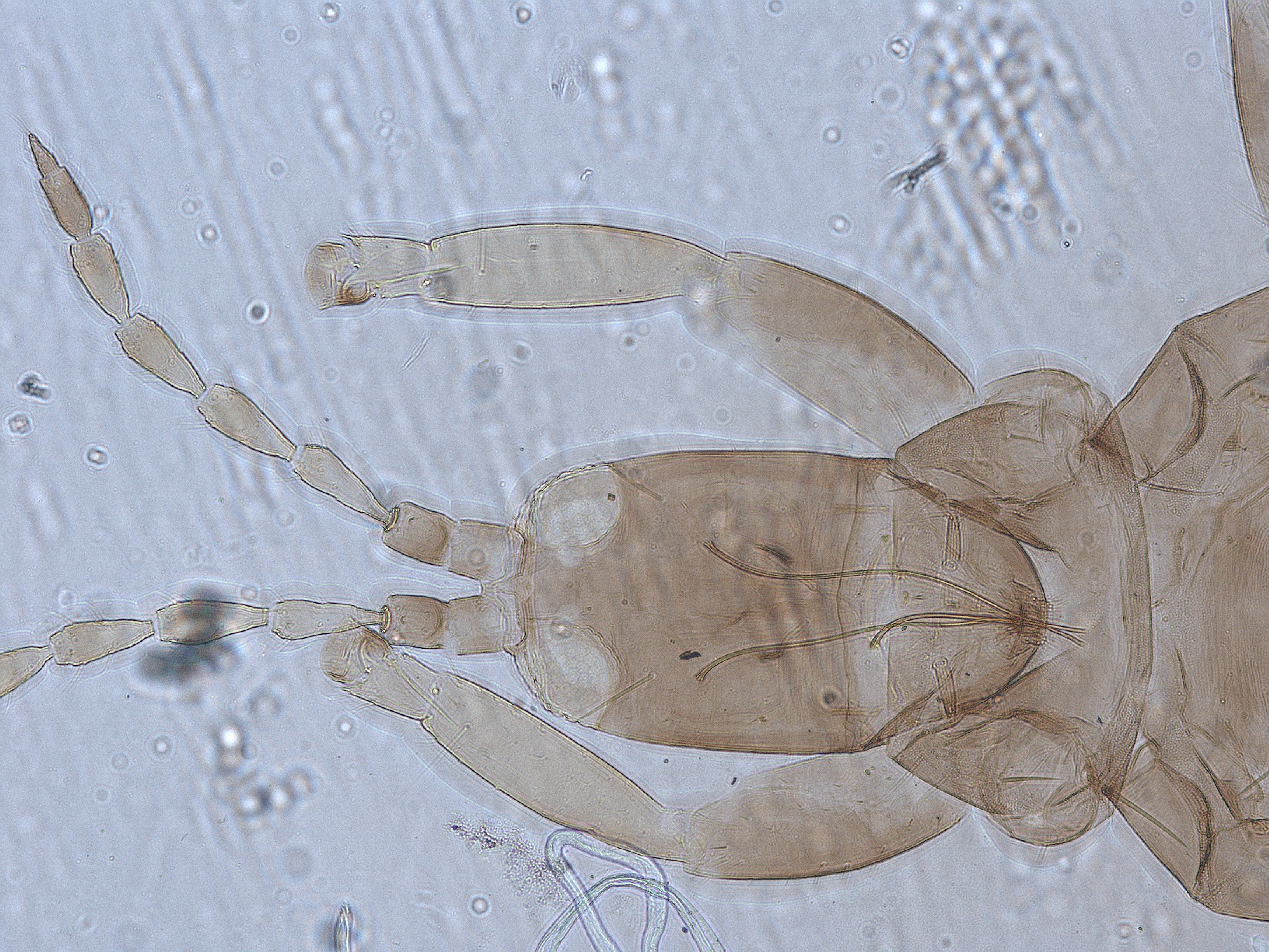 描述:雌虫(长翅型) 中型。体棕色。触角节II端部、节III~IV、节V~VI基部黄色,其余均棕色。前足胫跗节黄色,其余均棕色。前翅略暗黄,中部纵带较深。主要鬃棕色。头长于宽。头顶在触角间不突出;单眼三角位于复眼间前半部,1对前单眼侧鬃较小,1对单眼间鬃稍大于侧鬃,位于前后单眼连线之外,2对单眼后鬃稍大于单眼间鬃,位于两后单眼之后,稍短于后单眼直径,单眼后鬃S2位于复眼后缘的延长线上;复眼一般,略小于头长的1/3,1对复眼后鬃发达,端部尖,短于复眼;两颊近乎直,线纹稀少,颊背及侧缘约有6根小鬃,其中头背中部鬃1对,相似于单眼后鬃;口锥短,达前胸中部,端部钝圆,下颚须2节,口针细,缩入头内眼后鬃处,中部相互靠近;触角8节,节III~VI较长,节III长是宽的2.7倍,各节感觉锥数目:III具 0+1,IV具1+2,V具1+1,VI具1+1,VII背端1个,各感觉锥适当大。前胸宽于长,背板较光滑,仅近前缘和近后缘有少许横线纹,后侧缝完全,前缘鬃甚小,约为前角鬃的1/3,侧鬃、后侧鬃和后角鬃发达,端部尖,后侧鬃内侧具1对微鬃,后缘鬃微小;腹面前下胸片缺,前基腹片较大,近似三角形。中胸背板除中后部光滑区外布满横网纹,2对钟形感觉器位于背板前半部,1对前侧鬃发达,1对中后鬃和1对后缘鬃在一条直线上,均位于后缘之前;中胸前小腹片中部断开,两侧呈三角形。后胸背板大部分具纵线纹,1对前缘鬃位于前角,仅几乎可见,1对前中鬃位于背板前半部,亦较小;腹面光滑,内叉骨呈‘八’字,腹侧缝完全。各足具稀疏的横线纹,前足股节一般,跗节无齿,中后足一般。前翅似剑形,自基部向端部逐渐变窄,翅基鬃3对,S1~S3几乎等长,端部尖细,间插缨10~11根,翅缘缨毛直;后翅相似于前翅,但无间插缨和翅基鬃。腹部节I盾板近似三角形,具简单网纹,1对钟形感觉器位于两后角;节II~VII背板光滑,仅两侧具少许横线纹,各节具2对反曲的握翅鬃,后角具1对发达是粗鬃,1对中对鬃微小,仅几乎可见,其前内侧具1对钟形感觉器,均位于背板中部,各节背板两侧具3~4对较小鬃;节VIII仅在后角具1对长鬃;节IX背板中部具2对钟形感觉器,后缘长鬃端部尖细,S1明显短于S2和S3,均短于尾管;尾管两侧平直,光滑无纹,近前缘和近后缘分别具1对钟形感觉器,肛鬃均尖细,长于管;腹部节II~VIII腹板中部均具一排小的附属鬃,各节后缘鬃均位于后缘之前。