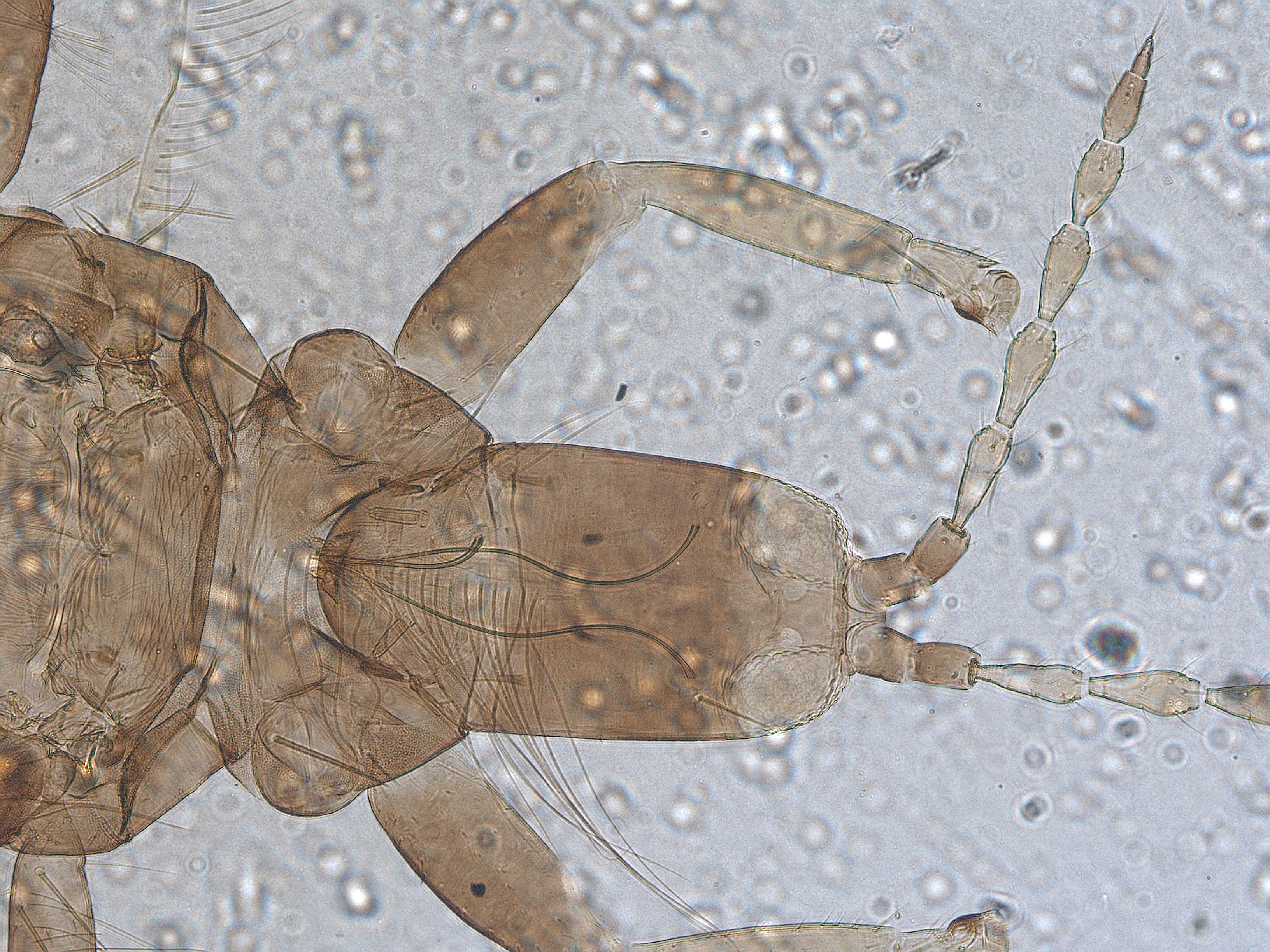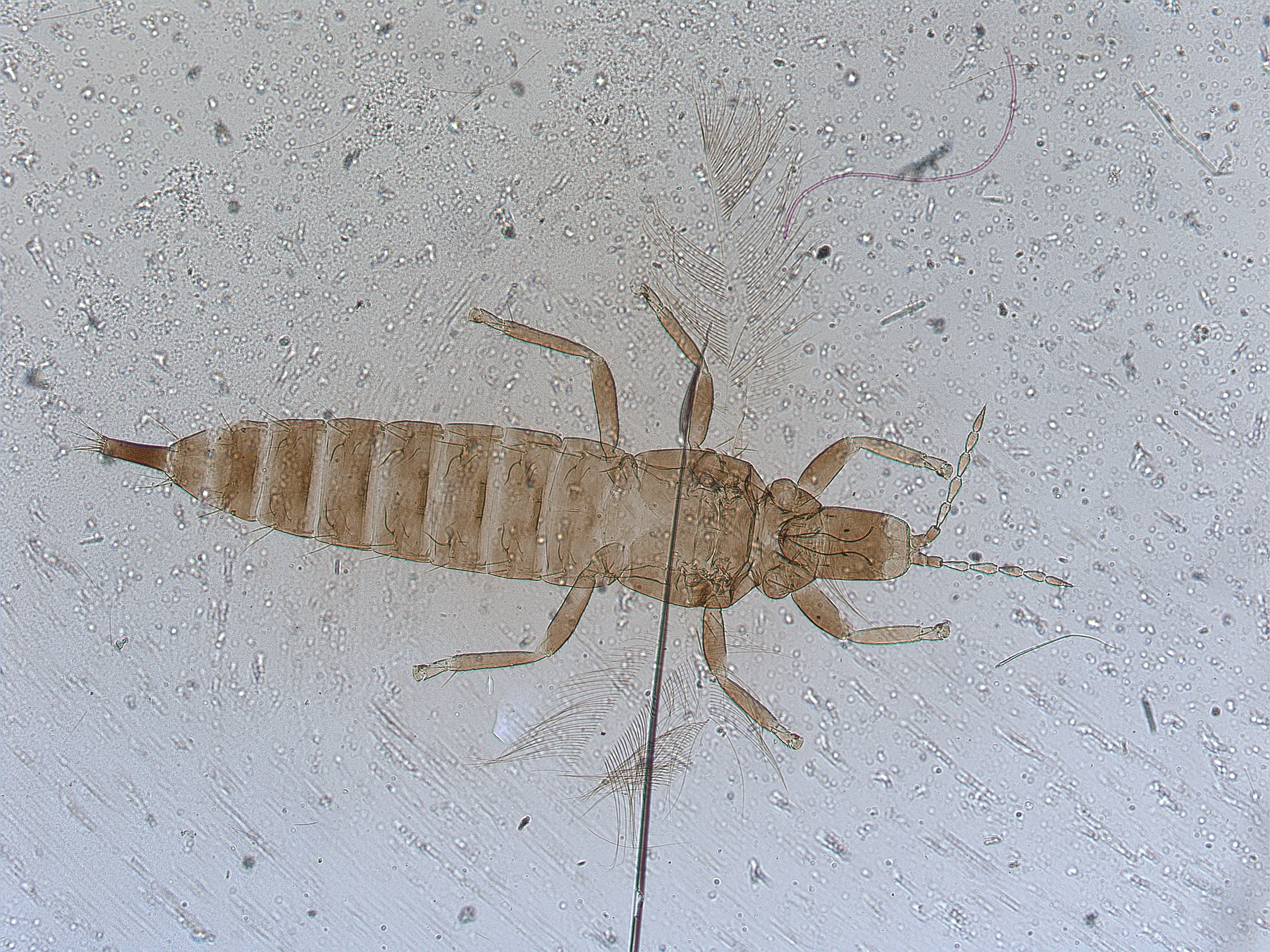 描述:雌虫(长翅型) 中型。体棕色。触角节II端部、节III~IV、节V~VI基部黄色,其余均棕色。前足胫跗节黄色,其余均棕色。前翅略暗黄,中部纵带较深。主要鬃棕色。头长于宽。头顶在触角间不突出;单眼三角位于复眼间前半部,1对前单眼侧鬃较小,1对单眼间鬃稍大于侧鬃,位于前后单眼连线之外,2对单眼后鬃稍大于单眼间鬃,位于两后单眼之后,稍短于后单眼直径,单眼后鬃S2位于复眼后缘的延长线上;复眼一般,略小于头长的1/3,1对复眼后鬃发达,端部尖,短于复眼;两颊近乎直,线纹稀少,颊背及侧缘约有6根小鬃,其中头背中部鬃1对,相似于单眼后鬃;口锥短,达前胸中部,端部钝圆,下颚须2节,口针细,缩入头内眼后鬃处,中部相互靠近;触角8节,节III~VI较长,节III长是宽的2.7倍,各节感觉锥数目:III具 0+1,IV具1+2,V具1+1,VI具1+1,VII背端1个,各感觉锥适当大。前胸宽于长,背板较光滑,仅近前缘和近后缘有少许横线纹,后侧缝完全,前缘鬃甚小,约为前角鬃的1/3,侧鬃、后侧鬃和后角鬃发达,端部尖,后侧鬃内侧具1对微鬃,后缘鬃微小;腹面前下胸片缺,前基腹片较大,近似三角形。中胸背板除中后部光滑区外布满横网纹,2对钟形感觉器位于背板前半部,1对前侧鬃发达,1对中后鬃和1对后缘鬃在一条直线上,均位于后缘之前;中胸前小腹片中部断开,两侧呈三角形。后胸背板大部分具纵线纹,1对前缘鬃位于前角,仅几乎可见,1对前中鬃位于背板前半部,亦较小;腹面光滑,内叉骨呈‘八’字,腹侧缝完全。各足具稀疏的横线纹,前足股节一般,跗节无齿,中后足一般。前翅似剑形,自基部向端部逐渐变窄,翅基鬃3对,S1~S3几乎等长,端部尖细,间插缨10~11根,翅缘缨毛直;后翅相似于前翅,但无间插缨和翅基鬃。腹部节I盾板近似三角形,具简单网纹,1对钟形感觉器位于两后角;节II~VII背板光滑,仅两侧具少许横线纹,各节具2对反曲的握翅鬃,后角具1对发达是粗鬃,1对中对鬃微小,仅几乎可见,其前内侧具1对钟形感觉器,均位于背板中部,各节背板两侧具3~4对较小鬃;节VIII仅在后角具1对长鬃;节IX背板中部具2对钟形感觉器,后缘长鬃端部尖细,S1明显短于S2和S3,均短于尾管;尾管两侧平直,光滑无纹,近前缘和近后缘分别具1对钟形感觉器,肛鬃均尖细,长于管;腹部节II~VIII腹板中部均具一排小的附属鬃,各节后缘鬃均位于后缘之前。
