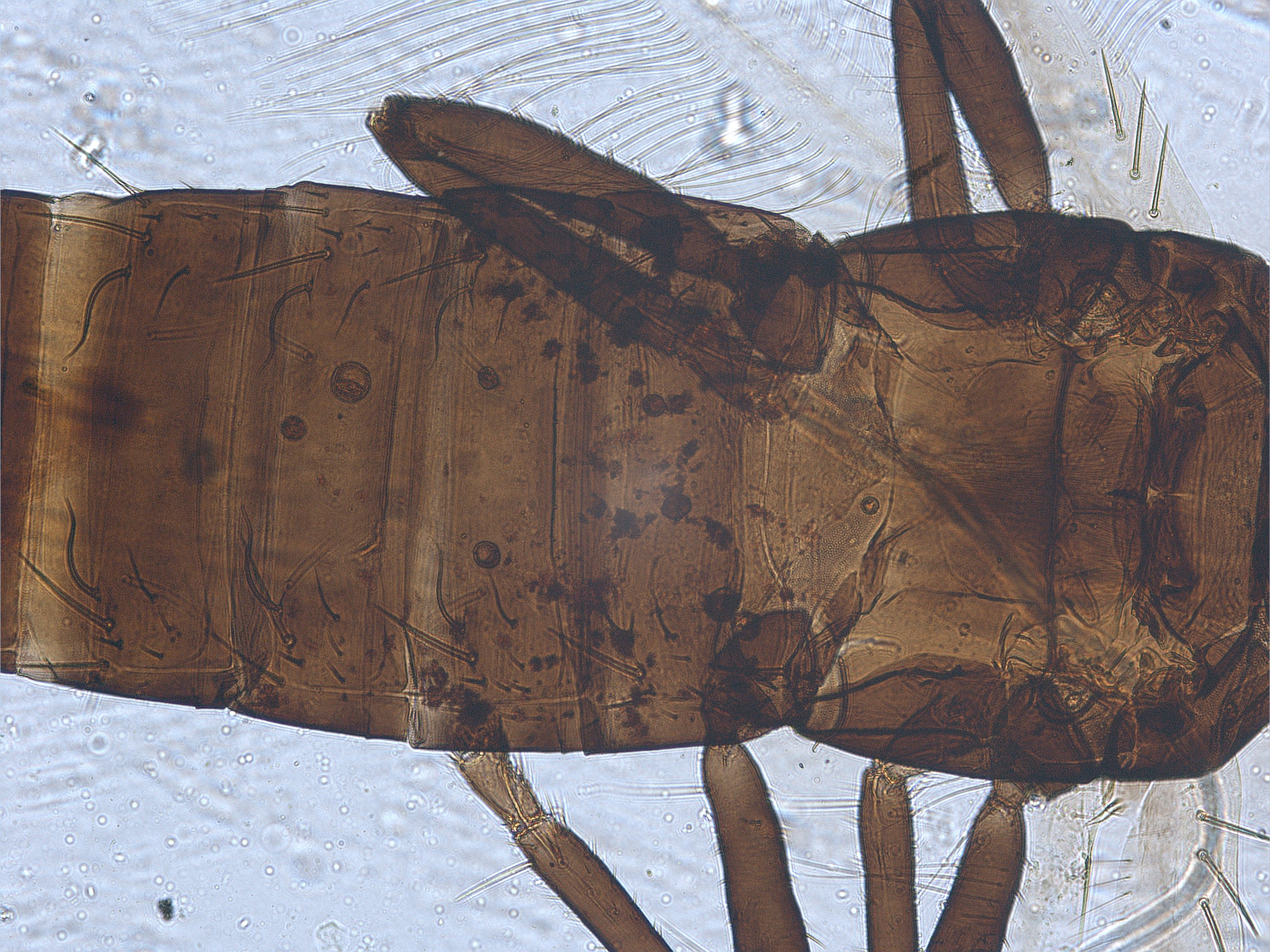 描述:雌虫(长翅型) 中型。体棕色。触角节II端部、节III~IV、节V~VI基部黄色,其余均棕色。前足胫跗节黄色,其余均棕色。前翅略暗黄,中部纵带较深。主要鬃棕色。头长于宽。头顶在触角间不突出;单眼三角位于复眼间前半部,1对前单眼侧鬃较小,1对单眼间鬃稍大于侧鬃,位于前后单眼连线之外,2对单眼后鬃稍大于单眼间鬃,位于两后单眼之后,稍短于后单眼直径,单眼后鬃S2位于复眼后缘的延长线上;复眼一般,略小于头长的1/3,1对复眼后鬃发达,端部尖,短于复眼;两颊近乎直,线纹稀少,颊背及侧缘约有6根小鬃,其中头背中部鬃1对,相似于单眼后鬃;口锥短,达前胸中部,端部钝圆,下颚须2节,口针细,缩入头内眼后鬃处,中部相互靠近;触角8节,节III~VI较长,节III长是宽的2.7倍,各节感觉锥数目:III具 0+1,IV具1+2,V具1+1,VI具1+1,VII背端1个,各感觉锥适当大。前胸宽于长,背板较光滑,仅近前缘和近后缘有少许横线纹,后侧缝完全,前缘鬃甚小,约为前角鬃的1/3,侧鬃、后侧鬃和后角鬃发达,端部尖,后侧鬃内侧具1对微鬃,后缘鬃微小;腹面前下胸片缺,前基腹片较大,近似三角形。中胸背板除中后部光滑区外布满横网纹,2对钟形感觉器位于背板前半部,1对前侧鬃发达,1对中后鬃和1对后缘鬃在一条直线上,均位于后缘之前;中胸前小腹片中部断开,两侧呈三角形。后胸背板大部分具纵线纹,1对前缘鬃位于前角,仅几乎可见,1对前中鬃位于背板前半部,亦较小;腹面光滑,内叉骨呈‘八’字,腹侧缝完全。各足具稀疏的横线纹,前足股节一般,跗节无齿,中后足一般。前翅似剑形,自基部向端部逐渐变窄,翅基鬃3对,S1~S3几乎等长,端部尖细,间插缨10~11根,翅缘缨毛直;后翅相似于前翅,但无间插缨和翅基鬃。腹部节I盾板近似三角形,具简单网纹,1对钟形感觉器位于两后角;节II~VII背板光滑,仅两侧具少许横线纹,各节具2对反曲的握翅鬃,后角具1对发达是粗鬃,1对中对鬃微小,仅几乎可见,其前内侧具1对钟形感觉器,均位于背板中部,各节背板两侧具3~4对较小鬃;节VIII仅在后角具1对长鬃;节IX背板中部具2对钟形感觉器,后缘长鬃端部尖细,S1明显短于S2和S3,均短于尾管;尾管两侧平直,光滑无纹,近前缘和近后缘分别具1对钟形感觉器,肛鬃均尖细,长于管;腹部节II~VIII腹板中部均具一排小的附属鬃,各节后缘鬃均位于后缘之前。