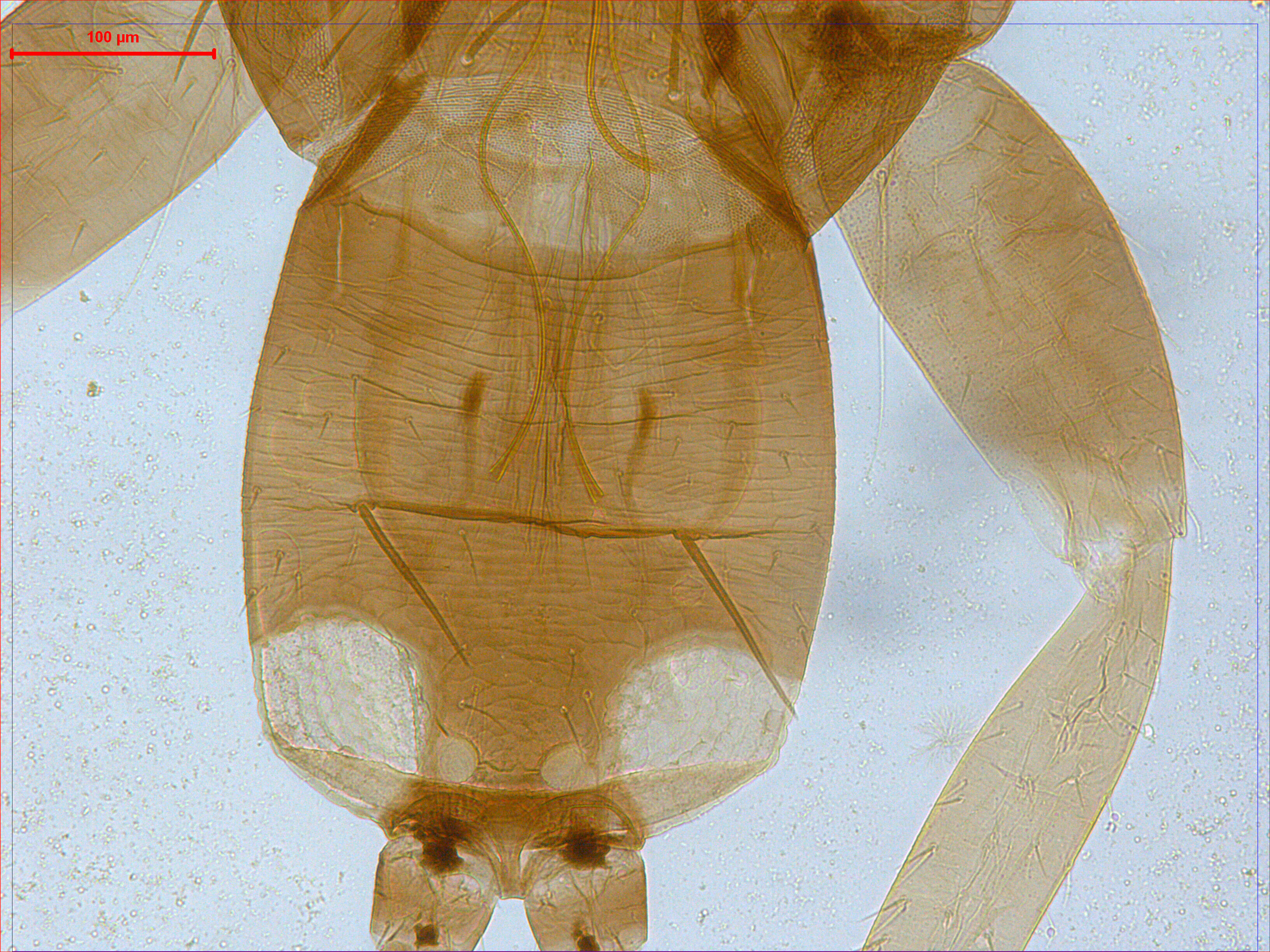 描述:雌虫(长翅型) 中型。体棕色。触角节II端部、节III、节IV~VI基部黄色,其余均棕色。前足胫跗节、中后足胫节端部和跗节黄色,其余均棕色。前翅略黄。主要鬃棕色。头长于宽。头顶在触角间不突出;单眼三角位于复眼间前半部,1对前单眼侧鬃较小,1对单眼间鬃稍大于侧鬃,位于前后单眼连线之外,2对单眼后鬃稍大于单眼间鬃,位于两后单眼之后,约等长于后单眼直径,单眼后鬃S2位于复眼后缘的延长线上;复眼一般,略小于头长的1/3,1对复眼后鬃发达,端部钝,等长于复眼;两颊近乎直,布满横线纹,颊背及侧缘约有18根小鬃,其中头背中部鬃1对,相似于单眼后鬃,位于复眼后鬃之间;口锥稍长,达前胸后部,端部钝圆,下颚须2节,口针细,缩入头内眼后鬃处,中部相互靠近;触角8节,节III~VI较长,节III长是宽的3倍,各节感觉锥数目:III具0+1,IV具1+21,V具1+1,VI具1+1,VII背端1个,各感觉锥适当大。前胸宽于长,背板较光滑,仅近前缘和近后缘有少许横线纹,后侧缝完全,前缘鬃发达,明显长于前角鬃,端部钝,侧鬃、后侧鬃和后角鬃发达,端部钝,后侧鬃内侧具1对微鬃,后缘鬃微小;腹面前下胸片缺,前基腹片较大,近似三角形。中胸背板除中后部光滑区外布满横网纹,2对钟形感觉器位于背板前半部,1对前侧鬃较发达,相似于1对中后鬃,2对后缘鬃位于后缘之前;中胸前小腹片中部仅一线相连,两侧呈三角形。后胸背板大部分具纵线纹,1对前缘鬃位于前角,仅几乎可见,1对前中鬃位于背板前半部,较发达,端部尖细;腹面光滑,内叉骨呈‘八’字,腹侧缝完全。各足具稀疏的横线纹,前足股节一般,跗节无齿,中后足一般。前翅似剑形,自基部向端部逐渐变窄,翅基鬃3对,S1~S3几乎等长,端部微钝,间插缨16~17根,翅缘缨毛直;后翅相似于前翅,但无间插缨和翅基鬃。腹部节I盾板近似三角形,具简单网纹,1对钟形感觉器位于两后角;节II~VII背板光滑,仅两侧具少许横线纹,各节具2对反曲的握翅鬃,后角具1对发达是粗鬃,1对中对鬃微小,仅几乎可见,其前内侧具1对钟形感觉器,均位于背板中部,各节背板两侧具3~4对较小鬃;节VIII仅在后角具1对长鬃;节IX背板中部具2对钟形感觉器,后缘长鬃端部尖细,均约等长于尾管;尾管两侧平直,光滑无纹,近前缘和近后缘分别具1对钟形感觉器,肛鬃均尖细,约等长于管;腹部节II~VIII腹板中部均具一排小的附属鬃,各节后缘鬃均位于后缘之前。