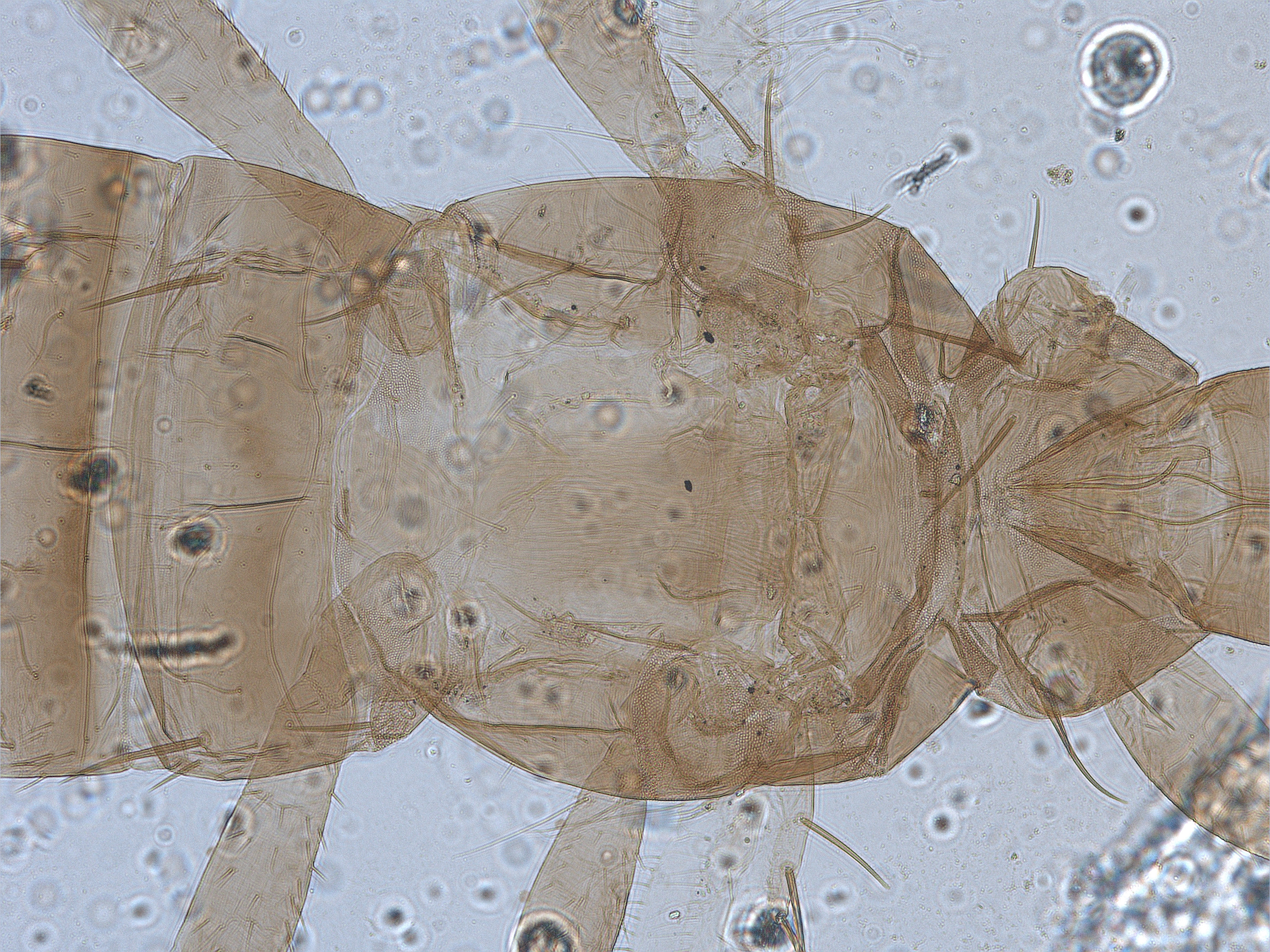 描述:雌虫(长翅型) 中型。体棕色。触角节II端部、节III、节IV~VI基部黄色,其余均棕色。前足胫跗节、中后足胫节端部和跗节黄色,其余均棕色。前翅略黄。主要鬃棕色。头长于宽。头顶在触角间不突出;单眼三角位于复眼间前半部,1对前单眼侧鬃较小,1对单眼间鬃稍大于侧鬃,位于前后单眼连线之外,2对单眼后鬃稍大于单眼间鬃,位于两后单眼之后,约等长于后单眼直径,单眼后鬃S2位于复眼后缘的延长线上;复眼一般,略小于头长的1/3,1对复眼后鬃发达,端部钝,等长于复眼;两颊近乎直,布满横线纹,颊背及侧缘约有18根小鬃,其中头背中部鬃1对,相似于单眼后鬃,位于复眼后鬃之间;口锥稍长,达前胸后部,端部钝圆,下颚须2节,口针细,缩入头内眼后鬃处,中部相互靠近;触角8节,节III~VI较长,节III长是宽的3倍,各节感觉锥数目:III具0+1,IV具1+21,V具1+1,VI具1+1,VII背端1个,各感觉锥适当大。前胸宽于长,背板较光滑,仅近前缘和近后缘有少许横线纹,后侧缝完全,前缘鬃发达,明显长于前角鬃,端部钝,侧鬃、后侧鬃和后角鬃发达,端部钝,后侧鬃内侧具1对微鬃,后缘鬃微小;腹面前下胸片缺,前基腹片较大,近似三角形。中胸背板除中后部光滑区外布满横网纹,2对钟形感觉器位于背板前半部,1对前侧鬃较发达,相似于1对中后鬃,2对后缘鬃位于后缘之前;中胸前小腹片中部仅一线相连,两侧呈三角形。后胸背板大部分具纵线纹,1对前缘鬃位于前角,仅几乎可见,1对前中鬃位于背板前半部,较发达,端部尖细;腹面光滑,内叉骨呈‘八’字,腹侧缝完全。各足具稀疏的横线纹,前足股节一般,跗节无齿,中后足一般。前翅似剑形,自基部向端部逐渐变窄,翅基鬃3对,S1~S3几乎等长,端部微钝,间插缨16~17根,翅缘缨毛直;后翅相似于前翅,但无间插缨和翅基鬃。腹部节I盾板近似三角形,具简单网纹,1对钟形感觉器位于两后角;节II~VII背板光滑,仅两侧具少许横线纹,各节具2对反曲的握翅鬃,后角具1对发达是粗鬃,1对中对鬃微小,仅几乎可见,其前内侧具1对钟形感觉器,均位于背板中部,各节背板两侧具3~4对较小鬃;节VIII仅在后角具1对长鬃;节IX背板中部具2对钟形感觉器,后缘长鬃端部尖细,均约等长于尾管;尾管两侧平直,光滑无纹,近前缘和近后缘分别具1对钟形感觉器,肛鬃均尖细,约等长于管;腹部节II~VIII腹板中部均具一排小的附属鬃,各节后缘鬃均位于后缘之前。