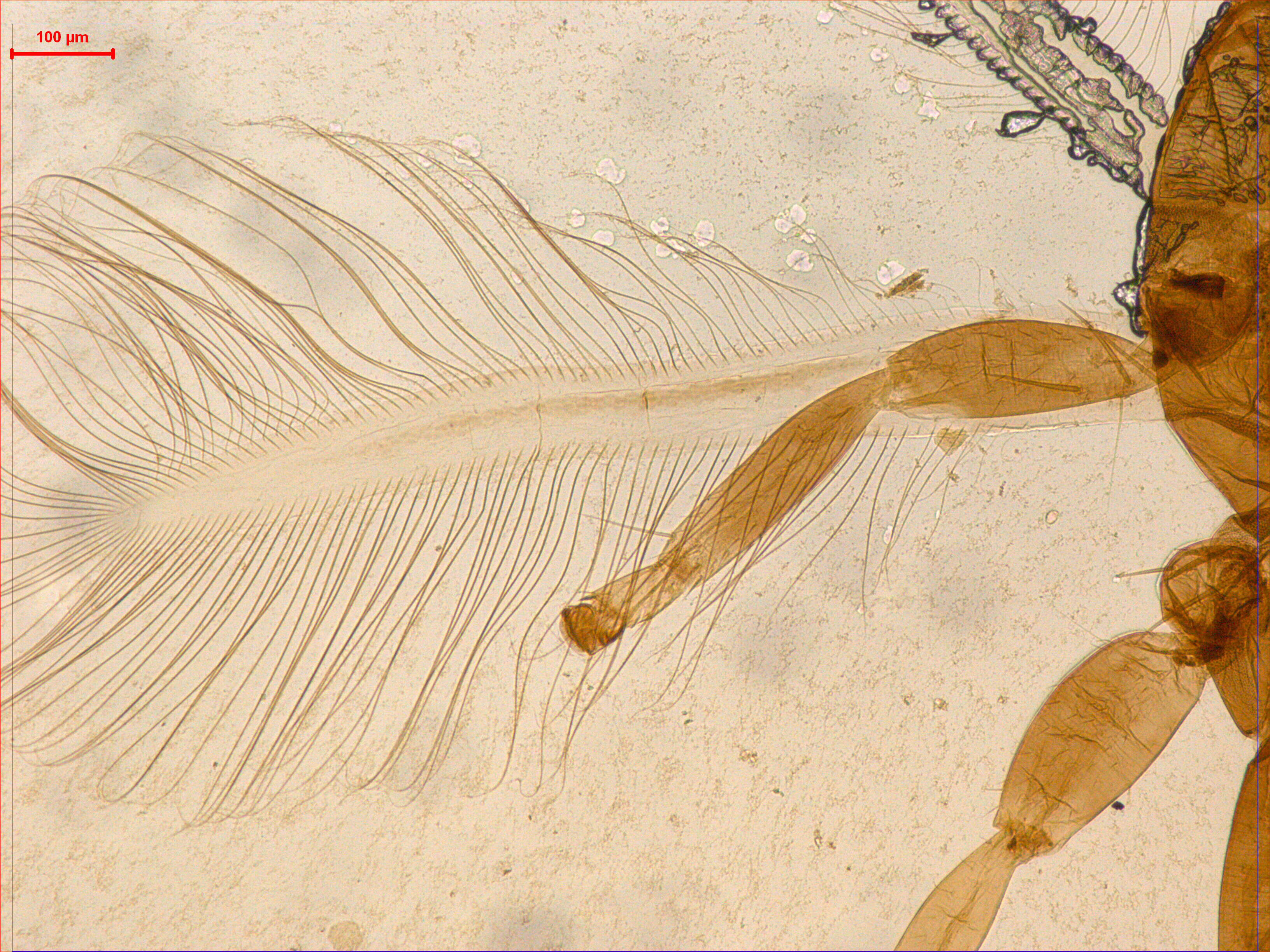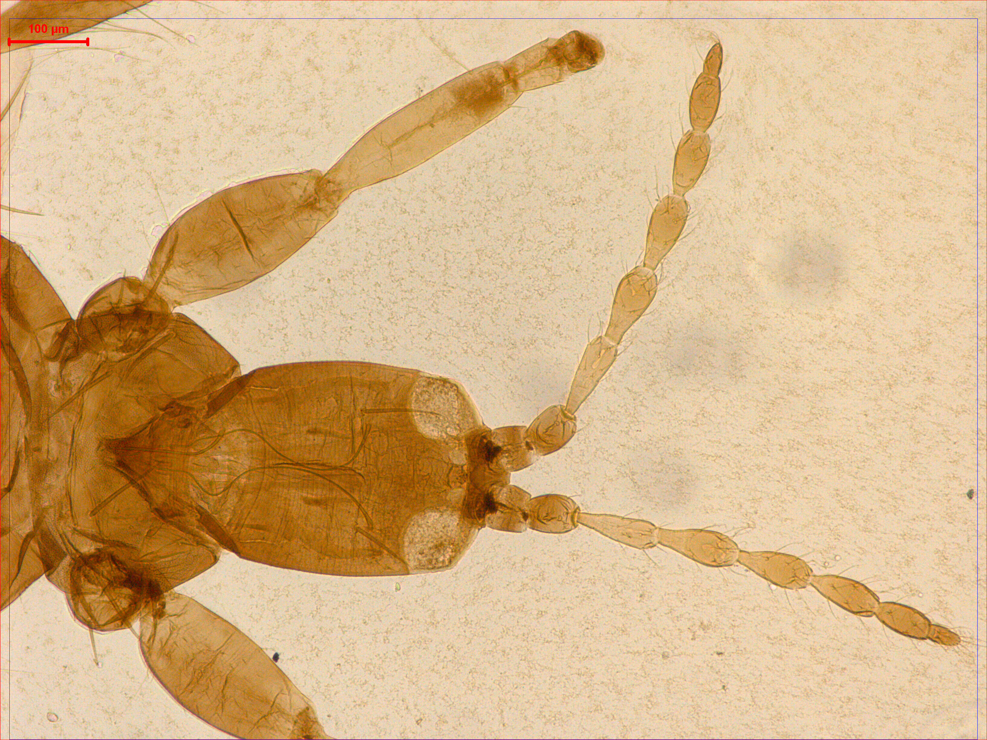 描述:雄虫(长翅型) 相似于雌虫;但体较小;腹部节IX背板后缘鬃S2明显短于S1和S3,长190,85,230。