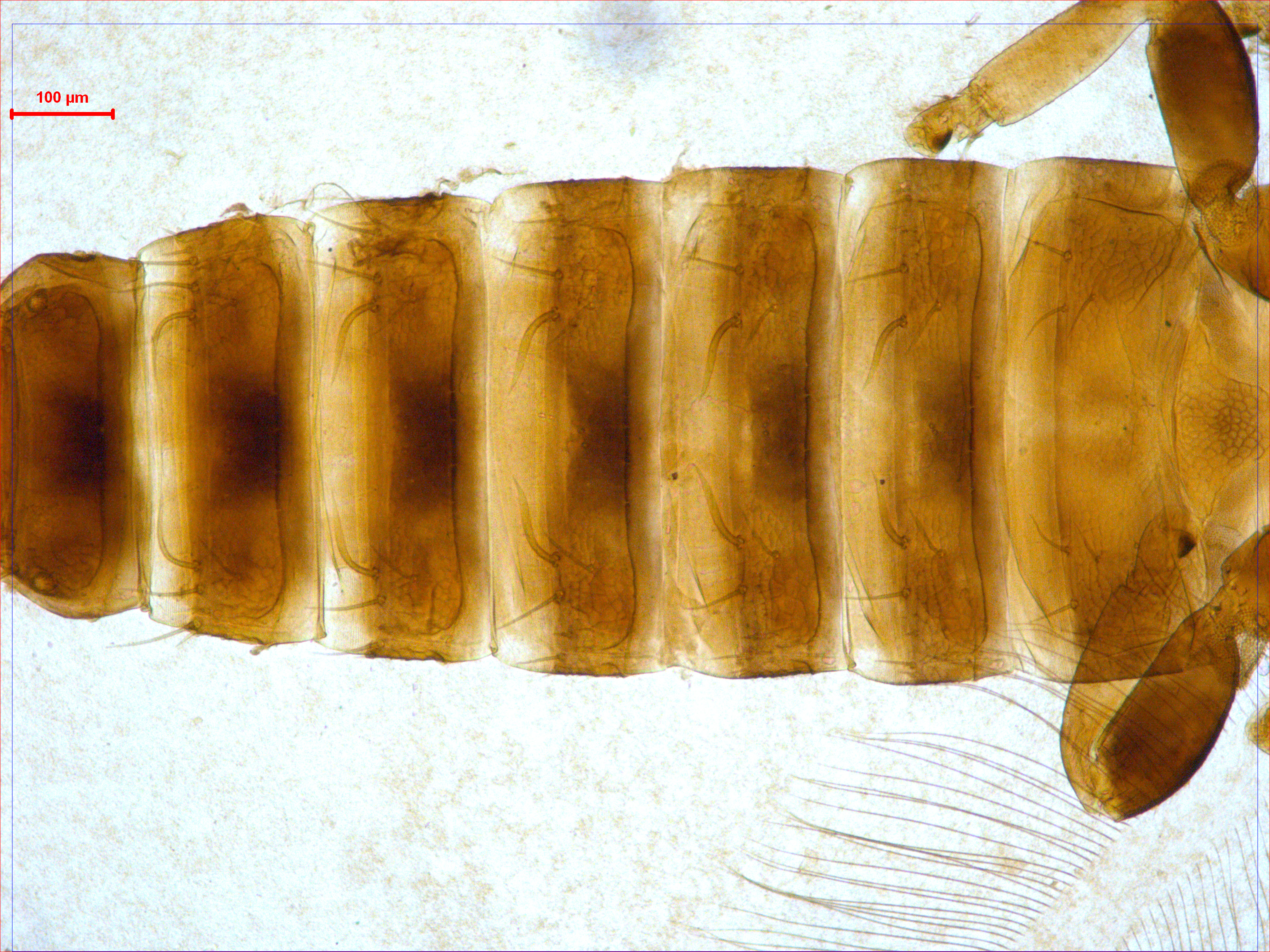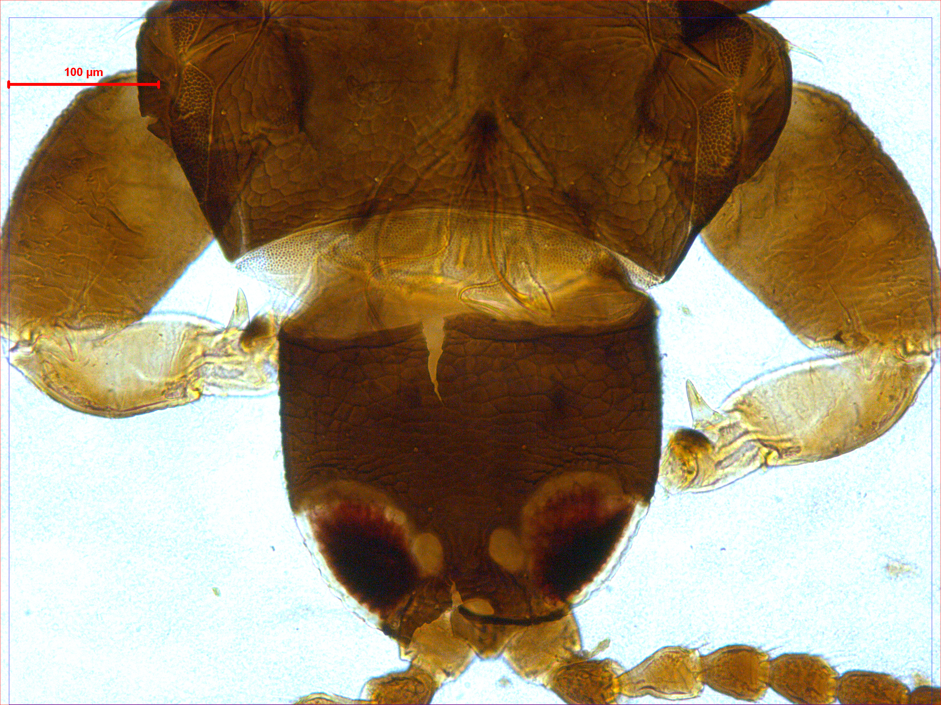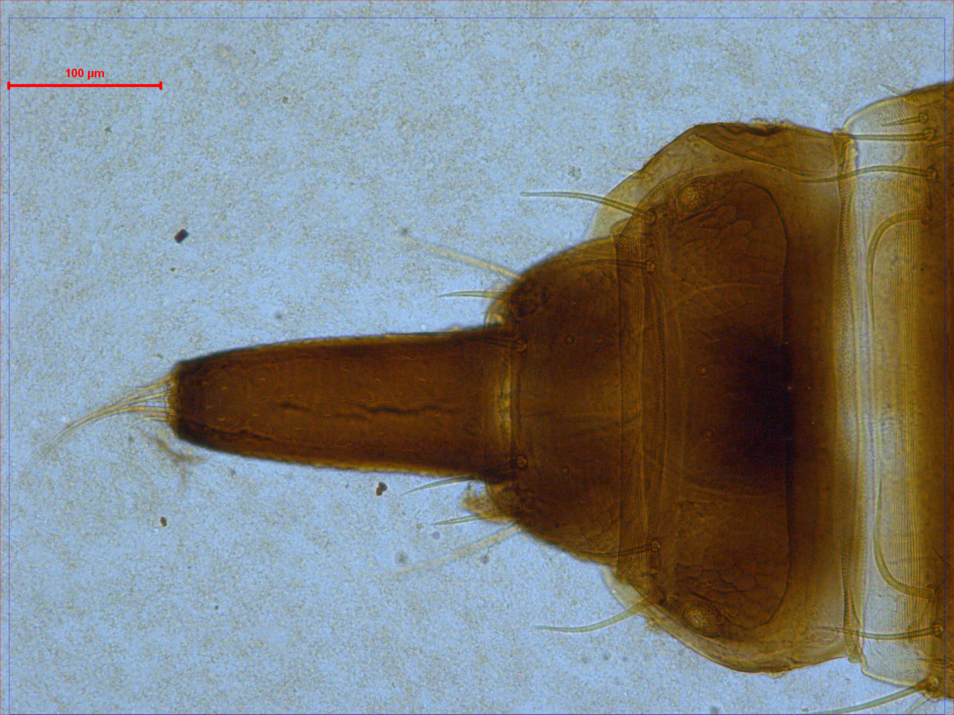 描述:雌虫(长翅型) 小型。体棕色至深棕色;触角节I和III较淡,其余节均棕色;各足胫节和跗节均黄色,其余节均深棕色;前翅微黄;腹部节III~VIII中部深棕色;主要鬃黄色。头宽于长;头顶在复眼间不延伸;单眼三角位于复眼间前半部,单眼鬃均微小;复眼较大,约为头长的一半,复眼后鬃3对,微小;头背布满大网纹;触角8节,较短粗,各节感觉锥数目:III具0+1,IV具1+2,V具1+1,VI具1+1,VII端部具1个;口锥短圆,下颚针深入头内较深,申达复眼处,间距较宽。前胸背板除中后部部分光滑区外布满网纹,中部深色纵线较短,后侧缝完全,1对后侧鬃和1对后角鬃较发达外,其余背鬃约30根,均微小;前下胸片缺,前基腹片发达,后角突起不明显。中胸背板近长方形,除中后部光滑外均布满网纹,近前缘具2对微小钟形感觉器,1对前侧鬃微小,1对中后鬃位于中部,1对后缘鬃位于后缘之前;中胸前小腹片中部仅一线相连。后胸背板布满网纹,1对前缘鬃位于前角,较小,1对前中鬃较发达,远离前缘,位于背板中部;腹侧缝存在。各足布满线纹,前足股节稍微膨大,跗节内缘端部具1对较长齿;中后足均无齿。前翅较宽,翅基鬃3对,均较小,S1和S2短于S3,间插缨12~17根。腹部节I盾片近似三角形,布满网纹,后角具1对钟形感觉器;节II~VI背板除中部深色区光滑外,布满网纹,各节具2对握翅鬃,S2甚大于S1,呈长矛状,1对中对鬃微小,其之间具1对相互靠近的钟形感觉器,1对后角鬃较发达,端部钝;节IX背板较光滑,3对后缘鬃较粗,短于尾管;尾管一般,光滑,肛鬃短于管;各节腹板刻纹轻于背板,近后缘具一排微鬃,3对后缘鬃均位于后缘之前。