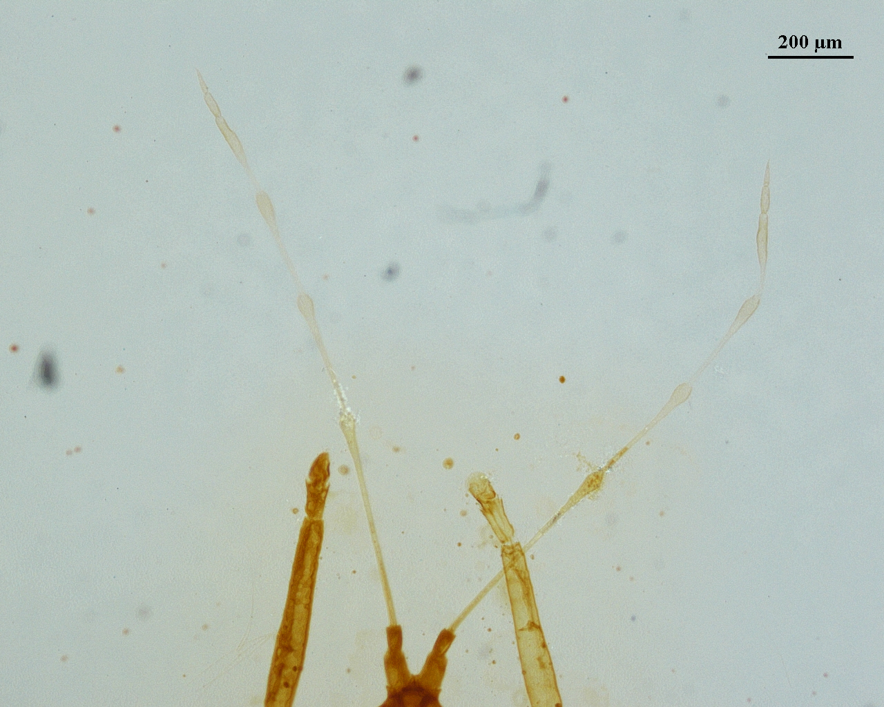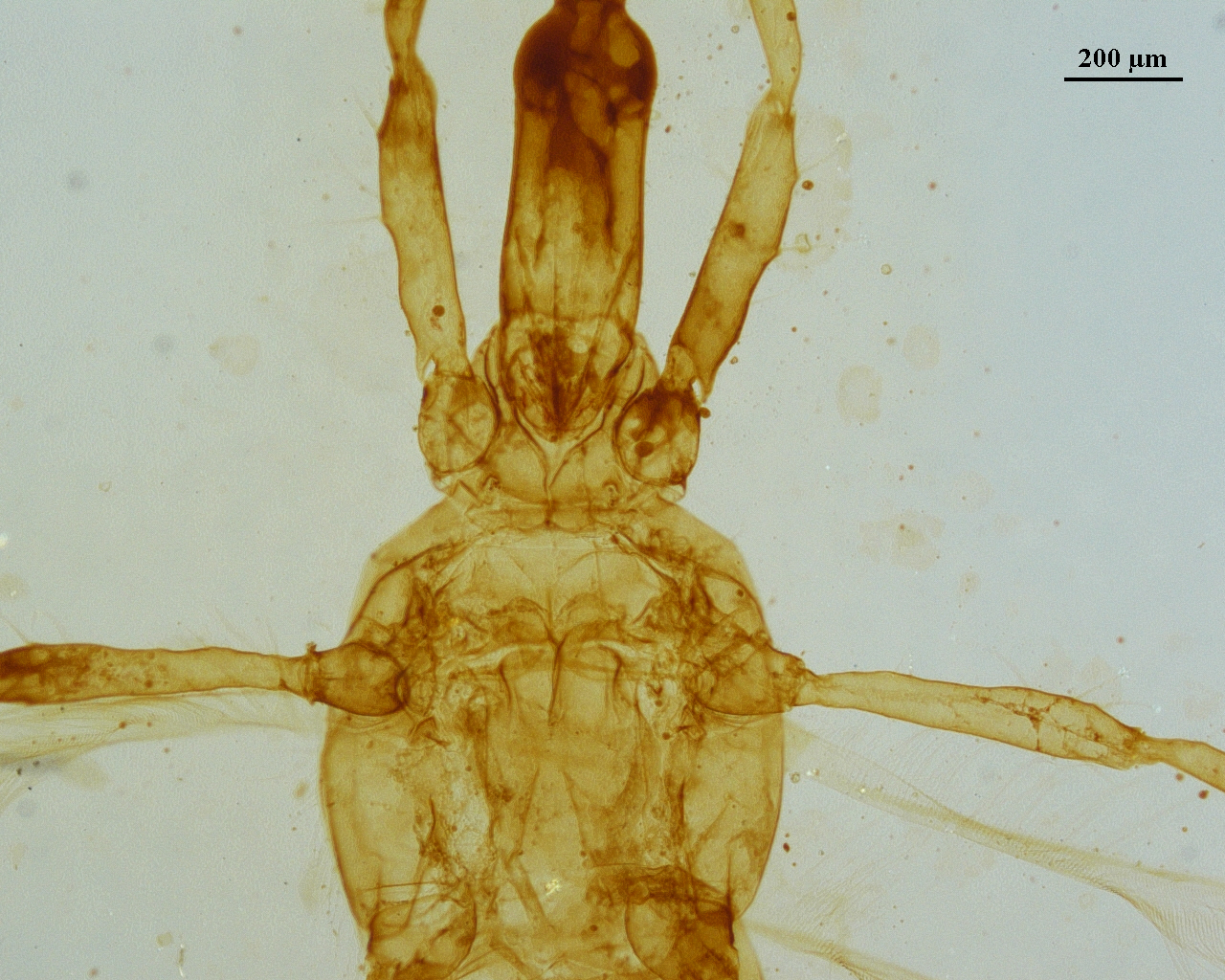 描述:雄虫(长翅型) 大型。棕色至深棕色;触角节I~II同体色,节III近端部和基半部黄色或灰白,其余均棕色,节IV~V除近端部具一灰白区域外,均棕色,节VI~VIII一致棕色;前翅微黄色或黄色,一条深色纵线自近基部伸达翅的2/3处,后翅相似于前翅,但较小;前中足股节同体色,后足股节中部黄色,但黄色区外缘棕色,其余均深棕色,各足胫节最基部黄色和最基部棕色,基部1/3为棕色,其余为黄色,各足跗节鬃黄色,较深于胫节端部;腹部尾管较深,黑棕色;体鬃黄色。头在复眼后稍微收缩,头顶在复眼前延伸,延伸部宽于长;单眼三角位于复眼间前半部,前单眼位于复眼前缘之前,两后单眼外缘紧贴复眼内缘,1对单眼间鬃较发达,端部微钝,位于前后单眼外缘连线上,1对单眼后鬃较发达,约为后单眼直径的1.5倍,甚短于单眼间鬃,端部尖而不锐;复眼发达,约为头长的1/3,复眼后鬃位于复眼后内缘线延伸部,短于单眼间鬃但相似于单眼后鬃,其后具1对发达的头背中部鬃,端部微钝,甚长于单眼间鬃,是头部最长鬃;两颊布满横线纹,具约6对鬃;头腹面光滑,近前缘和中部分别具1对长鬃,近后缘具2对长鬃。口锥短圆,下颚针缩入头内1/3处,呈‘V’形,下颚桥缺。触角8节,节III~V细长,端部稍微膨大呈球棒状,节I~II端部1对鬃端部微钝,各节感觉锥数目:III具1+1,IV具2+2,V具12+1,VI具12+03,VII腹端1个,节III感觉锥甚长于该节端部宽。前胸背板较光滑,后侧缝不完全,主要鬃端部微钝,前缘鬃相似于前角鬃,前角鬃远离侧鬃,前缘具1~2对小鬃,后侧鬃发达,内侧具1对微小鬃,不足后侧鬃的1/3,后角鬃发达,稍长于后侧鬃,后缘鬃较细,相似于后侧鬃内附属鬃;前下胸片围绕口锥端部,前基腹片发达,具横线纹。中胸背板较光滑,前半部具不清晰的网纹,无钟形感觉器,前外侧鬃发达,端部微钝,中后鬃1对,位于背板中部,后缘鬃2对,S1细长,位于中后鬃之后,相互靠近,S2甚短于S1,位于后缘之前;中胸前小腹片船型,具横线纹,中峰突出。后胸背板前中部光滑吧,后部布满不清晰的网纹,两侧为纵网纹,1对前缘鬃较细长,之外有2对小鬃,1对前中鬃发达,短于后胸背板,端部微钝;后胸腹侧缝缺。前翅翅基鬃3对,S1长于S2,S3最长,端部均微钝,间插缨56根。各足一般,不膨大,各足股节具7~8对刺状鬃,胫节和跗节均无齿,后足股节浅色区较细。腹节I盾片中部近似馒头形,但最前缘较尖,具纵网纹,两侧叶发达,具横网纹,连接处很宽;节II~VII各具2对握翅鬃,各节前半部为网纹,后半部为细密的横线纹,后角具2对发达的长鬃,端部钝,前角具3~4对附属鬃;腹部节VI两侧具1对发达的延伸物,基部黑棕色,其余均红棕色;节VII和VIII侧缘均具1对角小的齿突,节VIII齿突稍大于节VII的;节IX后缘长鬃较短,S2甚短于其他两对;尾管细长,背面具大小不等的突起,中部两列较大,向两侧逐渐变小,肛鬃较短;腹板节II~IX具附属鬃,排列不规则,节II具2对后缘鬃,节III~VIII具3对,均长于后缘之前。