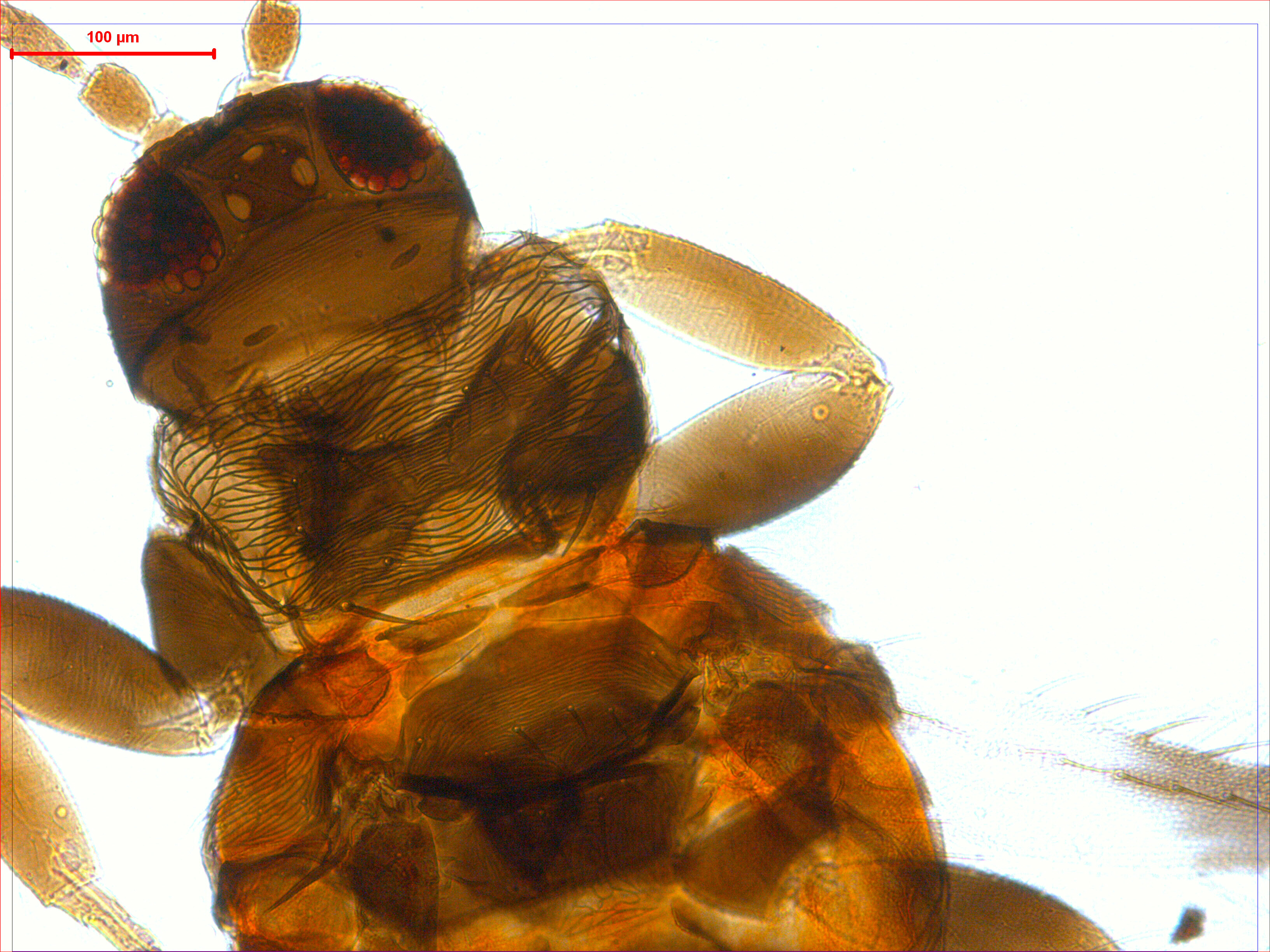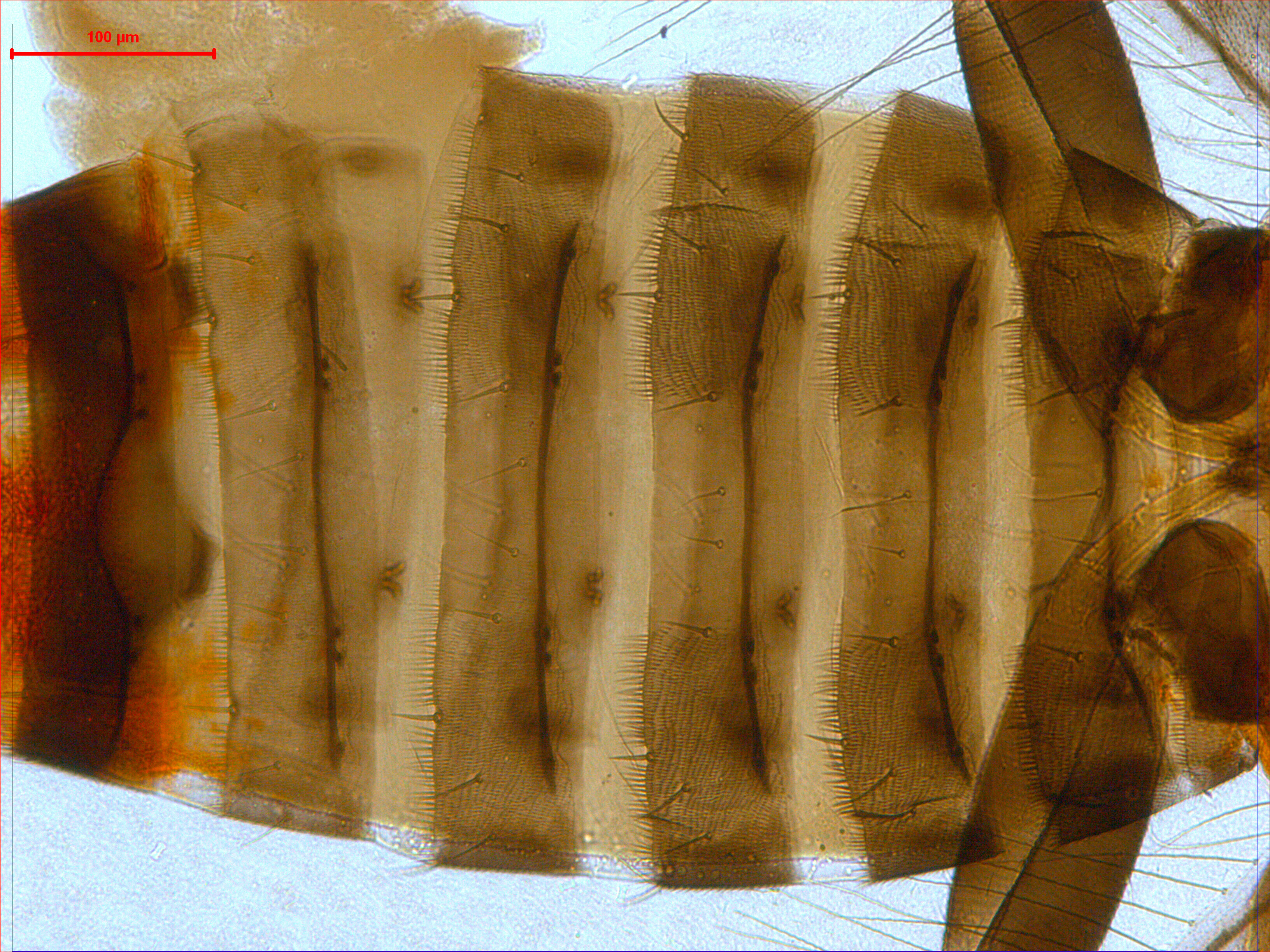 描述:雌虫:体暗棕色;触角节I-II黄色,III-IV基半部暗黄,节IV端半部和V-VIII棕色,前胸骨化板周围较淡;前足胫节、中后足胫节端部、各足股节两端及跗节暗黄,前翅近基部有无色淡带,约占翅长1/9,翅基部及中部最暗,端半部较浅;腹部节I-VI及X浅棕色,两侧暗,节VII-IX暗棕色,节II-VIII前脊线粗而暗,两侧前缘各有黑点3个,其中2个相互靠近,位于有毛区内缘。头背脊线沿复眼后缘分隔一个后头区,区内具7-10条交错横线,单眼区有线纹;口锥细,下颚须3节,下唇须2节;触角8节,节III-IV感觉锥叉状,节VI内侧简单感觉锥基部与该节愈合。前胸骨化板两侧角向前延伸呈锐角,中部收缩,被横交错线构成的网纹包围,背板内有密交错横线纹,但有几个光滑区,背板边缘鬃中后缘鬃最长且粗;后胸背板前部具横线纹,中部有几个纵网纹,后部具几条横线纹,两个细孔微小,在前中部相互靠近;前翅前缘鬃33根,前脉鬃3+18根,后脉鬃1根,翅瓣前缘鬃5根;后胸腹板似新月形,中部向后凹,但不呈‘V’形,前缘线较深。腹部节I-VIII背板两侧密布微毛,中部缺,但节IV向后数节中部有少数微毛,节VIII显著增多;节I-VI两侧后缘有梳毛,节VII-VIII后缘梳毛完整,节I-VIII背板中对鬃自前向后长度逐渐增加,间距逐渐扩大;节IV-VII背板每侧鬃数是2+1+2+1;腹板节II-VII两侧有微毛,毛区占腹板宽度1/4,节III-VII两侧缘各有1对暗斑,腹板无附属鬃。