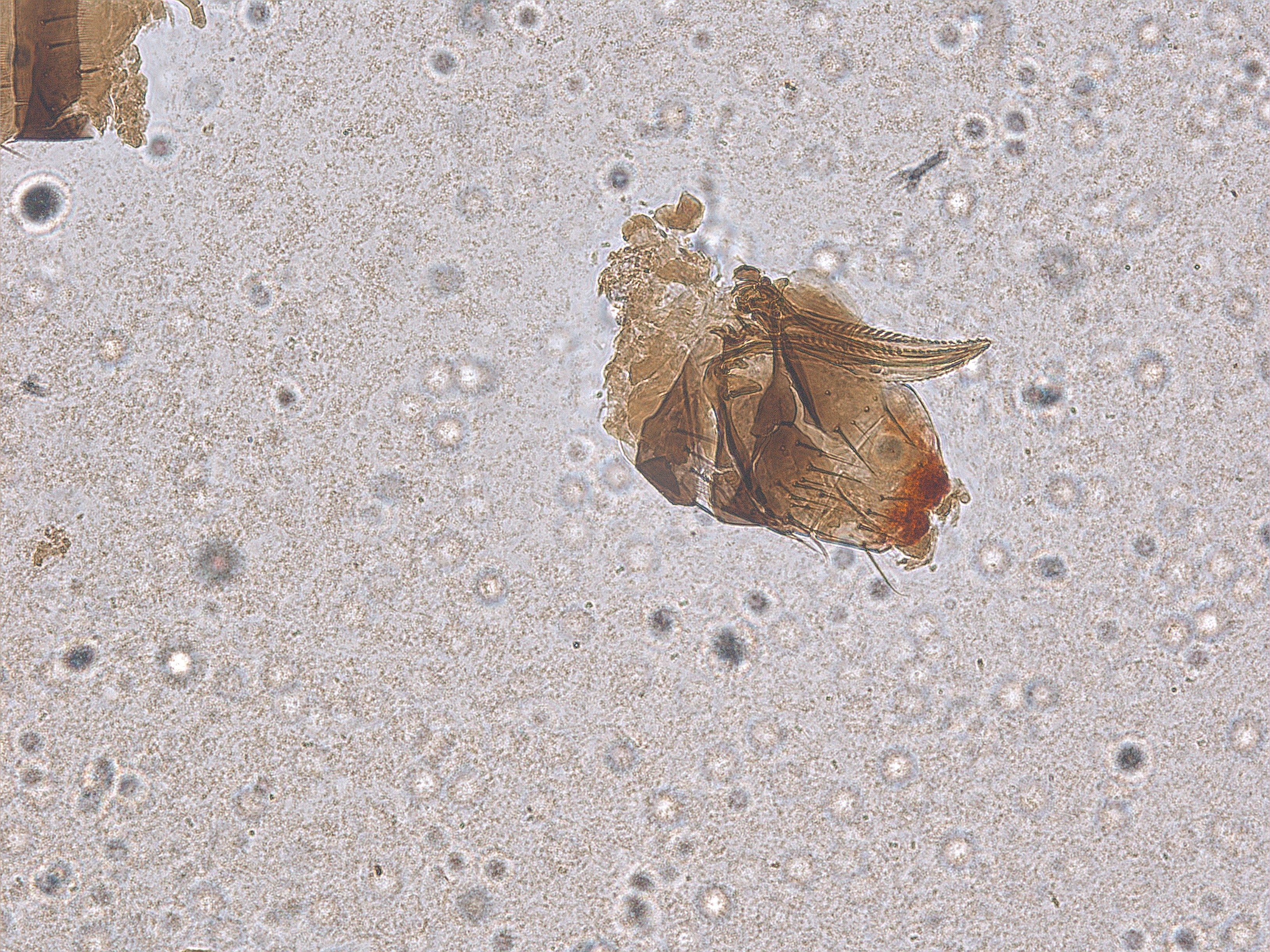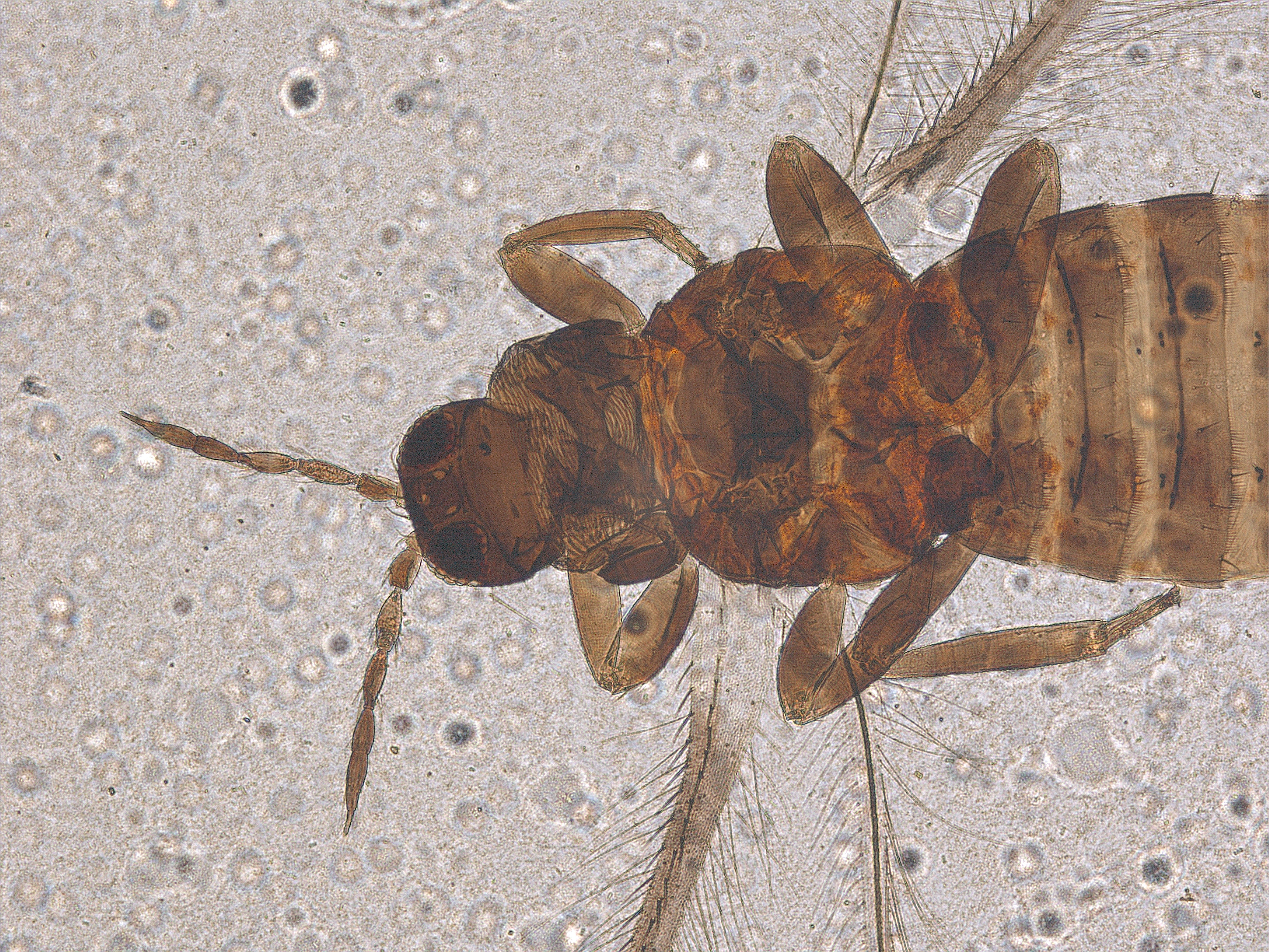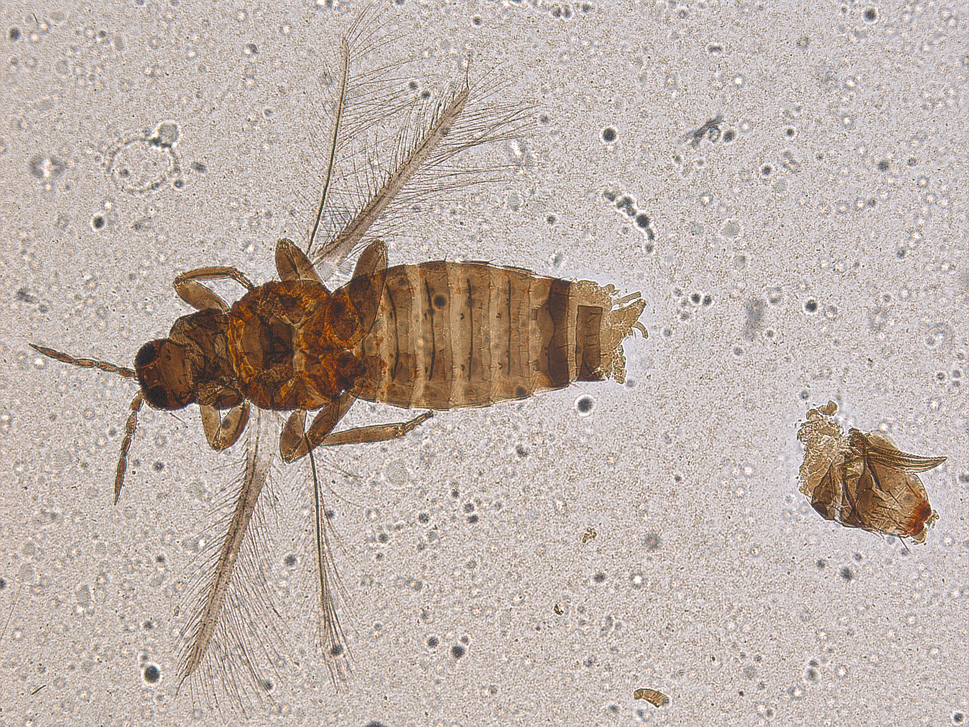 描述:雌虫:体暗棕色;触角节I-II黄色,III-IV基半部暗黄,节IV端半部和V-VIII棕色,前胸骨化板周围较淡;前足胫节、中后足胫节端部、各足股节两端及跗节暗黄,前翅近基部有无色淡带,约占翅长1/9,翅基部及中部最暗,端半部较浅;腹部节I-VI及X浅棕色,两侧暗,节VII-IX暗棕色,节II-VIII前脊线粗而暗,两侧前缘各有黑点3个,其中2个相互靠近,位于有毛区内缘。头背脊线沿复眼后缘分隔一个后头区,区内具7-10条交错横线,单眼区有线纹;口锥细,下颚须3节,下唇须2节;触角8节,节III-IV感觉锥叉状,节VI内侧简单感觉锥基部与该节愈合。前胸骨化板两侧角向前延伸呈锐角,中部收缩,被横交错线构成的网纹包围,背板内有密交错横线纹,但有几个光滑区,背板边缘鬃中后缘鬃最长且粗;后胸背板前部具横线纹,中部有几个纵网纹,后部具几条横线纹,两个细孔微小,在前中部相互靠近;前翅前缘鬃33根,前脉鬃3+18根,后脉鬃1根,翅瓣前缘鬃5根;后胸腹板似新月形,中部向后凹,但不呈‘V’形,前缘线较深。腹部节I-VIII背板两侧密布微毛,中部缺,但节IV向后数节中部有少数微毛,节VIII显著增多;节I-VI两侧后缘有梳毛,节VII-VIII后缘梳毛完整,节I-VIII背板中对鬃自前向后长度逐渐增加,间距逐渐扩大;节IV-VII背板每侧鬃数是2+1+2+1;腹板节II-VII两侧有微毛,毛区占腹板宽度1/4,节III-VII两侧缘各有1对暗斑,腹板无附属鬃。