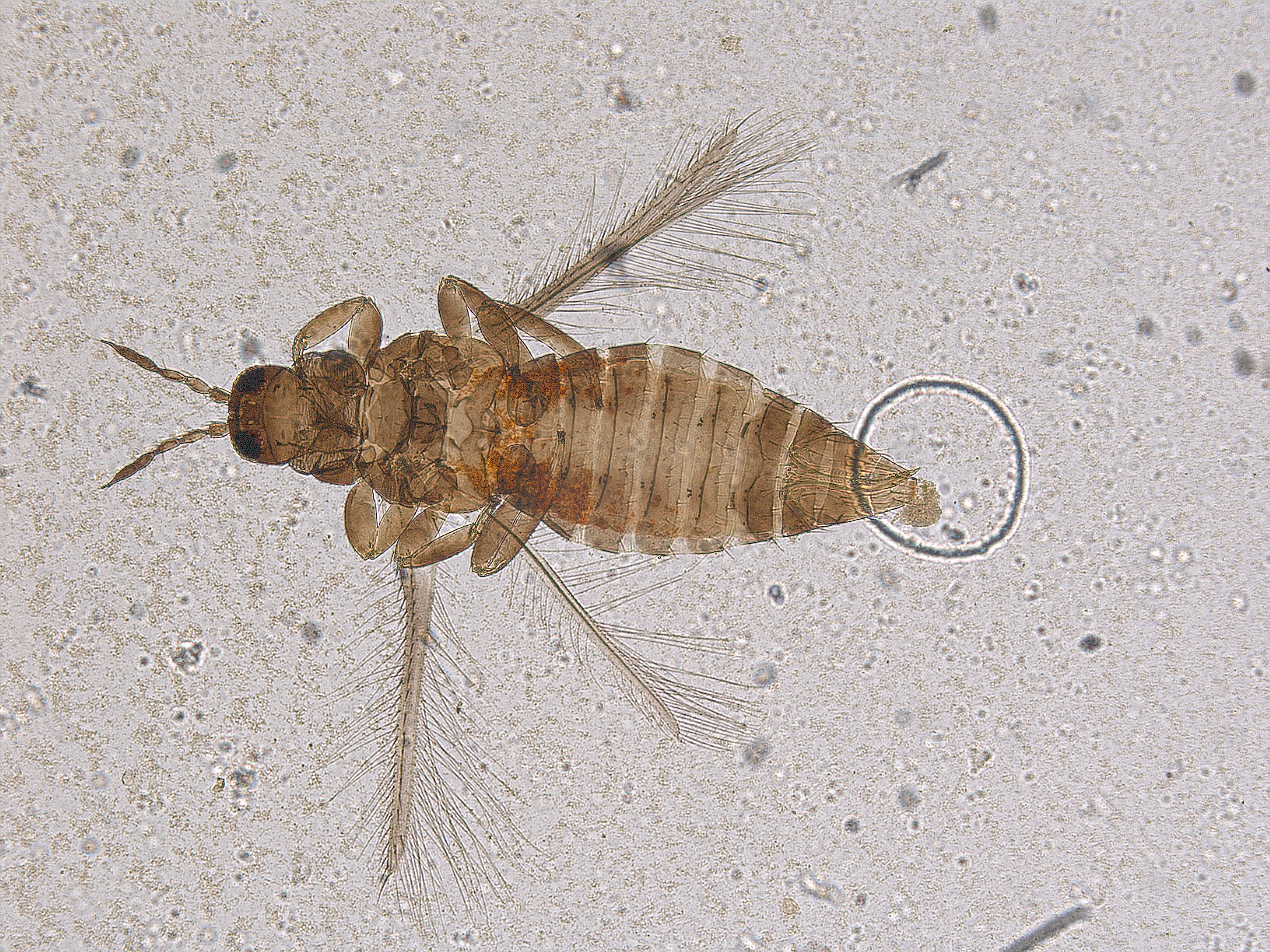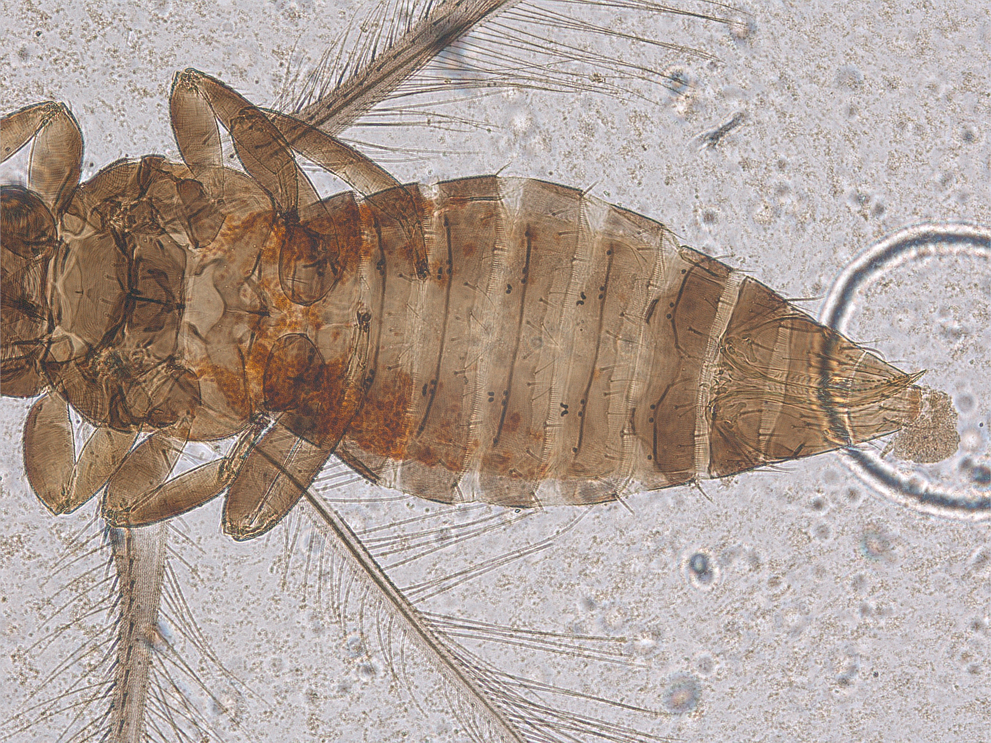 描述:雌虫:体暗棕色;触角节I-II黄色,III-IV基半部暗黄,节IV端半部和V-VIII棕色,前胸骨化板周围较淡;前足胫节、中后足胫节端部、各足股节两端及跗节暗黄,前翅近基部有无色淡带,约占翅长1/9,翅基部及中部最暗,端半部较浅;腹部节I-VI及X浅棕色,两侧暗,节VII-IX暗棕色,节II-VIII前脊线粗而暗,两侧前缘各有黑点3个,其中2个相互靠近,位于有毛区内缘。头背脊线沿复眼后缘分隔一个后头区,区内具7-10条交错横线,单眼区有线纹;口锥细,下颚须3节,下唇须2节;触角8节,节III-IV感觉锥叉状,节VI内侧简单感觉锥基部与该节愈合。前胸骨化板两侧角向前延伸呈锐角,中部收缩,被横交错线构成的网纹包围,背板内有密交错横线纹,但有几个光滑区,背板边缘鬃中后缘鬃最长且粗;后胸背板前部具横线纹,中部有几个纵网纹,后部具几条横线纹,两个细孔微小,在前中部相互靠近;前翅前缘鬃33根,前脉鬃3+18根,后脉鬃1根,翅瓣前缘鬃5根;后胸腹板似新月形,中部向后凹,但不呈‘V’形,前缘线较深。腹部节I-VIII背板两侧密布微毛,中部缺,但节IV向后数节中部有少数微毛,节VIII显著增多;节I-VI两侧后缘有梳毛,节VII-VIII后缘梳毛完整,节I-VIII背板中对鬃自前向后长度逐渐增加,间距逐渐扩大;节IV-VII背板每侧鬃数是2+1+2+1;腹板节II-VII两侧有微毛,毛区占腹板宽度1/4,节III-VII两侧缘各有1对暗斑,腹板无附属鬃。