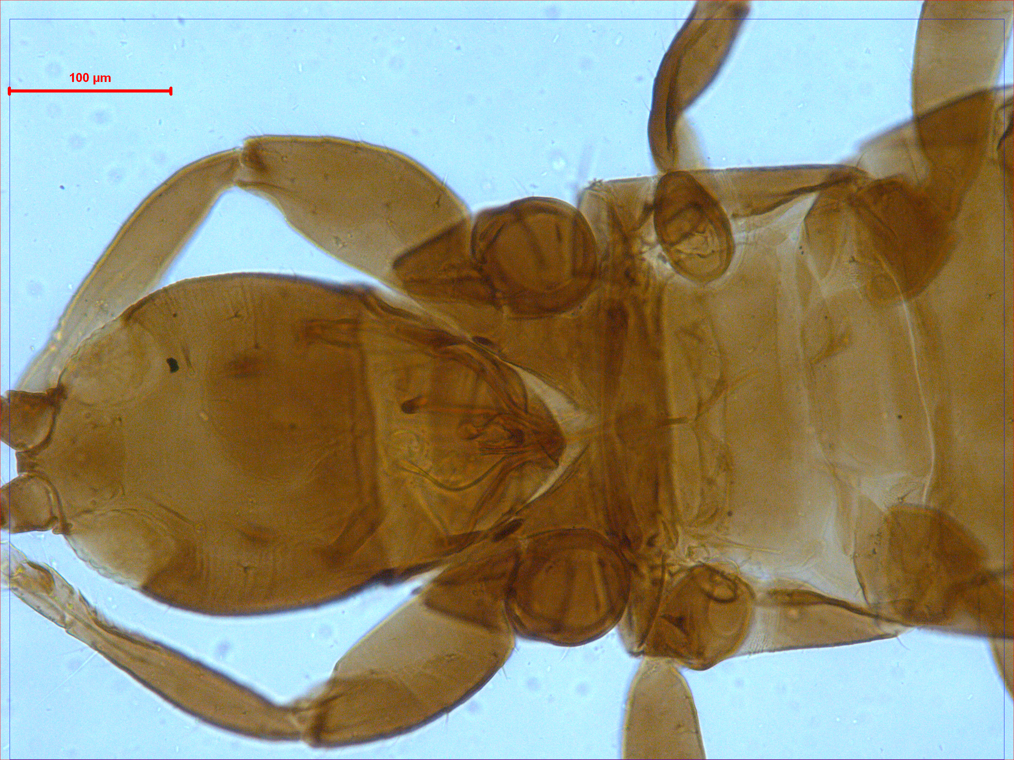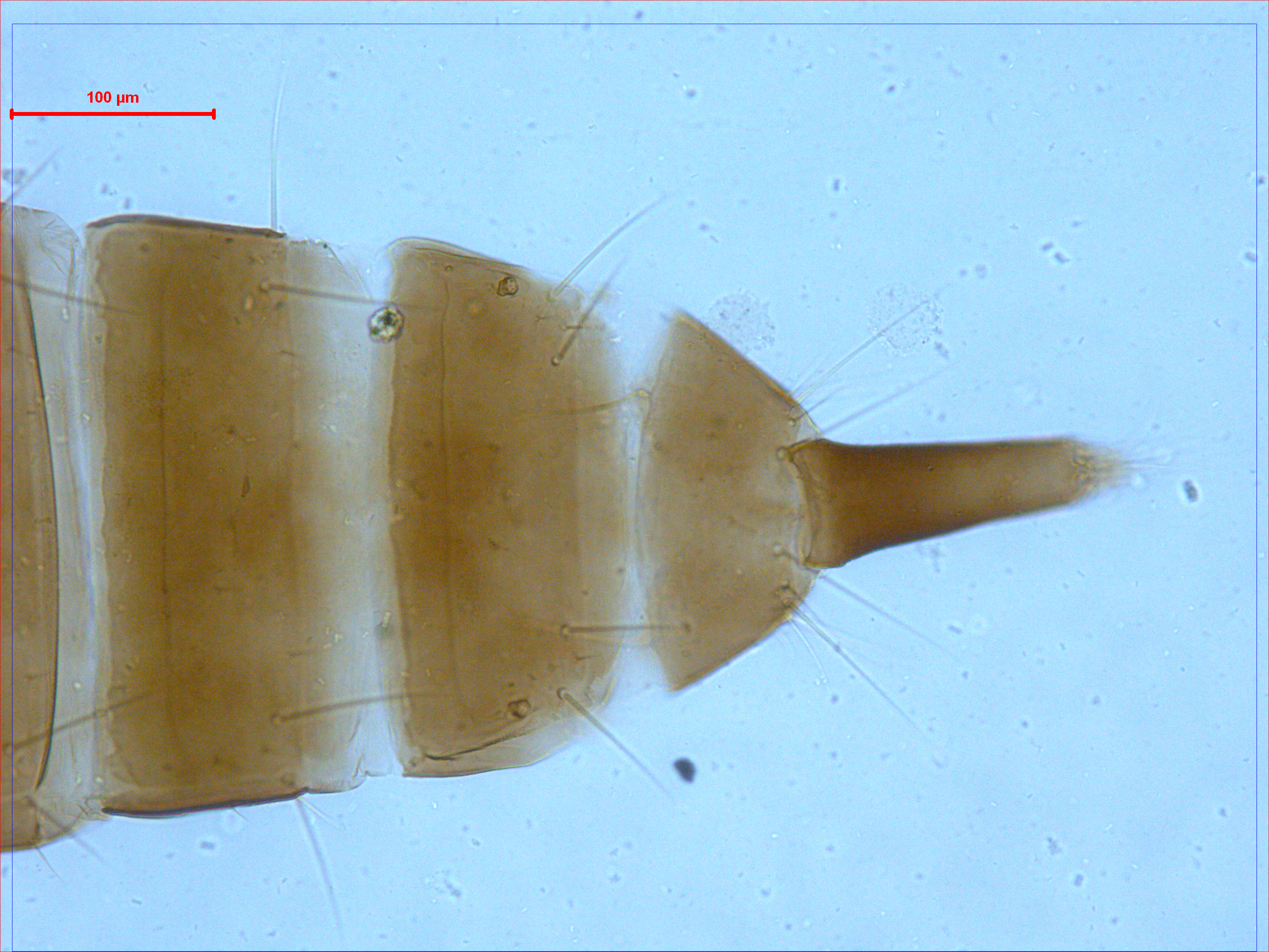 描述:雌虫(无翅型) 中型。体棕色。触角节III~V最基部较浅,其余均棕色。各足胫节最端部和跗节棕黄色。主要鬃棕色。头等长于最宽处,头顶在复眼间略微延伸;单眼缺,具3对微小单眼鬃;复眼较小,稍大于触角节I,背腹面对称,1对复眼后鬃发达,但短于复眼,端部尖细,位于复眼内缘线延线上;颊在复眼后显著外拱,两侧具横线纹,颊中部具1对小鬃,端部尖细,约为复眼后鬃的1/3,其余颊鬃约5对;头腹面光滑,近后缘具1对长鬃。口锥端部钝圆,口针缩入头内复眼后鬃处,下颚桥缺。触角8节,节III~VIII基部梗短,各节感觉锥数目:III具1+1,IV具2+2,V具1+1,VI具1+01,VII腹端1个。前胸背板较光滑,仅近后缘具少数横线纹,后侧缝不完全,前缘鬃较发达,相似于前角鬃,前侧鬃、后侧鬃和后角鬃发达,端部钝,后缘鬃微小,位于后缘之前,其他小鬃约3对,其中1对位于后侧鬃内侧;腹面前下胸片和前基腹片发达,前基腹片后角突起不明显。中胸背板前缘平直,具横线纹,前侧鬃微小,1对中后鬃位于背板中部,2对后缘鬃微小,位于后缘上;中胸前小腹片横条状,中峰缺。后胸背板光滑,前角具1对微鬃,1对前中鬃位于前半部,端部尖细;腹面光滑,腹侧缝缺。各足一般,无齿。腹部节I盾片发达,近乎长方形,光滑无纹,后角具1对微小的钟形感觉器;节II~VII后角鬃发达,端部钝,其余鬃均微小,1对中对鬃位于背板中部,钟形感觉器缺;节IX后缘长鬃短于管,背板具2对钟形感觉器;尾管较短,光滑平直,基部宽于端部,肛鬃较短;腹板具一横排附属鬃,后缘鬃均位于后缘之前。