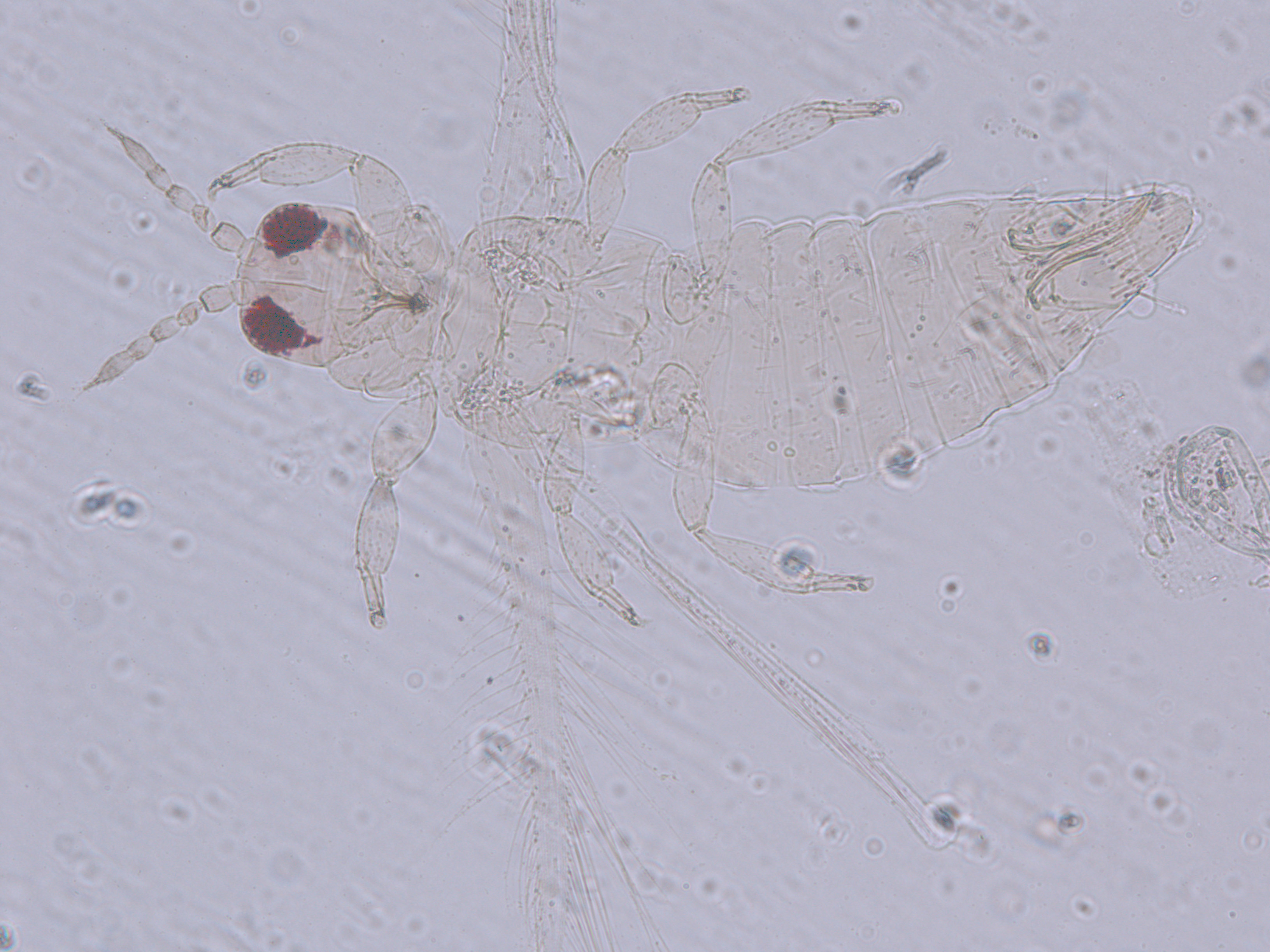 描述:雌虫:体浅黄色,复眼黑红,触角节IV-VI端部和VII-VIII浅灰色;口锥端部、各足跗节端部及产卵器较深。头略短于前胸,前单眼前外侧、单眼间及头后部有交错横线纹;复眼大占据头长的2/3;单眼呈扁三角形排列,位于复眼间略后部;前单眼鬃2对,其1对位于近复眼前内缘,另1对在前单眼前外侧;单眼间鬃位于前、后单眼中途内缘连线上;单眼和复眼后鬃约6对;触角8节,节III略短于IV和VI,节III背和IV腹面有短的叉状感觉锥,节V和VI外端、VI内侧各有简单感觉锥1个;各节近端背面和侧面有较长刚毛,节II-VI有密横排微毛;幕骨小。前胸背板密布横交错线纹于背板,但侧部有3个小的,后中部两侧有一大而横的及一小的无纹区;无长鬃;中胸背板前缘光滑,前部横纹略向前弯,后部两侧侧横线纹各自向中后延伸;前部细孔移位至两侧;前外侧对鬃不长于后中对鬃和后缘对鬃,后中对鬃位于中部,后缘对鬃向前移,接近后中对鬃;后胸背板中部纵网纹清楚,其前和两侧的纵网纹轻而模糊,网纹两侧密布纵弯线纹;前缘对鬃与前中对鬃的长度相似,均在前缘上;前翅前缘鬃22根,前脉鬃6+3,后脉鬃2根,翅瓣前缘端半部鬃4根,后基部有鬃1根,后端缘有长鬃2根;各足各节刚毛相当长但无粗刺。腹部节I-VIII背板两侧密布微毛,中部无毛区较宽,无线纹,约为有毛区宽度的一半;节VII和VIII背板后缘梳完整;细孔距微毛区较劲,中对鬃在其内后方;节IX后缘之前有6对鬃呈弧形排列;节X后部有鬃4对;股节背板和腹板前缘线几乎不可见,腹板节II-VII两侧微毛区宽度总和不及光滑区宽度;节II-VII腹板有细横纹;节II后缘鬃2对,接近后缘,节III-VIII后缘3对鬃较长,远离后缘至前中部,无附属鬃。