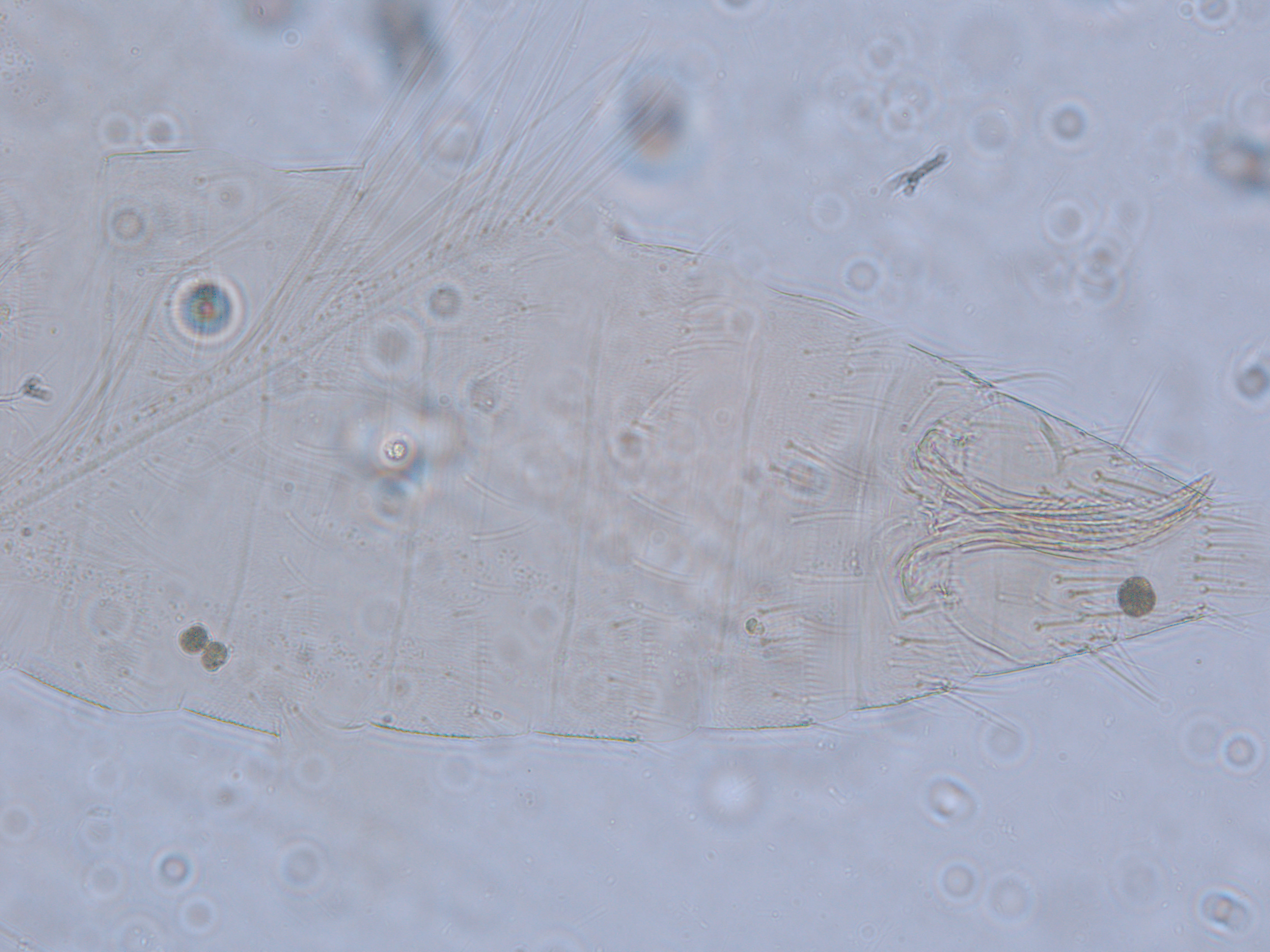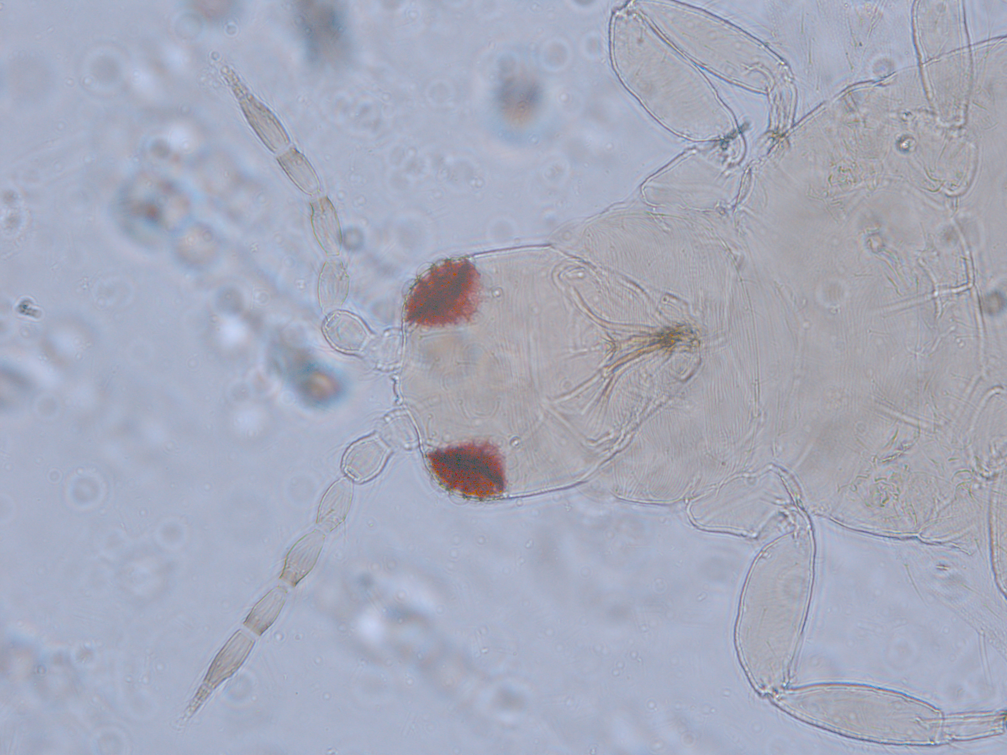 描述:雌虫:体浅黄色,复眼黑红,触角节IV-VI端部和VII-VIII浅灰色;口锥端部、各足跗节端部及产卵器较深。头略短于前胸,前单眼前外侧、单眼间及头后部有交错横线纹;复眼大占据头长的2/3;单眼呈扁三角形排列,位于复眼间略后部;前单眼鬃2对,其1对位于近复眼前内缘,另1对在前单眼前外侧;单眼间鬃位于前、后单眼中途内缘连线上;单眼和复眼后鬃约6对;触角8节,节III略短于IV和VI,节III背和IV腹面有短的叉状感觉锥,节V和VI外端、VI内侧各有简单感觉锥1个;各节近端背面和侧面有较长刚毛,节II-VI有密横排微毛;幕骨小。前胸背板密布横交错线纹于背板,但侧部有3个小的,后中部两侧有一大而横的及一小的无纹区;无长鬃;中胸背板前缘光滑,前部横纹略向前弯,后部两侧侧横线纹各自向中后延伸;前部细孔移位至两侧;前外侧对鬃不长于后中对鬃和后缘对鬃,后中对鬃位于中部,后缘对鬃向前移,接近后中对鬃;后胸背板中部纵网纹清楚,其前和两侧的纵网纹轻而模糊,网纹两侧密布纵弯线纹;前缘对鬃与前中对鬃的长度相似,均在前缘上;前翅前缘鬃22根,前脉鬃6+3,后脉鬃2根,翅瓣前缘端半部鬃4根,后基部有鬃1根,后端缘有长鬃2根;各足各节刚毛相当长但无粗刺。腹部节I-VIII背板两侧密布微毛,中部无毛区较宽,无线纹,约为有毛区宽度的一半;节VII和VIII背板后缘梳完整;细孔距微毛区较劲,中对鬃在其内后方;节IX后缘之前有6对鬃呈弧形排列;节X后部有鬃4对;股节背板和腹板前缘线几乎不可见,腹板节II-VII两侧微毛区宽度总和不及光滑区宽度;节II-VII腹板有细横纹;节II后缘鬃2对,接近后缘,节III-VIII后缘3对鬃较长,远离后缘至前中部,无附属鬃。