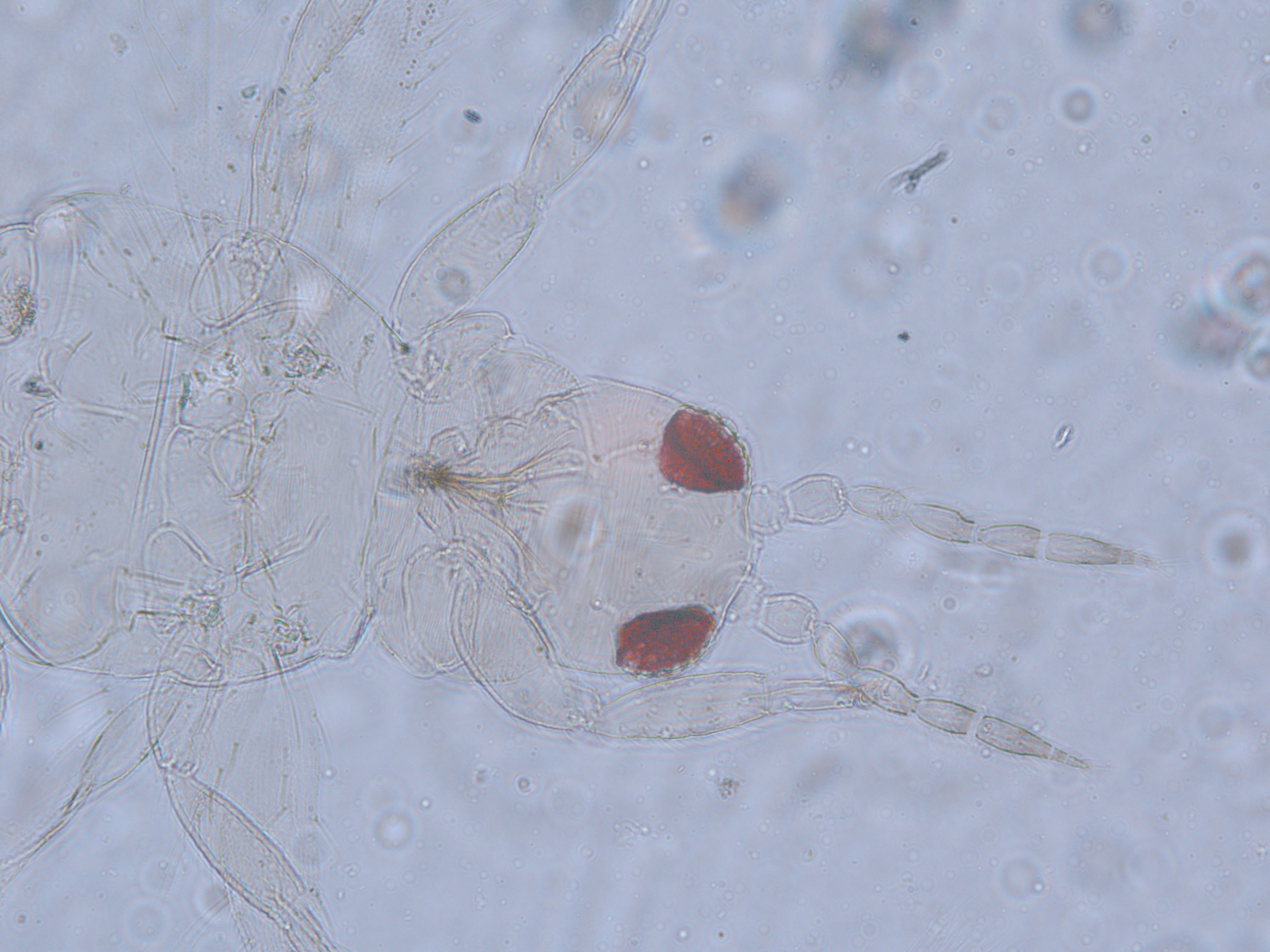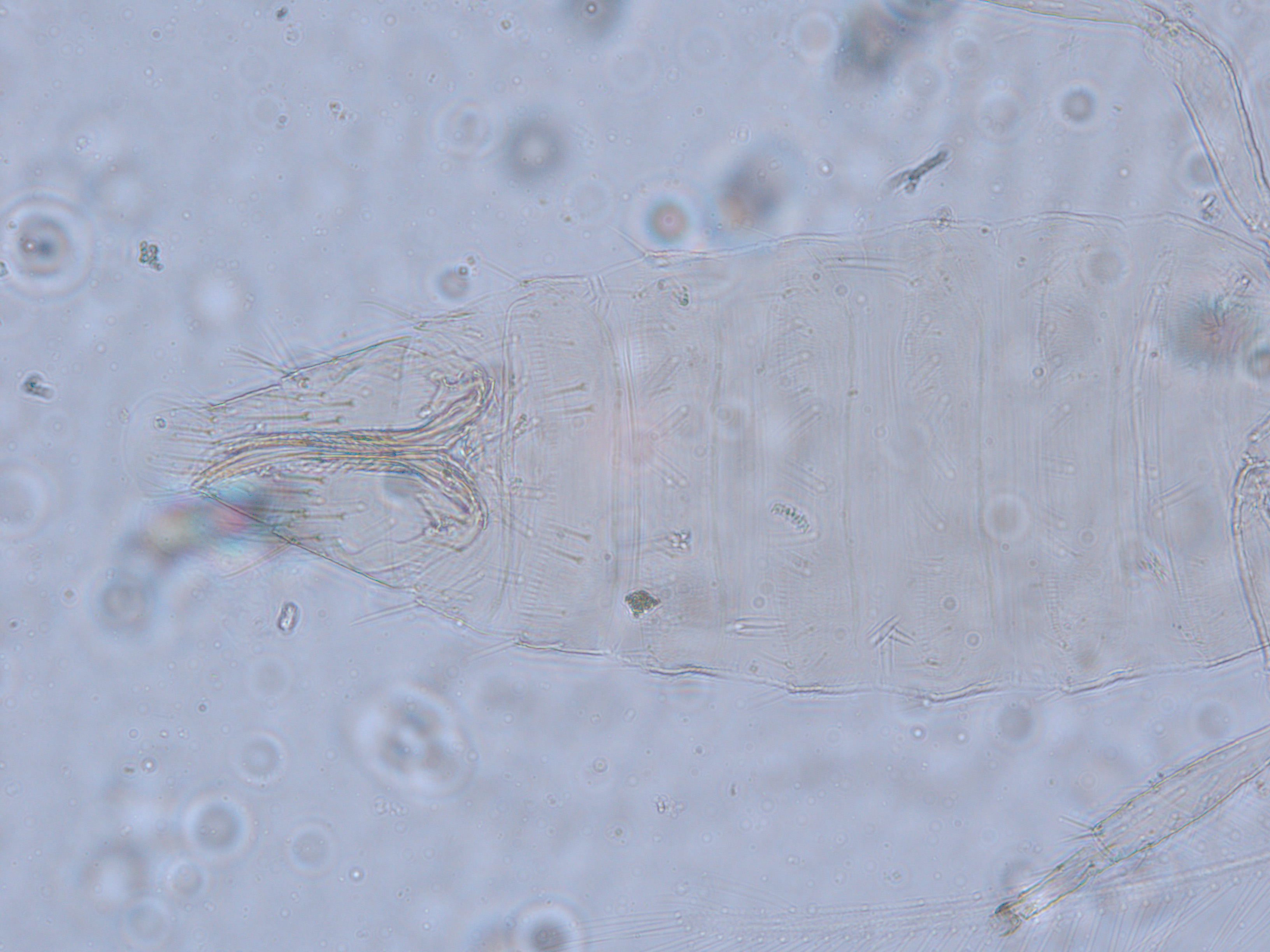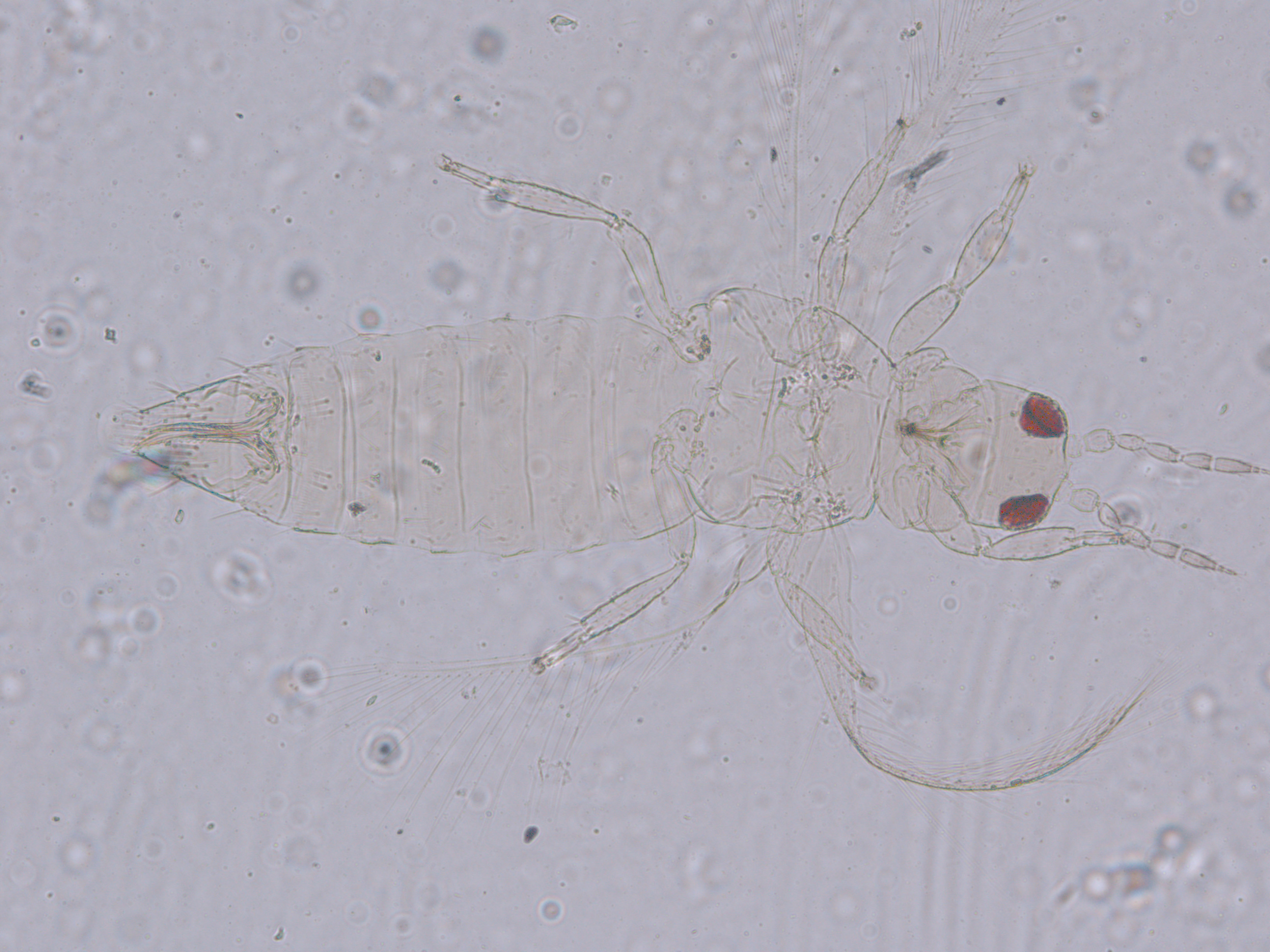 描述:雌虫:体浅黄色,复眼黑红,触角节IV-VI端部和VII-VIII浅灰色;口锥端部、各足跗节端部及产卵器较深。头略短于前胸,前单眼前外侧、单眼间及头后部有交错横线纹;复眼大占据头长的2/3;单眼呈扁三角形排列,位于复眼间略后部;前单眼鬃2对,其1对位于近复眼前内缘,另1对在前单眼前外侧;单眼间鬃位于前、后单眼中途内缘连线上;单眼和复眼后鬃约6对;触角8节,节III略短于IV和VI,节III背和IV腹面有短的叉状感觉锥,节V和VI外端、VI内侧各有简单感觉锥1个;各节近端背面和侧面有较长刚毛,节II-VI有密横排微毛;幕骨小。前胸背板密布横交错线纹于背板,但侧部有3个小的,后中部两侧有一大而横的及一小的无纹区;无长鬃;中胸背板前缘光滑,前部横纹略向前弯,后部两侧侧横线纹各自向中后延伸;前部细孔移位至两侧;前外侧对鬃不长于后中对鬃和后缘对鬃,后中对鬃位于中部,后缘对鬃向前移,接近后中对鬃;后胸背板中部纵网纹清楚,其前和两侧的纵网纹轻而模糊,网纹两侧密布纵弯线纹;前缘对鬃与前中对鬃的长度相似,均在前缘上;前翅前缘鬃22根,前脉鬃6+3,后脉鬃2根,翅瓣前缘端半部鬃4根,后基部有鬃1根,后端缘有长鬃2根;各足各节刚毛相当长但无粗刺。腹部节I-VIII背板两侧密布微毛,中部无毛区较宽,无线纹,约为有毛区宽度的一半;节VII和VIII背板后缘梳完整;细孔距微毛区较劲,中对鬃在其内后方;节IX后缘之前有6对鬃呈弧形排列;节X后部有鬃4对;股节背板和腹板前缘线几乎不可见,腹板节II-VII两侧微毛区宽度总和不及光滑区宽度;节II-VII腹板有细横纹;节II后缘鬃2对,接近后缘,节III-VIII后缘3对鬃较长,远离后缘至前中部,无附属鬃。
