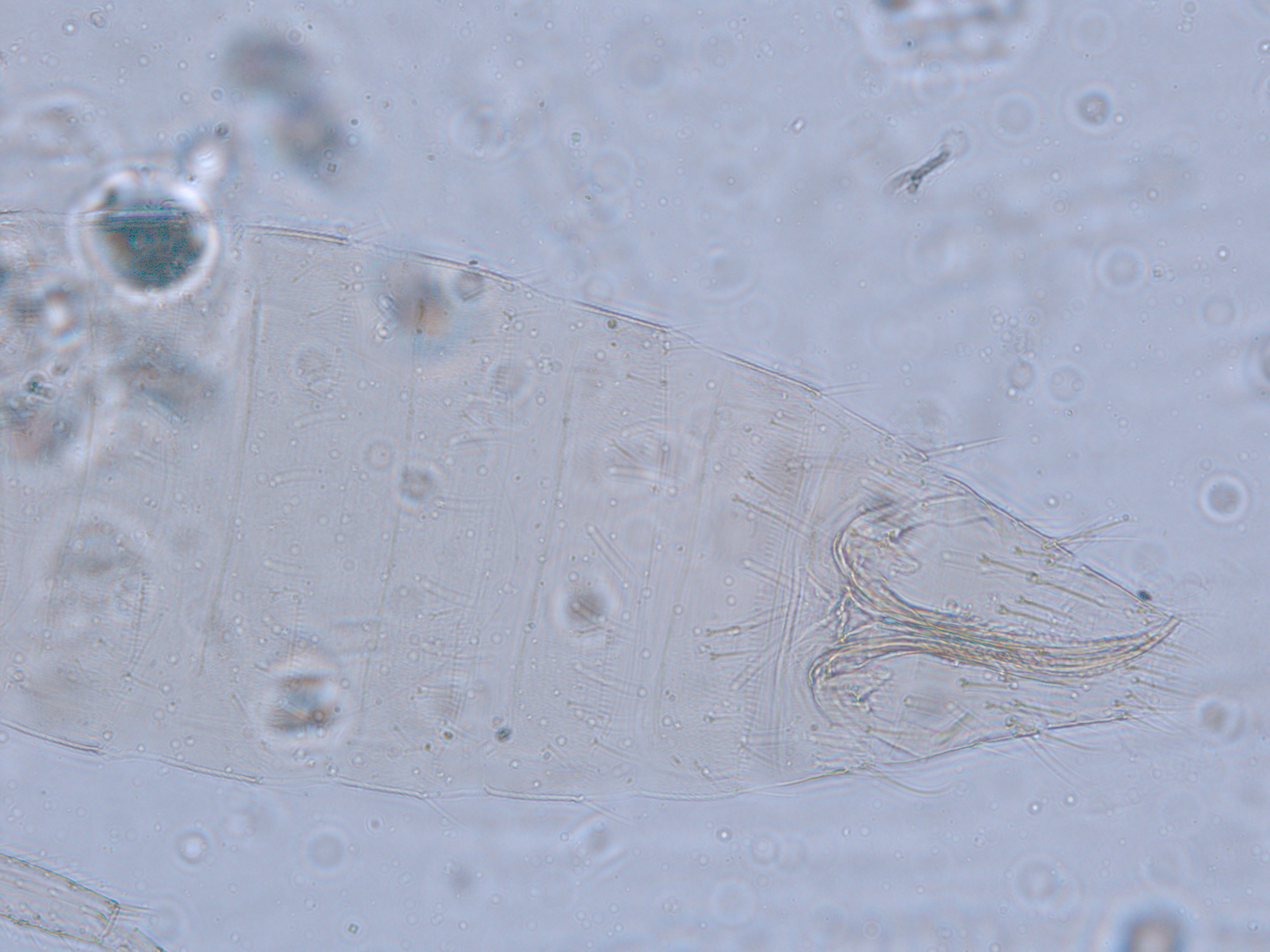 描述:雌虫:体浅黄色,复眼黑红,触角节IV-VI端部和VII-VIII浅灰色;口锥端部、各足跗节端部及产卵器较深。头略短于前胸,前单眼前外侧、单眼间及头后部有交错横线纹;复眼大占据头长的2/3;单眼呈扁三角形排列,位于复眼间略后部;前单眼鬃2对,其1对位于近复眼前内缘,另1对在前单眼前外侧;单眼间鬃位于前、后单眼中途内缘连线上;单眼和复眼后鬃约6对;触角8节,节III略短于IV和VI,节III背和IV腹面有短的叉状感觉锥,节V和VI外端、VI内侧各有简单感觉锥1个;各节近端背面和侧面有较长刚毛,节II-VI有密横排微毛;幕骨小。前胸背板密布横交错线纹于背板,但侧部有3个小的,后中部两侧有一大而横的及一小的无纹区;无长鬃;中胸背板前缘光滑,前部横纹略向前弯,后部两侧侧横线纹各自向中后延伸;前部细孔移位至两侧;前外侧对鬃不长于后中对鬃和后缘对鬃,后中对鬃位于中部,后缘对鬃向前移,接近后中对鬃;后胸背板中部纵网纹清楚,其前和两侧的纵网纹轻而模糊,网纹两侧密布纵弯线纹;前缘对鬃与前中对鬃的长度相似,均在前缘上;前翅前缘鬃22根,前脉鬃6+3,后脉鬃2根,翅瓣前缘端半部鬃4根,后基部有鬃1根,后端缘有长鬃2根;各足各节刚毛相当长但无粗刺。腹部节I-VIII背板两侧密布微毛,中部无毛区较宽,无线纹,约为有毛区宽度的一半;节VII和VIII背板后缘梳完整;细孔距微毛区较劲,中对鬃在其内后方;节IX后缘之前有6对鬃呈弧形排列;节X后部有鬃4对;股节背板和腹板前缘线几乎不可见,腹板节II-VII两侧微毛区宽度总和不及光滑区宽度;节II-VII腹板有细横纹;节II后缘鬃2对,接近后缘,节III-VIII后缘3对鬃较长,远离后缘至前中部,无附属鬃。