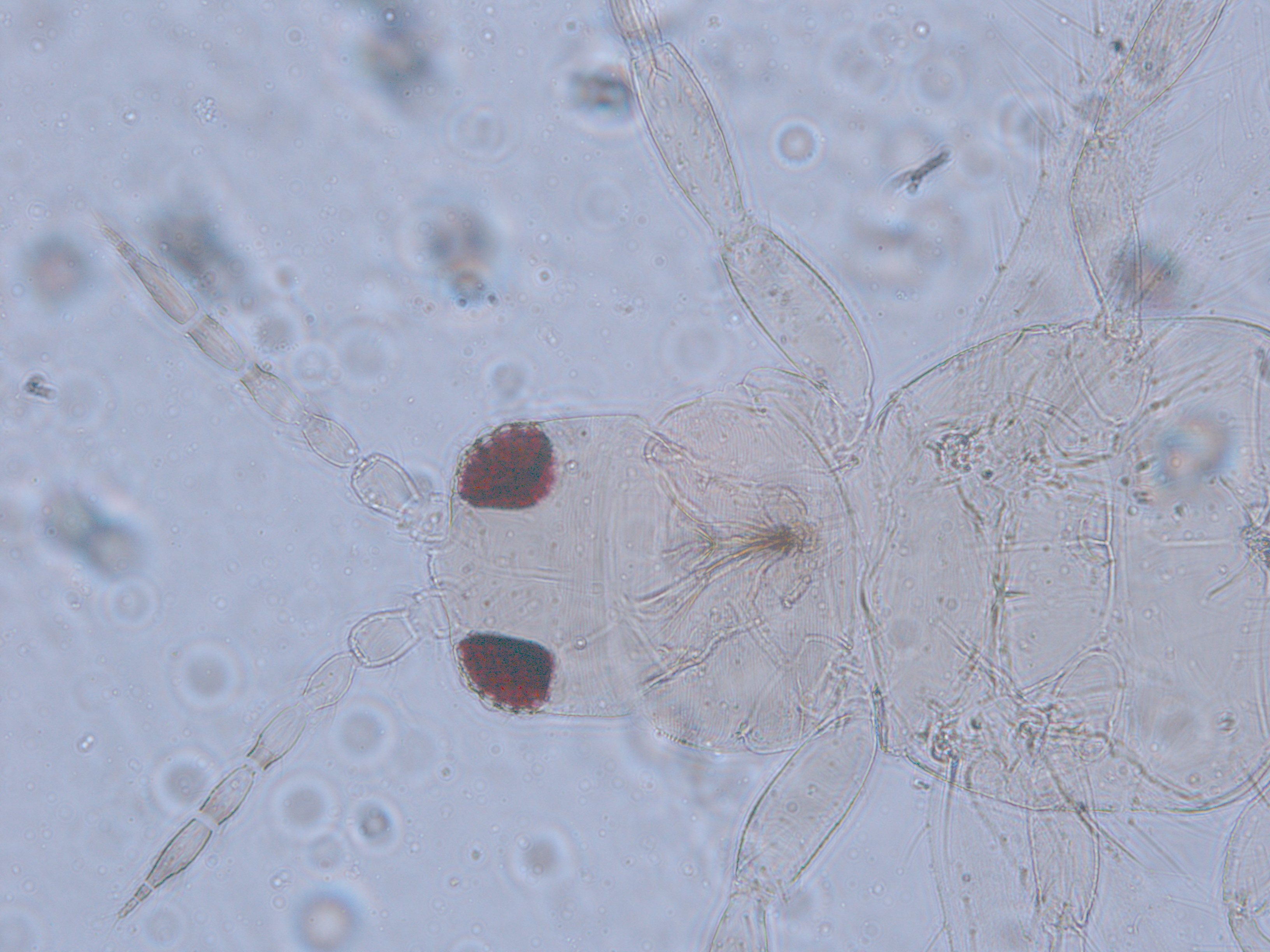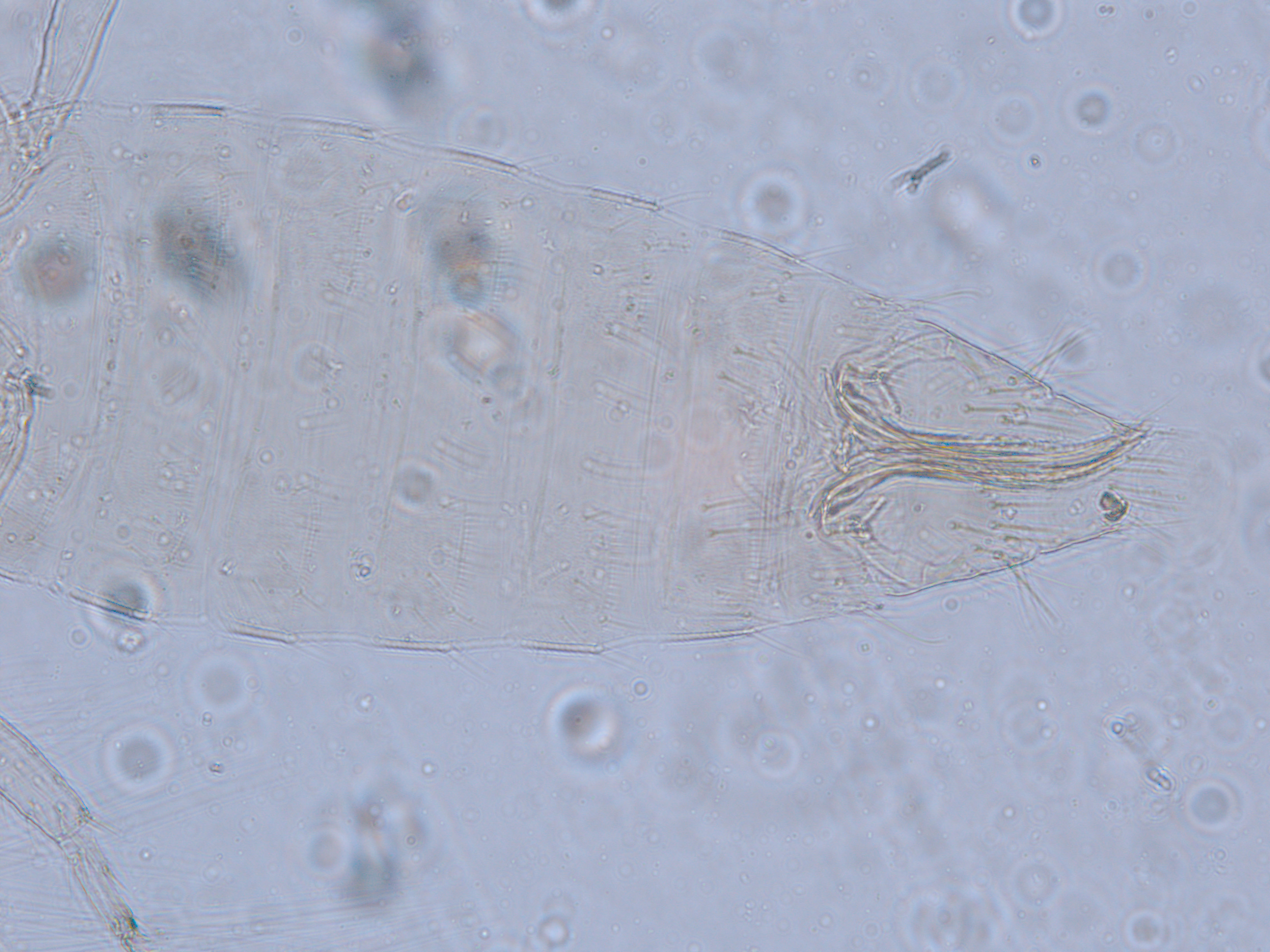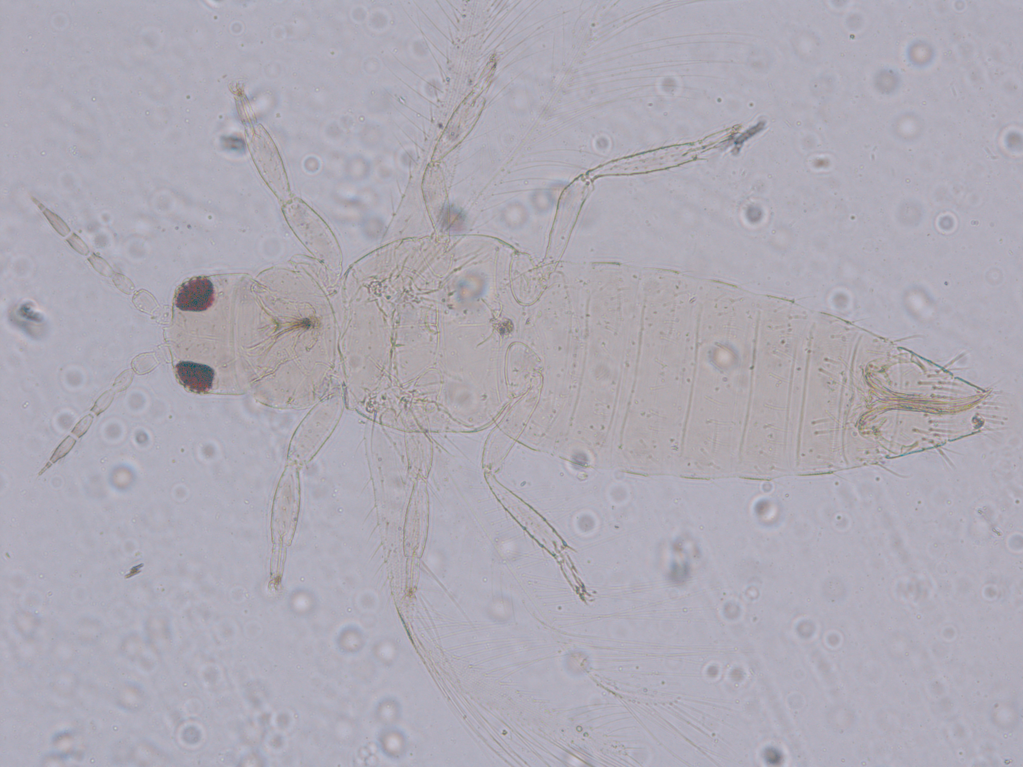 描述:雌虫:体浅黄色,复眼黑红,触角节IV-VI端部和VII-VIII浅灰色;口锥端部、各足跗节端部及产卵器较深。头略短于前胸,前单眼前外侧、单眼间及头后部有交错横线纹;复眼大占据头长的2/3;单眼呈扁三角形排列,位于复眼间略后部;前单眼鬃2对,其1对位于近复眼前内缘,另1对在前单眼前外侧;单眼间鬃位于前、后单眼中途内缘连线上;单眼和复眼后鬃约6对;触角8节,节III略短于IV和VI,节III背和IV腹面有短的叉状感觉锥,节V和VI外端、VI内侧各有简单感觉锥1个;各节近端背面和侧面有较长刚毛,节II-VI有密横排微毛;幕骨小。前胸背板密布横交错线纹于背板,但侧部有3个小的,后中部两侧有一大而横的及一小的无纹区;无长鬃;中胸背板前缘光滑,前部横纹略向前弯,后部两侧侧横线纹各自向中后延伸;前部细孔移位至两侧;前外侧对鬃不长于后中对鬃和后缘对鬃,后中对鬃位于中部,后缘对鬃向前移,接近后中对鬃;后胸背板中部纵网纹清楚,其前和两侧的纵网纹轻而模糊,网纹两侧密布纵弯线纹;前缘对鬃与前中对鬃的长度相似,均在前缘上;前翅前缘鬃22根,前脉鬃6+3,后脉鬃2根,翅瓣前缘端半部鬃4根,后基部有鬃1根,后端缘有长鬃2根;各足各节刚毛相当长但无粗刺。腹部节I-VIII背板两侧密布微毛,中部无毛区较宽,无线纹,约为有毛区宽度的一半;节VII和VIII背板后缘梳完整;细孔距微毛区较劲,中对鬃在其内后方;节IX后缘之前有6对鬃呈弧形排列;节X后部有鬃4对;股节背板和腹板前缘线几乎不可见,腹板节II-VII两侧微毛区宽度总和不及光滑区宽度;节II-VII腹板有细横纹;节II后缘鬃2对,接近后缘,节III-VIII后缘3对鬃较长,远离后缘至前中部,无附属鬃。