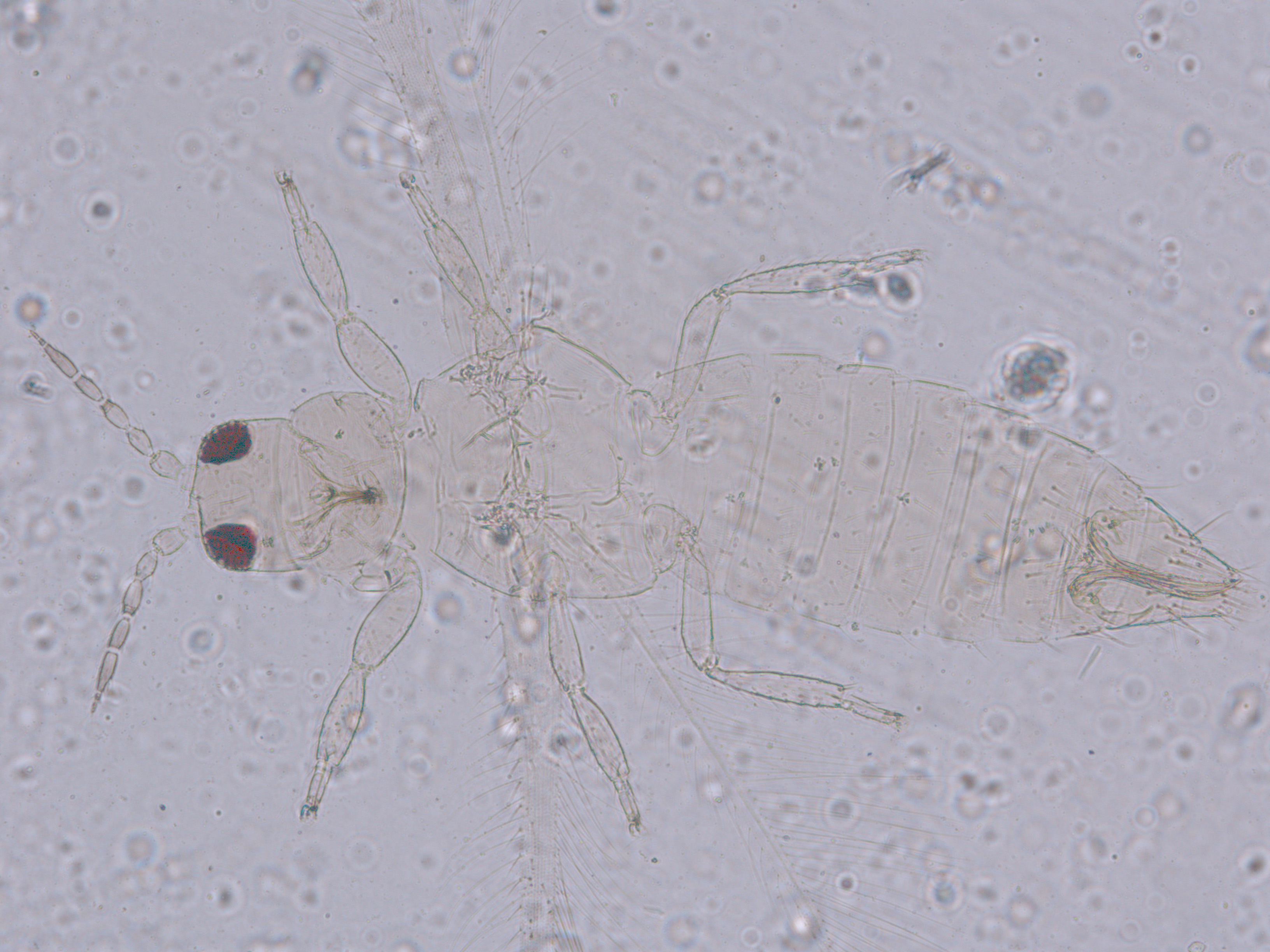 描述:雌虫:体浅黄色,复眼黑红,触角节IV-VI端部和VII-VIII浅灰色;口锥端部、各足跗节端部及产卵器较深。头略短于前胸,前单眼前外侧、单眼间及头后部有交错横线纹;复眼大占据头长的2/3;单眼呈扁三角形排列,位于复眼间略后部;前单眼鬃2对,其1对位于近复眼前内缘,另1对在前单眼前外侧;单眼间鬃位于前、后单眼中途内缘连线上;单眼和复眼后鬃约6对;触角8节,节III略短于IV和VI,节III背和IV腹面有短的叉状感觉锥,节V和VI外端、VI内侧各有简单感觉锥1个;各节近端背面和侧面有较长刚毛,节II-VI有密横排微毛;幕骨小。前胸背板密布横交错线纹于背板,但侧部有3个小的,后中部两侧有一大而横的及一小的无纹区;无长鬃;中胸背板前缘光滑,前部横纹略向前弯,后部两侧侧横线纹各自向中后延伸;前部细孔移位至两侧;前外侧对鬃不长于后中对鬃和后缘对鬃,后中对鬃位于中部,后缘对鬃向前移,接近后中对鬃;后胸背板中部纵网纹清楚,其前和两侧的纵网纹轻而模糊,网纹两侧密布纵弯线纹;前缘对鬃与前中对鬃的长度相似,均在前缘上;前翅前缘鬃22根,前脉鬃6+3,后脉鬃2根,翅瓣前缘端半部鬃4根,后基部有鬃1根,后端缘有长鬃2根;各足各节刚毛相当长但无粗刺。腹部节I-VIII背板两侧密布微毛,中部无毛区较宽,无线纹,约为有毛区宽度的一半;节VII和VIII背板后缘梳完整;细孔距微毛区较劲,中对鬃在其内后方;节IX后缘之前有6对鬃呈弧形排列;节X后部有鬃4对;股节背板和腹板前缘线几乎不可见,腹板节II-VII两侧微毛区宽度总和不及光滑区宽度;节II-VII腹板有细横纹;节II后缘鬃2对,接近后缘,节III-VIII后缘3对鬃较长,远离后缘至前中部,无附属鬃。