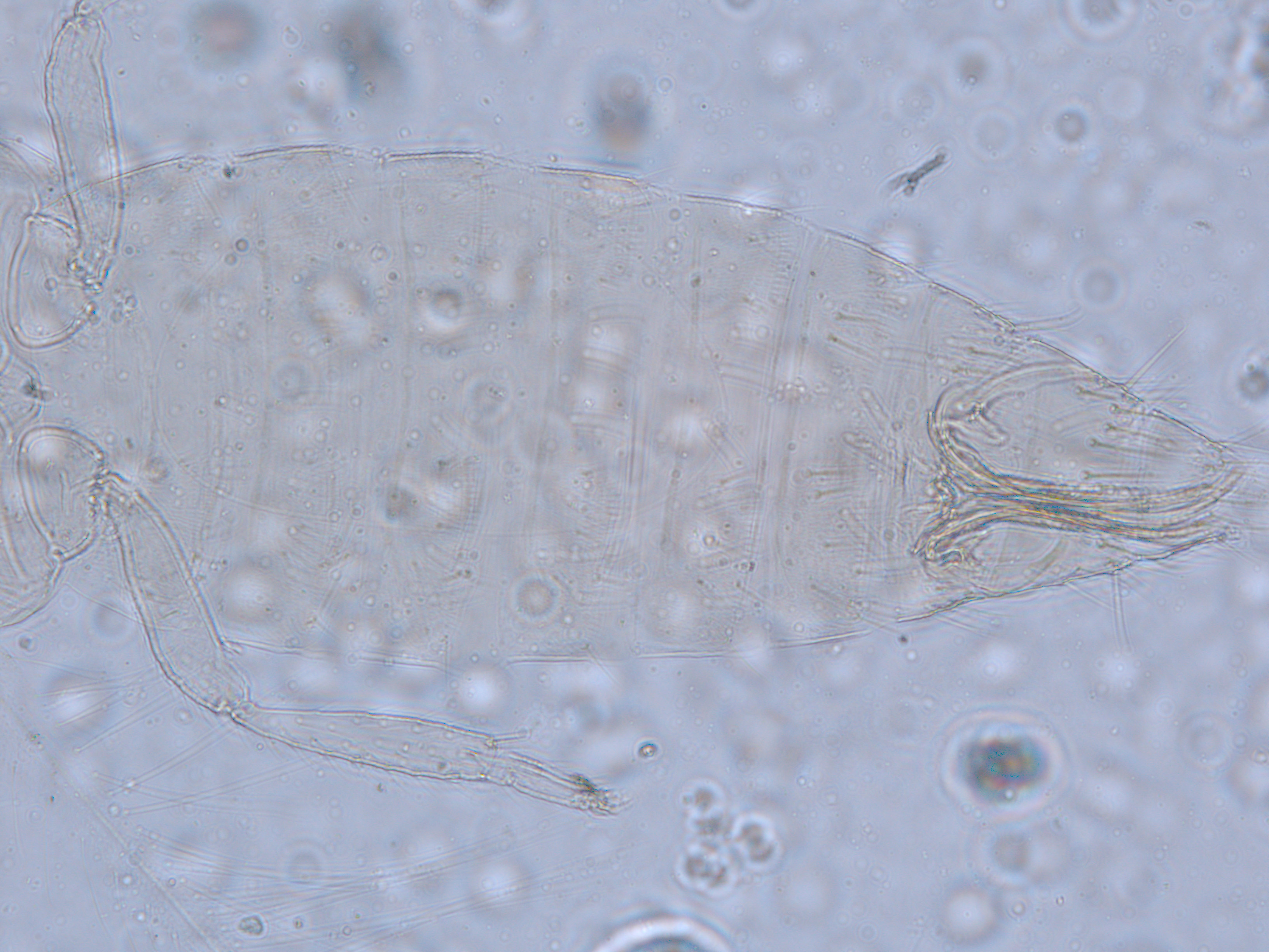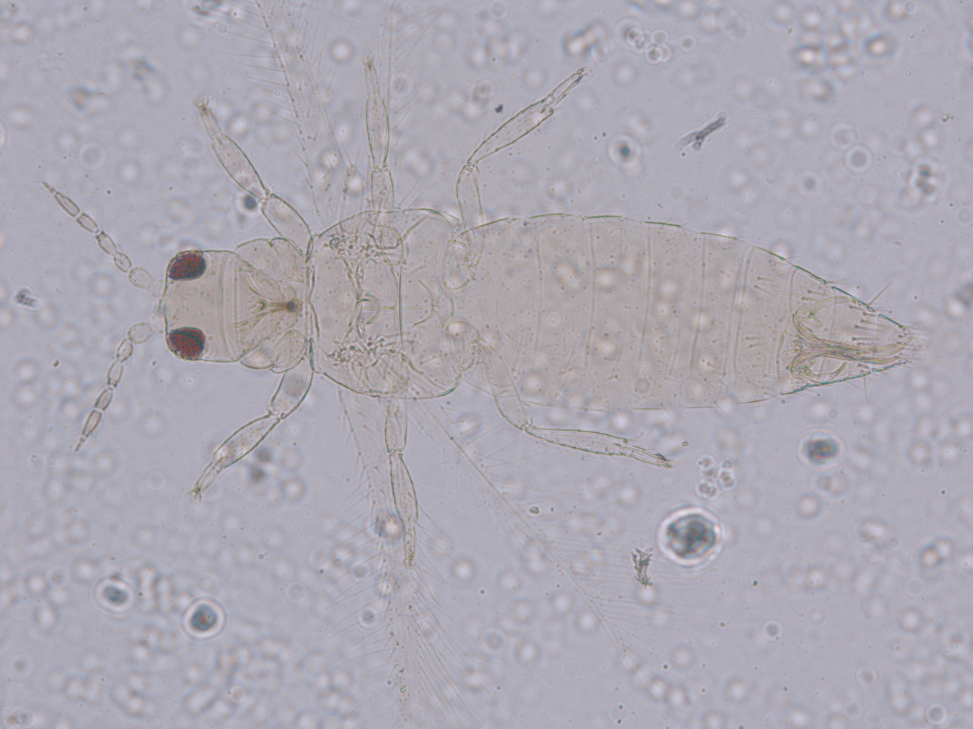 描述:雌虫:体浅黄色,复眼黑红,触角节IV-VI端部和VII-VIII浅灰色;口锥端部、各足跗节端部及产卵器较深。头略短于前胸,前单眼前外侧、单眼间及头后部有交错横线纹;复眼大占据头长的2/3;单眼呈扁三角形排列,位于复眼间略后部;前单眼鬃2对,其1对位于近复眼前内缘,另1对在前单眼前外侧;单眼间鬃位于前、后单眼中途内缘连线上;单眼和复眼后鬃约6对;触角8节,节III略短于IV和VI,节III背和IV腹面有短的叉状感觉锥,节V和VI外端、VI内侧各有简单感觉锥1个;各节近端背面和侧面有较长刚毛,节II-VI有密横排微毛;幕骨小。前胸背板密布横交错线纹于背板,但侧部有3个小的,后中部两侧有一大而横的及一小的无纹区;无长鬃;中胸背板前缘光滑,前部横纹略向前弯,后部两侧侧横线纹各自向中后延伸;前部细孔移位至两侧;前外侧对鬃不长于后中对鬃和后缘对鬃,后中对鬃位于中部,后缘对鬃向前移,接近后中对鬃;后胸背板中部纵网纹清楚,其前和两侧的纵网纹轻而模糊,网纹两侧密布纵弯线纹;前缘对鬃与前中对鬃的长度相似,均在前缘上;前翅前缘鬃22根,前脉鬃6+3,后脉鬃2根,翅瓣前缘端半部鬃4根,后基部有鬃1根,后端缘有长鬃2根;各足各节刚毛相当长但无粗刺。腹部节I-VIII背板两侧密布微毛,中部无毛区较宽,无线纹,约为有毛区宽度的一半;节VII和VIII背板后缘梳完整;细孔距微毛区较劲,中对鬃在其内后方;节IX后缘之前有6对鬃呈弧形排列;节X后部有鬃4对;股节背板和腹板前缘线几乎不可见,腹板节II-VII两侧微毛区宽度总和不及光滑区宽度;节II-VII腹板有细横纹;节II后缘鬃2对,接近后缘,节III-VIII后缘3对鬃较长,远离后缘至前中部,无附属鬃。