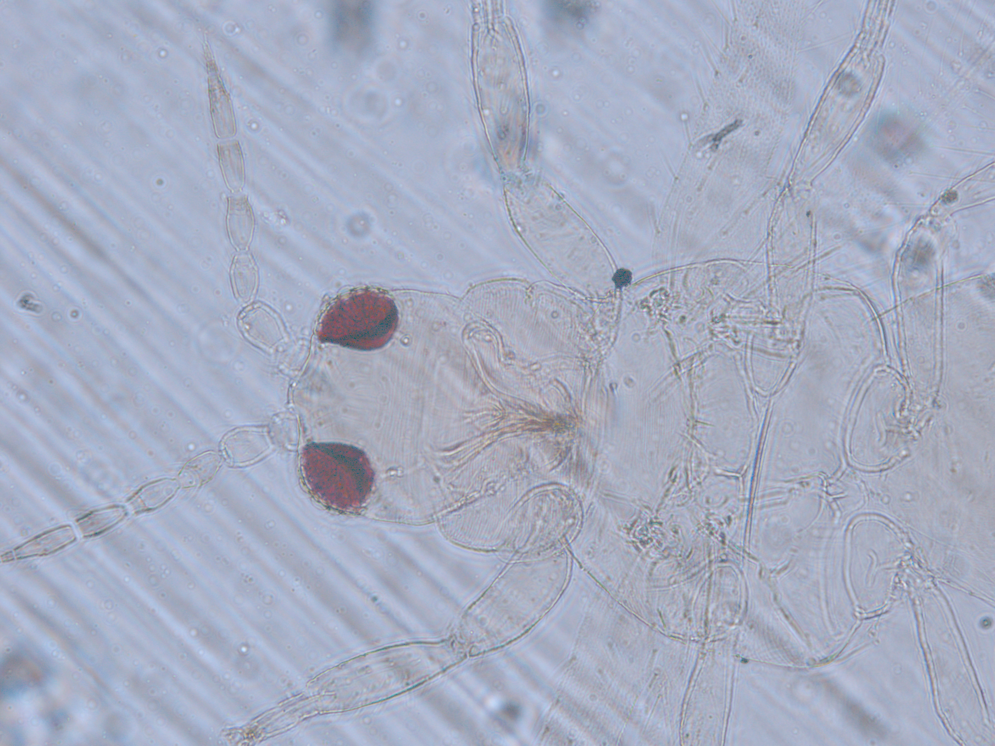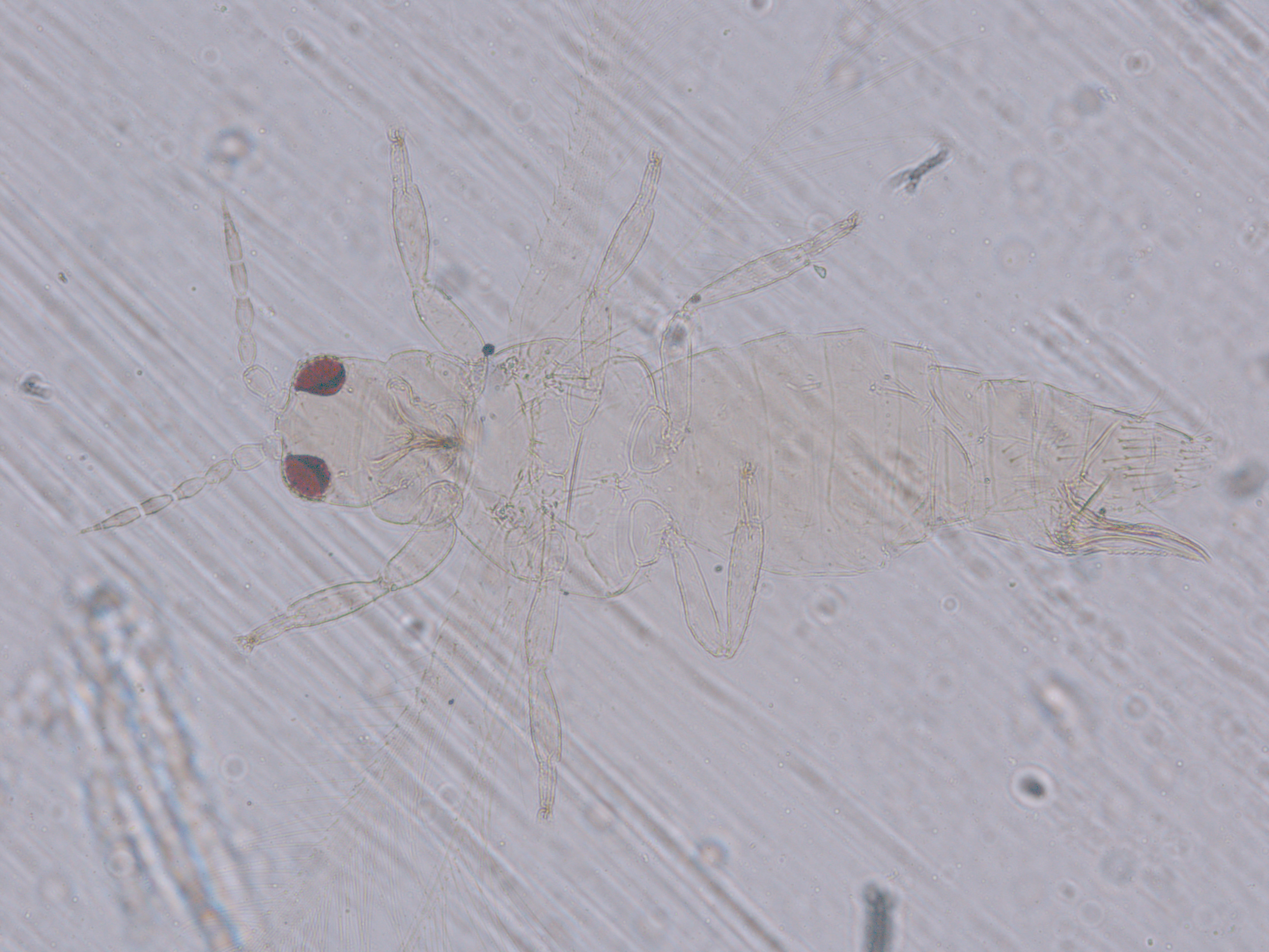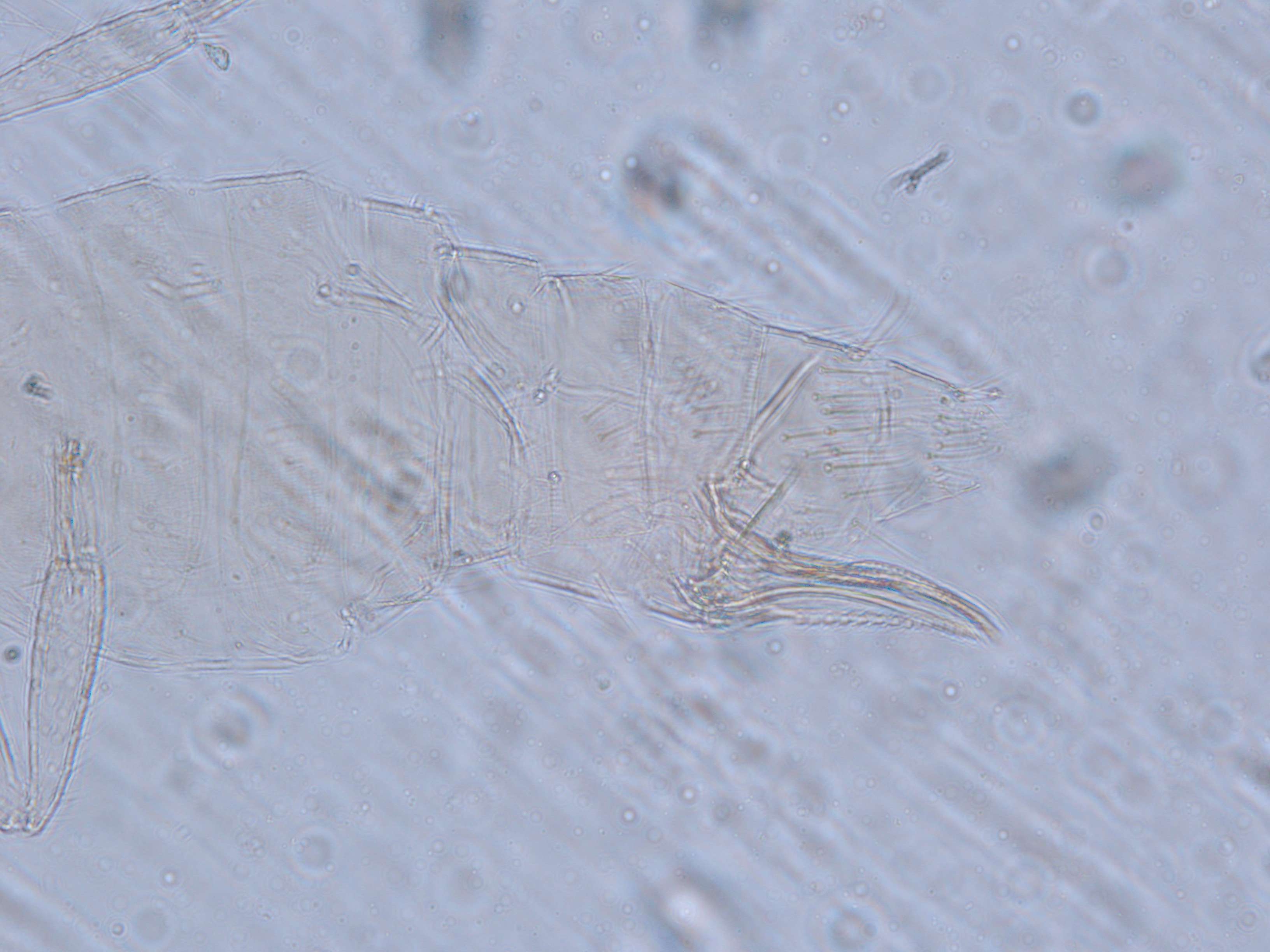 描述:雌虫:体浅黄色,复眼黑红,触角节IV-VI端部和VII-VIII浅灰色;口锥端部、各足跗节端部及产卵器较深。头略短于前胸,前单眼前外侧、单眼间及头后部有交错横线纹;复眼大占据头长的2/3;单眼呈扁三角形排列,位于复眼间略后部;前单眼鬃2对,其1对位于近复眼前内缘,另1对在前单眼前外侧;单眼间鬃位于前、后单眼中途内缘连线上;单眼和复眼后鬃约6对;触角8节,节III略短于IV和VI,节III背和IV腹面有短的叉状感觉锥,节V和VI外端、VI内侧各有简单感觉锥1个;各节近端背面和侧面有较长刚毛,节II-VI有密横排微毛;幕骨小。前胸背板密布横交错线纹于背板,但侧部有3个小的,后中部两侧有一大而横的及一小的无纹区;无长鬃;中胸背板前缘光滑,前部横纹略向前弯,后部两侧侧横线纹各自向中后延伸;前部细孔移位至两侧;前外侧对鬃不长于后中对鬃和后缘对鬃,后中对鬃位于中部,后缘对鬃向前移,接近后中对鬃;后胸背板中部纵网纹清楚,其前和两侧的纵网纹轻而模糊,网纹两侧密布纵弯线纹;前缘对鬃与前中对鬃的长度相似,均在前缘上;前翅前缘鬃22根,前脉鬃6+3,后脉鬃2根,翅瓣前缘端半部鬃4根,后基部有鬃1根,后端缘有长鬃2根;各足各节刚毛相当长但无粗刺。腹部节I-VIII背板两侧密布微毛,中部无毛区较宽,无线纹,约为有毛区宽度的一半;节VII和VIII背板后缘梳完整;细孔距微毛区较劲,中对鬃在其内后方;节IX后缘之前有6对鬃呈弧形排列;节X后部有鬃4对;股节背板和腹板前缘线几乎不可见,腹板节II-VII两侧微毛区宽度总和不及光滑区宽度;节II-VII腹板有细横纹;节II后缘鬃2对,接近后缘,节III-VIII后缘3对鬃较长,远离后缘至前中部,无附属鬃。