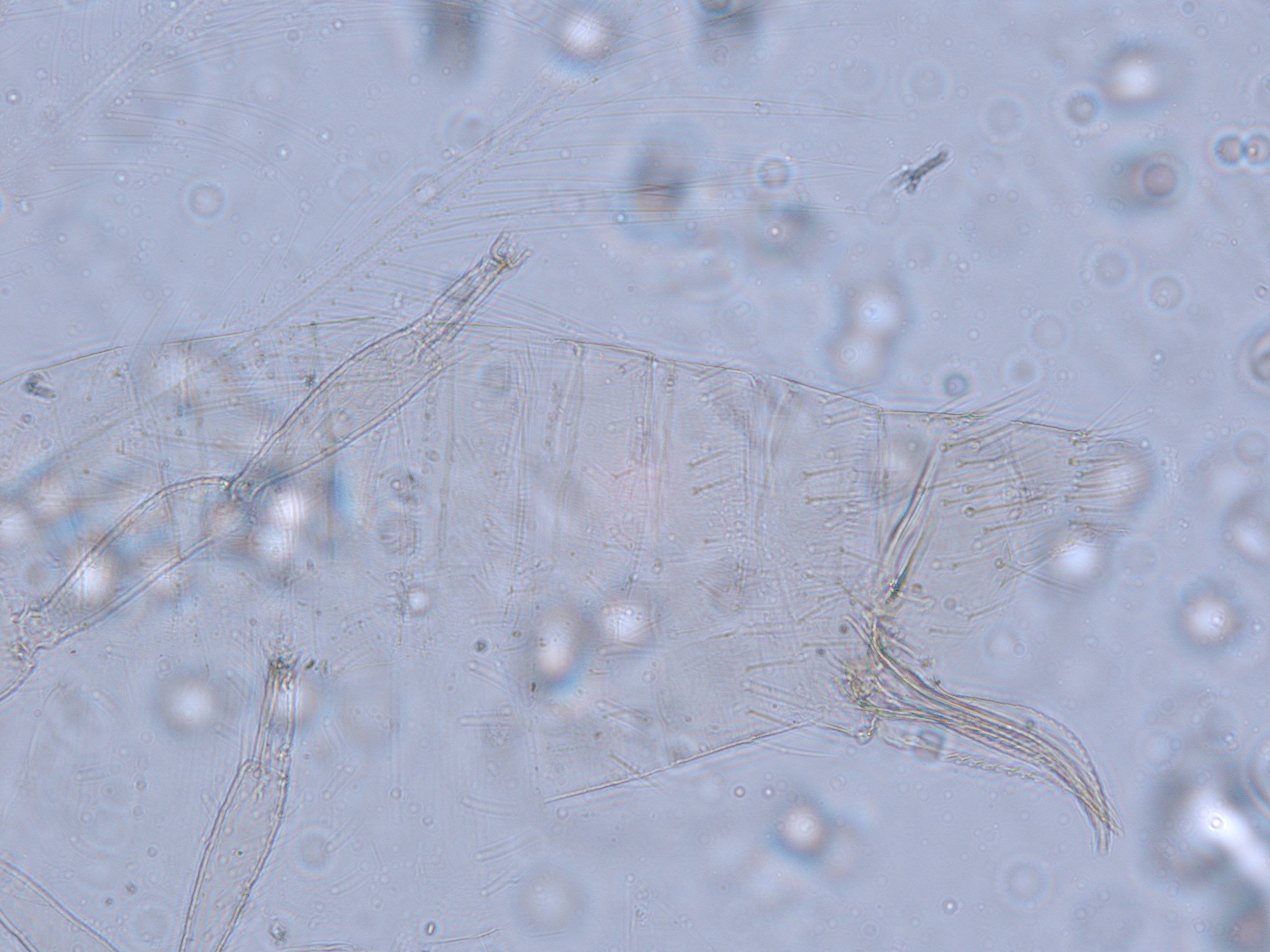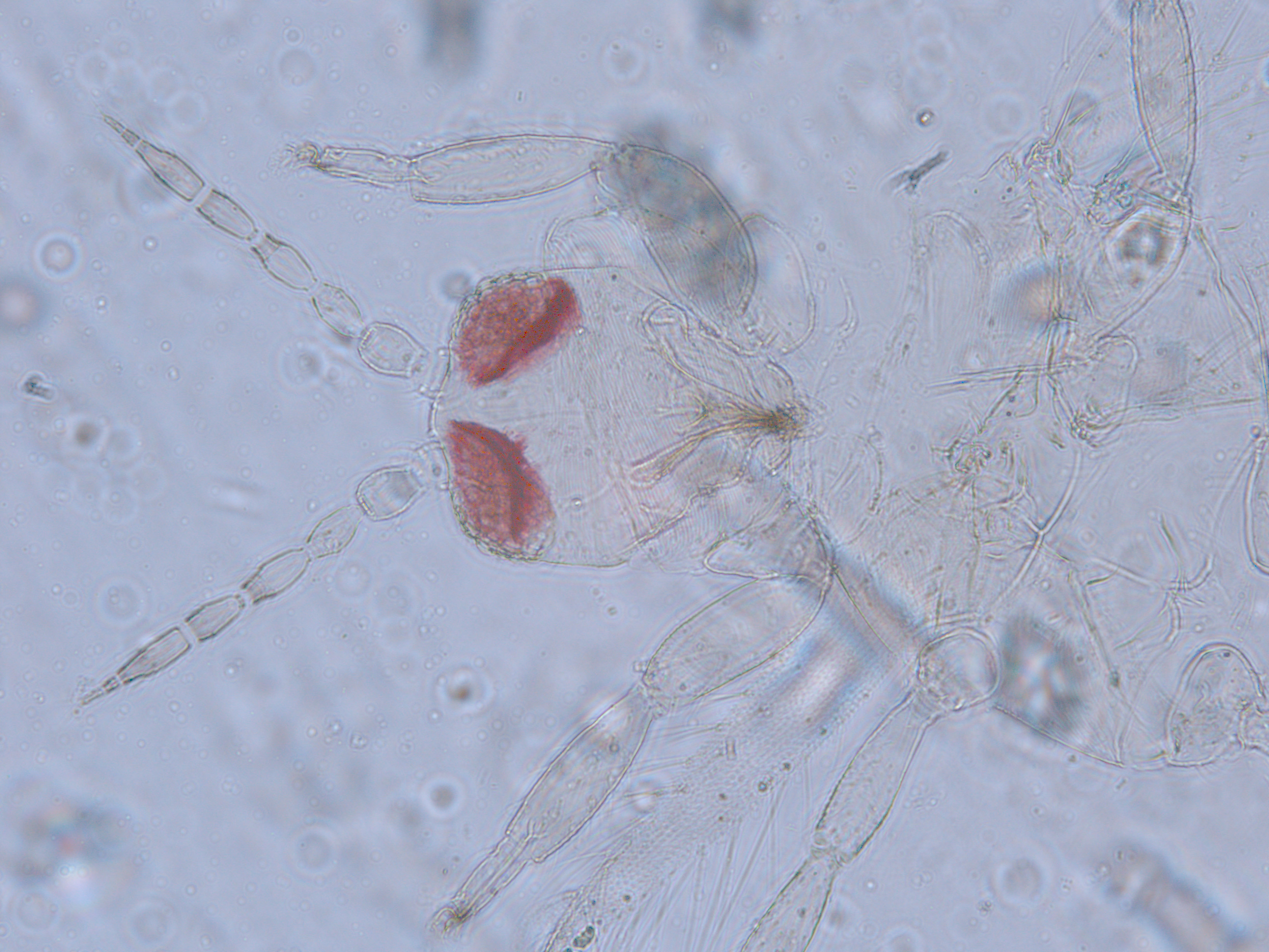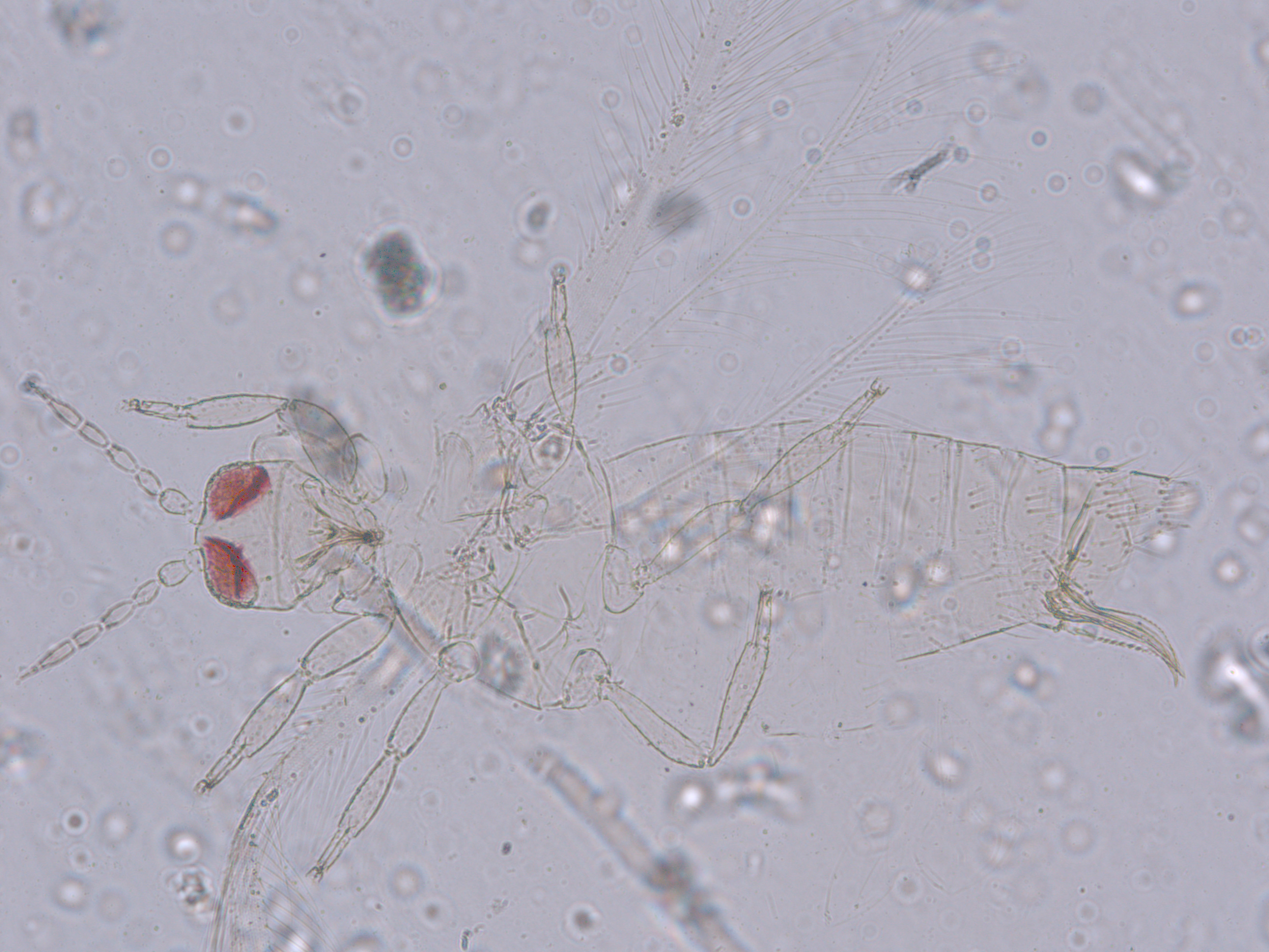 描述:雌虫:体浅黄色,复眼黑红,触角节IV-VI端部和VII-VIII浅灰色;口锥端部、各足跗节端部及产卵器较深。头略短于前胸,前单眼前外侧、单眼间及头后部有交错横线纹;复眼大占据头长的2/3;单眼呈扁三角形排列,位于复眼间略后部;前单眼鬃2对,其1对位于近复眼前内缘,另1对在前单眼前外侧;单眼间鬃位于前、后单眼中途内缘连线上;单眼和复眼后鬃约6对;触角8节,节III略短于IV和VI,节III背和IV腹面有短的叉状感觉锥,节V和VI外端、VI内侧各有简单感觉锥1个;各节近端背面和侧面有较长刚毛,节II-VI有密横排微毛;幕骨小。前胸背板密布横交错线纹于背板,但侧部有3个小的,后中部两侧有一大而横的及一小的无纹区;无长鬃;中胸背板前缘光滑,前部横纹略向前弯,后部两侧侧横线纹各自向中后延伸;前部细孔移位至两侧;前外侧对鬃不长于后中对鬃和后缘对鬃,后中对鬃位于中部,后缘对鬃向前移,接近后中对鬃;后胸背板中部纵网纹清楚,其前和两侧的纵网纹轻而模糊,网纹两侧密布纵弯线纹;前缘对鬃与前中对鬃的长度相似,均在前缘上;前翅前缘鬃22根,前脉鬃6+3,后脉鬃2根,翅瓣前缘端半部鬃4根,后基部有鬃1根,后端缘有长鬃2根;各足各节刚毛相当长但无粗刺。腹部节I-VIII背板两侧密布微毛,中部无毛区较宽,无线纹,约为有毛区宽度的一半;节VII和VIII背板后缘梳完整;细孔距微毛区较劲,中对鬃在其内后方;节IX后缘之前有6对鬃呈弧形排列;节X后部有鬃4对;股节背板和腹板前缘线几乎不可见,腹板节II-VII两侧微毛区宽度总和不及光滑区宽度;节II-VII腹板有细横纹;节II后缘鬃2对,接近后缘,节III-VIII后缘3对鬃较长,远离后缘至前中部,无附属鬃。