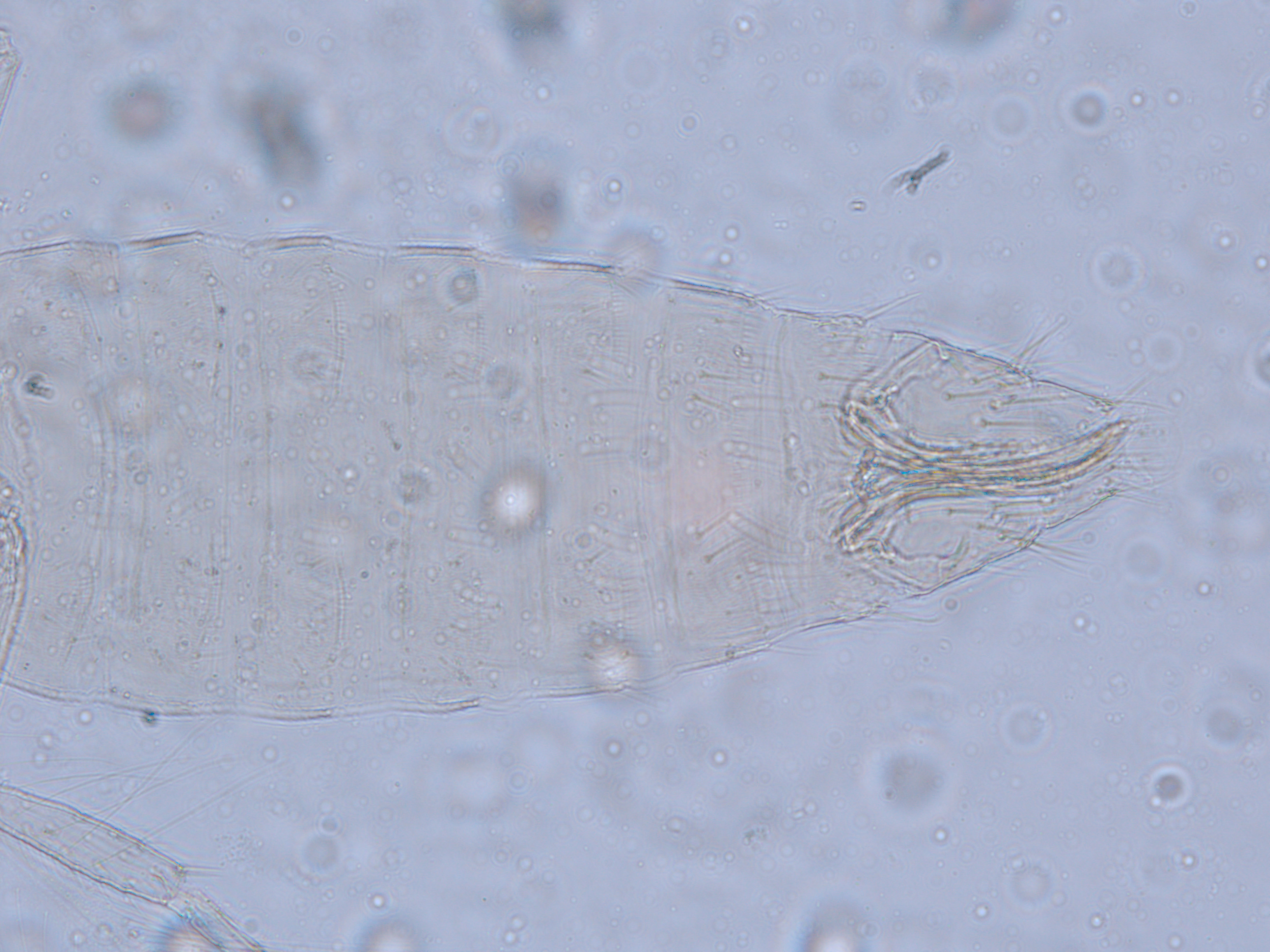 描述:雌虫:体浅黄色,复眼黑红,触角节IV-VI端部和VII-VIII浅灰色;口锥端部、各足跗节端部及产卵器较深。头略短于前胸,前单眼前外侧、单眼间及头后部有交错横线纹;复眼大占据头长的2/3;单眼呈扁三角形排列,位于复眼间略后部;前单眼鬃2对,其1对位于近复眼前内缘,另1对在前单眼前外侧;单眼间鬃位于前、后单眼中途内缘连线上;单眼和复眼后鬃约6对;触角8节,节III略短于IV和VI,节III背和IV腹面有短的叉状感觉锥,节V和VI外端、VI内侧各有简单感觉锥1个;各节近端背面和侧面有较长刚毛,节II-VI有密横排微毛;幕骨小。前胸背板密布横交错线纹于背板,但侧部有3个小的,后中部两侧有一大而横的及一小的无纹区;无长鬃;中胸背板前缘光滑,前部横纹略向前弯,后部两侧侧横线纹各自向中后延伸;前部细孔移位至两侧;前外侧对鬃不长于后中对鬃和后缘对鬃,后中对鬃位于中部,后缘对鬃向前移,接近后中对鬃;后胸背板中部纵网纹清楚,其前和两侧的纵网纹轻而模糊,网纹两侧密布纵弯线纹;前缘对鬃与前中对鬃的长度相似,均在前缘上;前翅前缘鬃22根,前脉鬃6+3,后脉鬃2根,翅瓣前缘端半部鬃4根,后基部有鬃1根,后端缘有长鬃2根;各足各节刚毛相当长但无粗刺。腹部节I-VIII背板两侧密布微毛,中部无毛区较宽,无线纹,约为有毛区宽度的一半;节VII和VIII背板后缘梳完整;细孔距微毛区较劲,中对鬃在其内后方;节IX后缘之前有6对鬃呈弧形排列;节X后部有鬃4对;股节背板和腹板前缘线几乎不可见,腹板节II-VII两侧微毛区宽度总和不及光滑区宽度;节II-VII腹板有细横纹;节II后缘鬃2对,接近后缘,节III-VIII后缘3对鬃较长,远离后缘至前中部,无附属鬃。